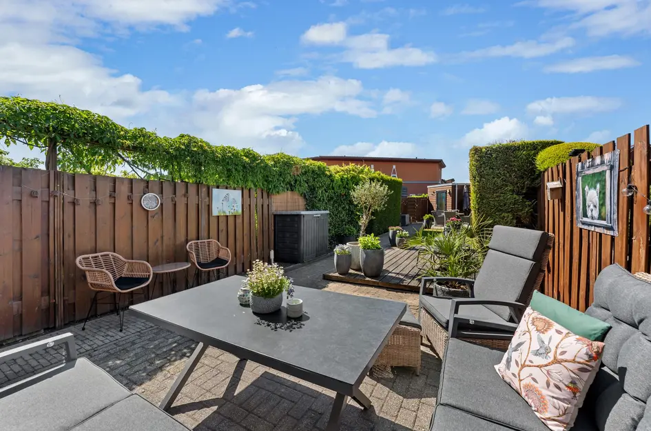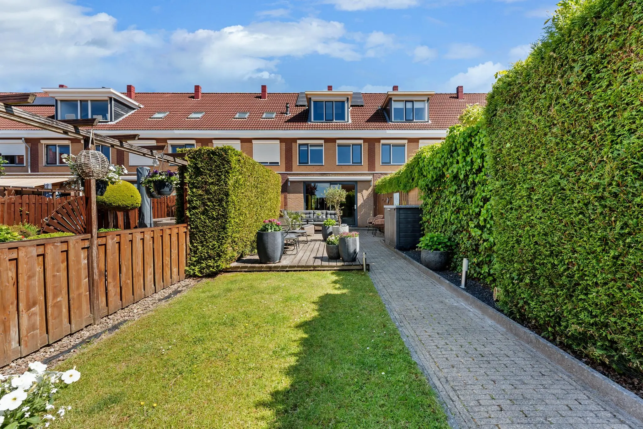 De achtertuin nodigt echt uit om buiten te zijn en heeft een diepte van maar liefst 24 meter. Gezien de afmeting is er altijd wel een plekje in de zon of schaduw te vinden. Het geheel is verzorgd aangelegd met zorg onderhouden. Achter in de tuin staat een houten berging. Uiteraard is er een achterom aanwezig.