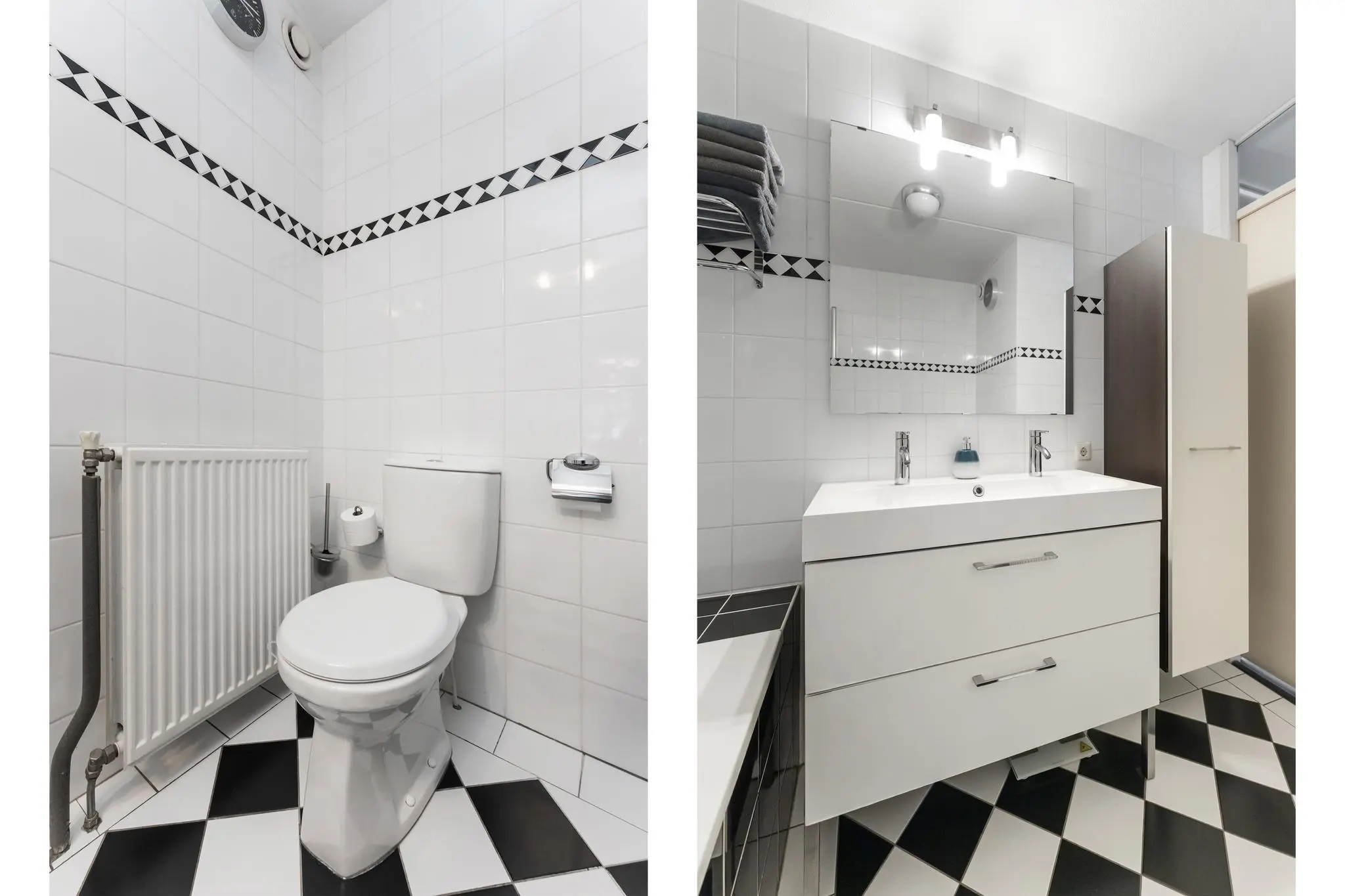 Verzorgde en neutraal uitgevoerde badkamer, geheel betegeld en ingericht met een douche/ligbad met glazen douchewand, een wastafelmeubel en een tweede toilet.