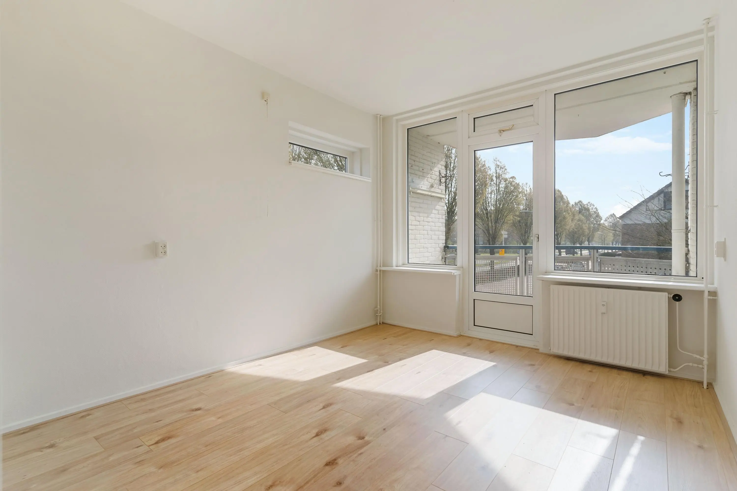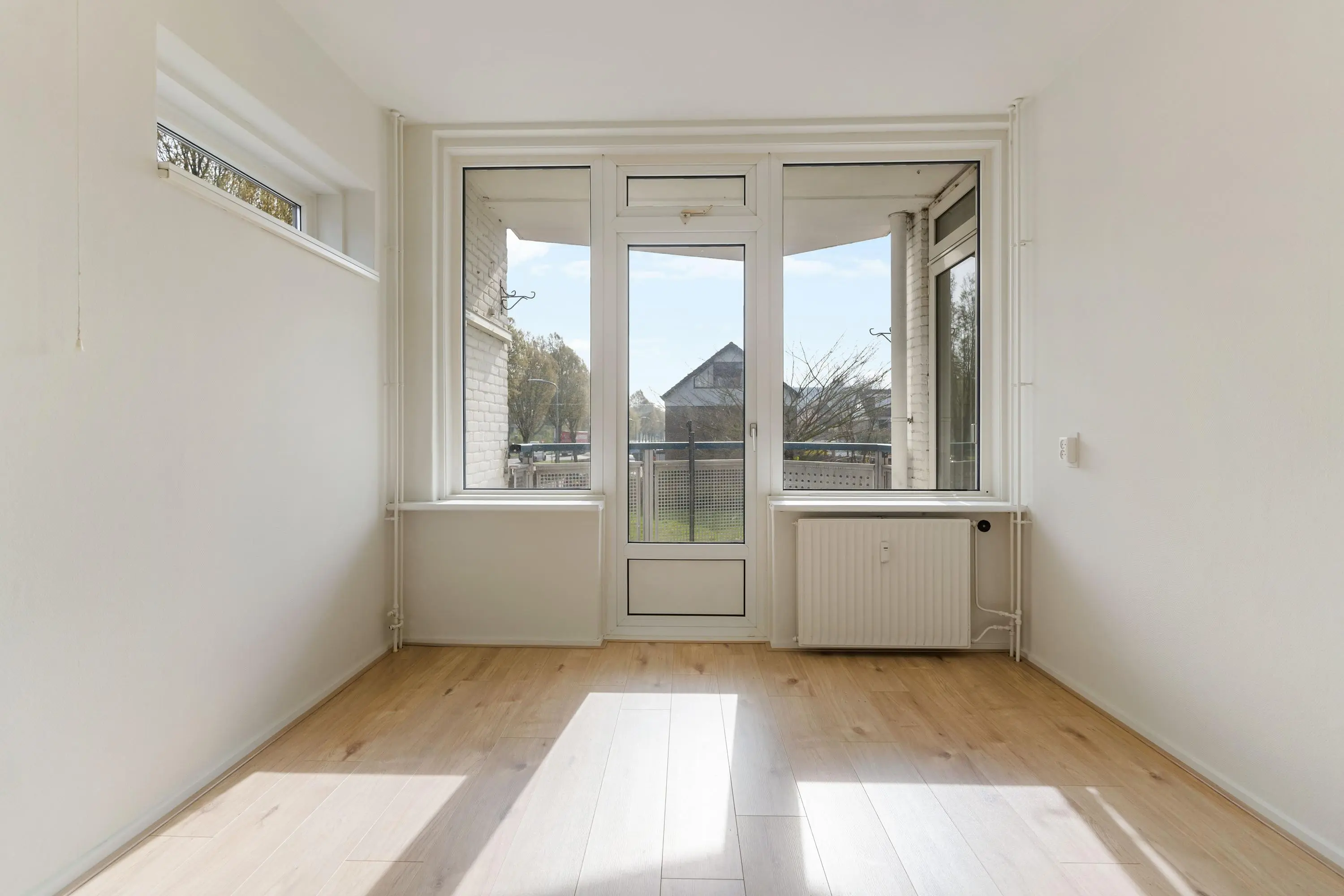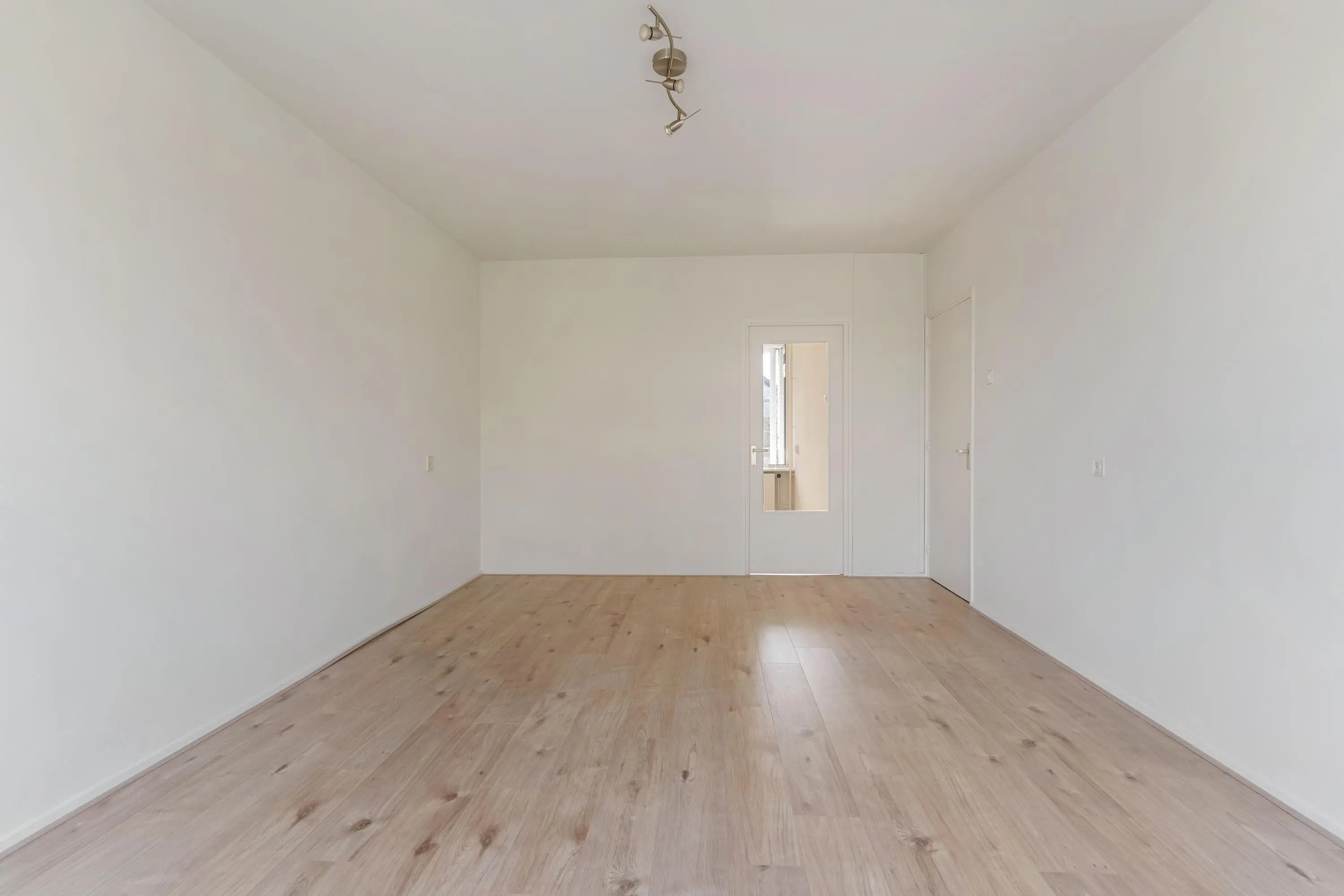 Afm. 5,68 x 3,59 m. Lichte en fijne woonkamer met een grote raampartij aan de voorzijde en vrij uitzicht over de omgeving. Via een loopdeur is de achtergelegen slaapkamer bereikbaar.
