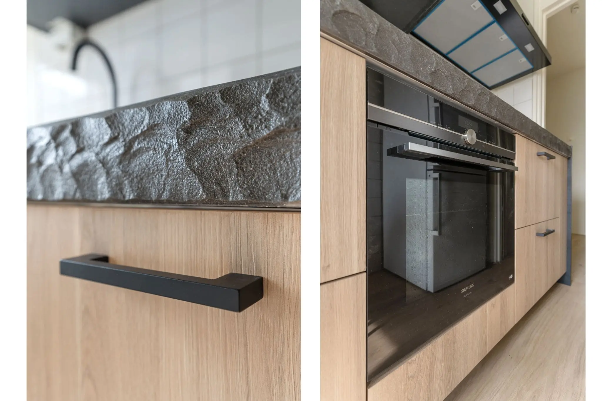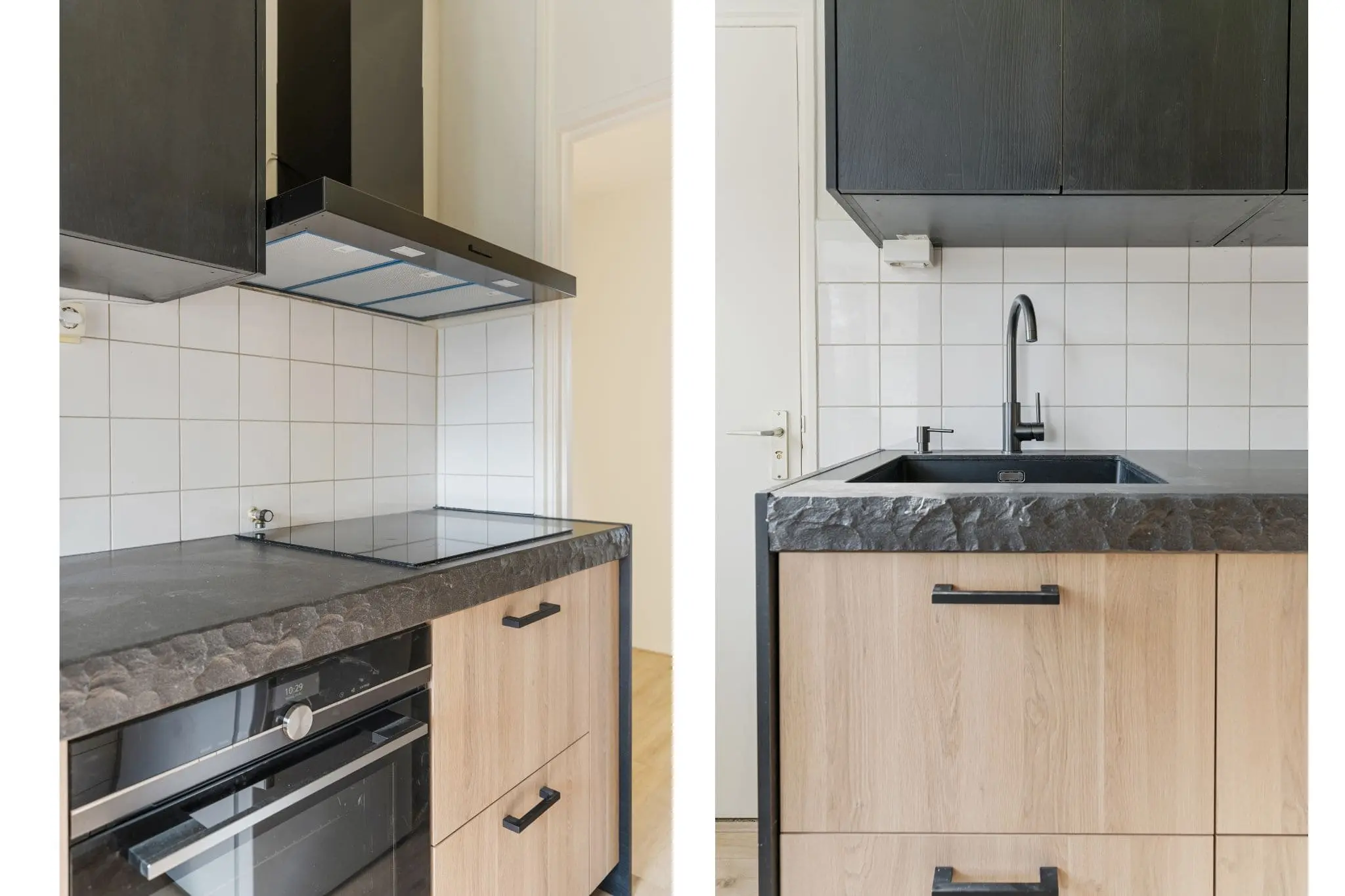 Afm. ca. 3,54 x 1,82 m. Gelegen aan de achterzijde en in 2026 vernieuwd met een moderne opstelling en een contrasterend werkblad. Voorzien van diverse kasten, laden en inbouwapparatuur (inductiekookplaat, afzuigkap en oven). Daarnaast is er een losse koel-vriescombinatie aanwezig die achterblijft.
