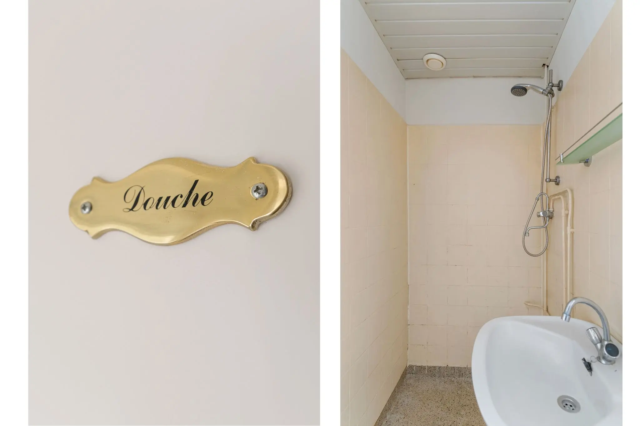 Afm. ca. 2,23 x 1,07 m. Vanuit de keuken bereikbaar en voorzien van een douche en wastafel.