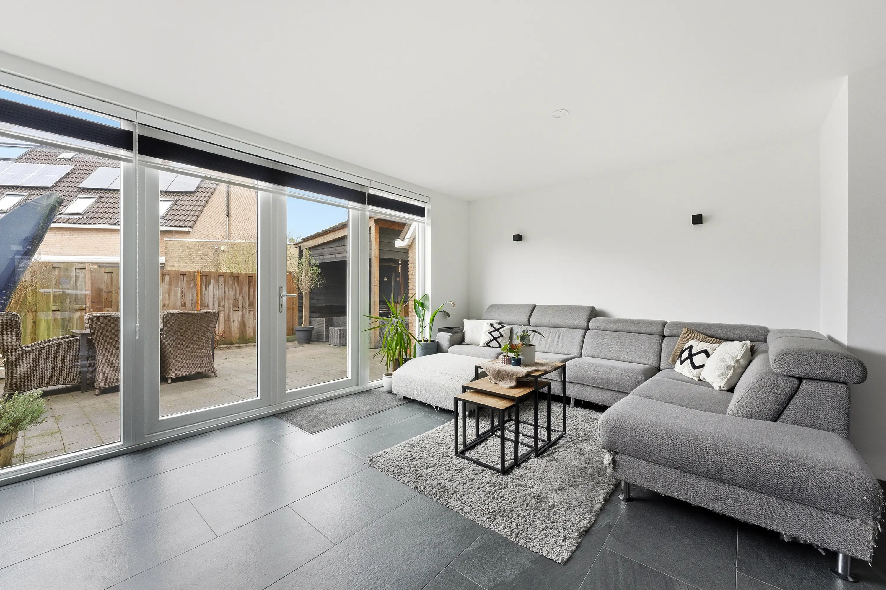 De woonkamer is ruim en licht dankzij de grote raampartijen in de achtergevel. Een praktische trapkast biedt extra bergruimte. Via de hoge openslaande deuren is er directe toegang tot de achtertuin. De open verbinding met de keuken zorgt voor een prettig en ruimtelijk geheel.