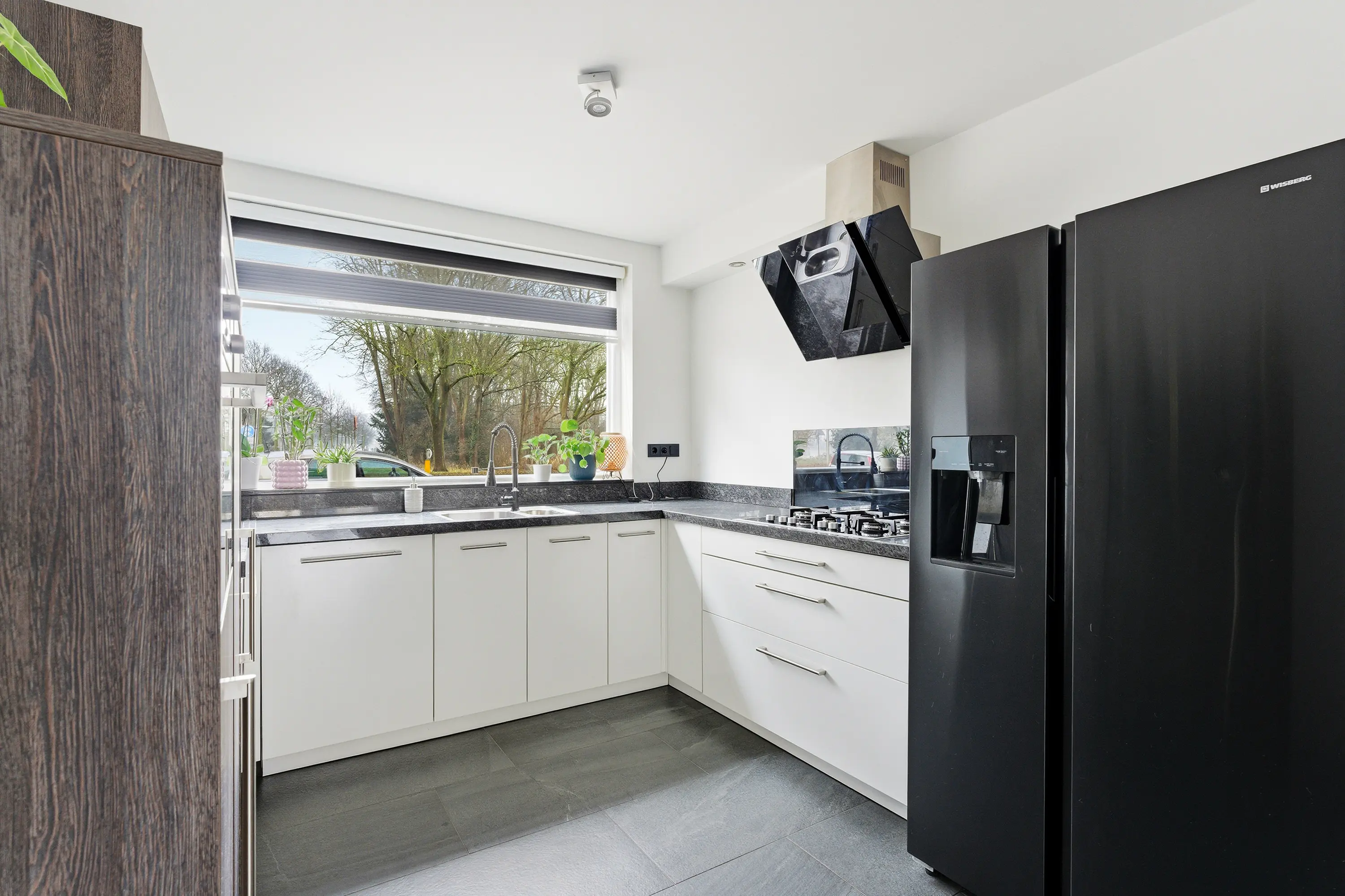 De keuken is gelegen aan de voorzijde van de woning en uitgevoerd in een moderne U-opstelling met veel kastruimte, laden en diverse inbouwapparatuur. Vanuit de keuken geniet u van een fraai uitzicht op park De Hoge Devel.