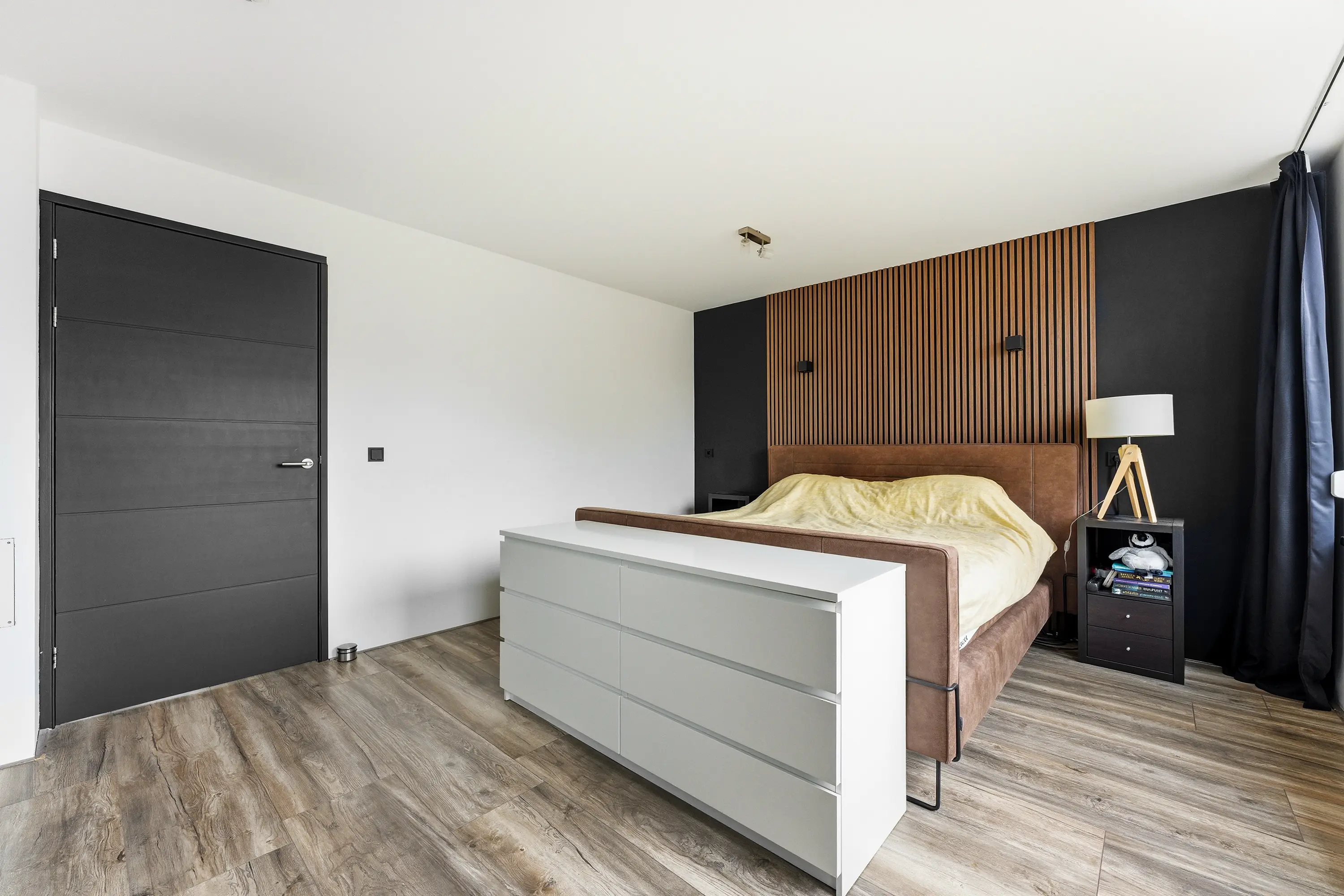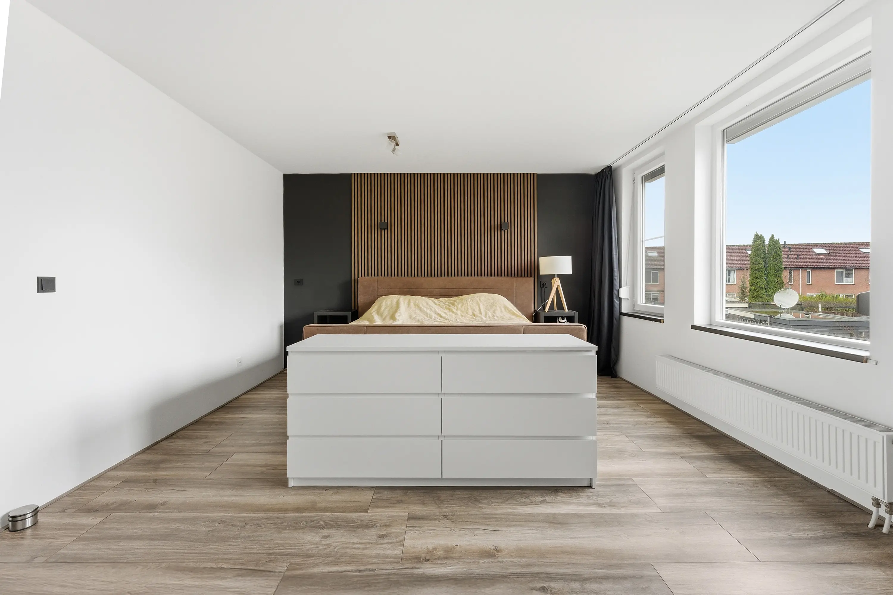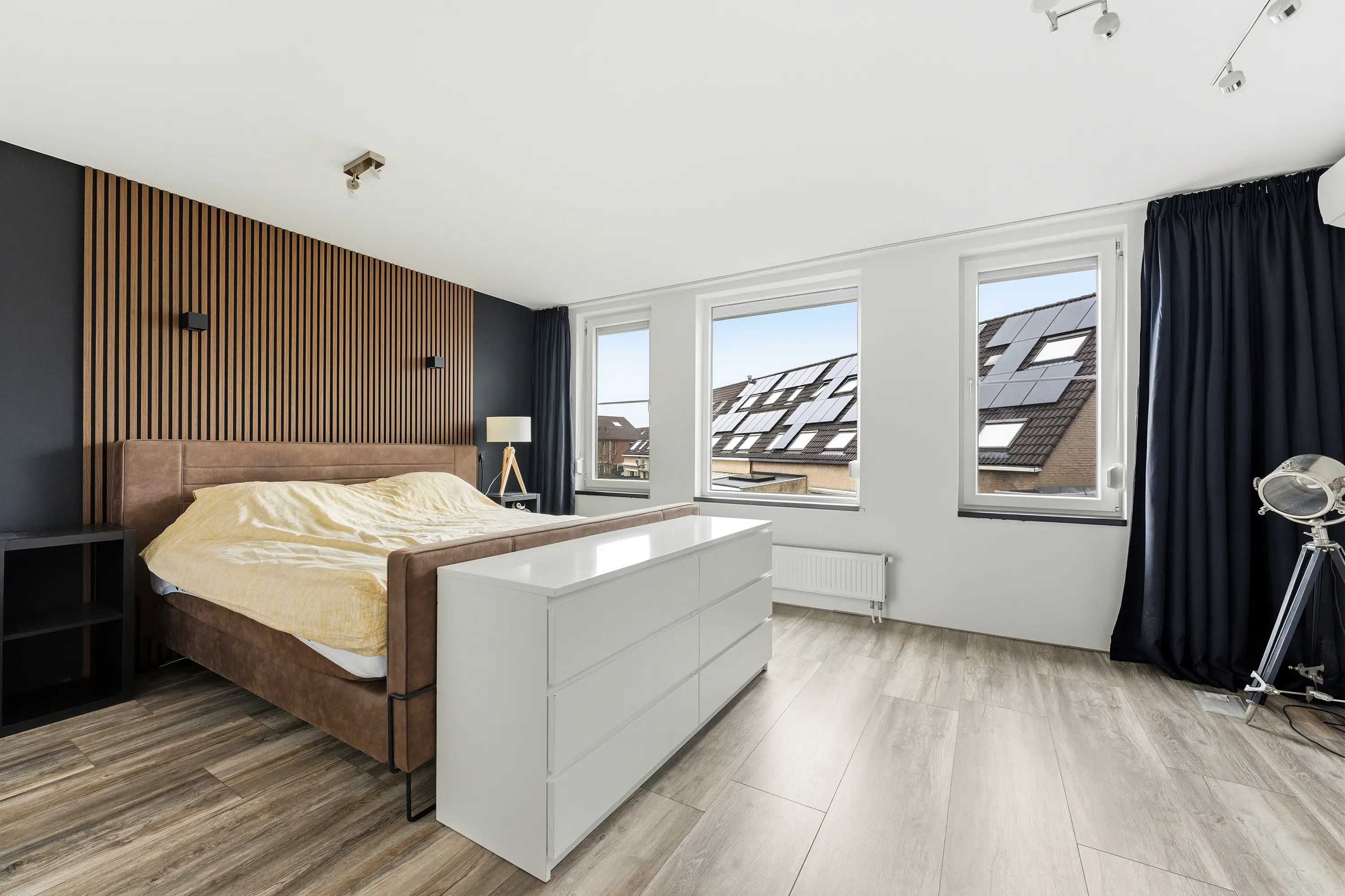 Deze slaapkamer is ontstaan door het samenvoegen van twee voormalige slaapkamers en biedt daardoor extra ruimte. De kamer is voorzien van rolluiken en airconditioning. Vanuit deze slaapkamer is de ruime inloopkast bereikbaar, gelegen boven de garage. Deze ruimte is dankzij de royale afmetingen ook uitstekend geschikt als kinder-, werk- of hobbykamer.