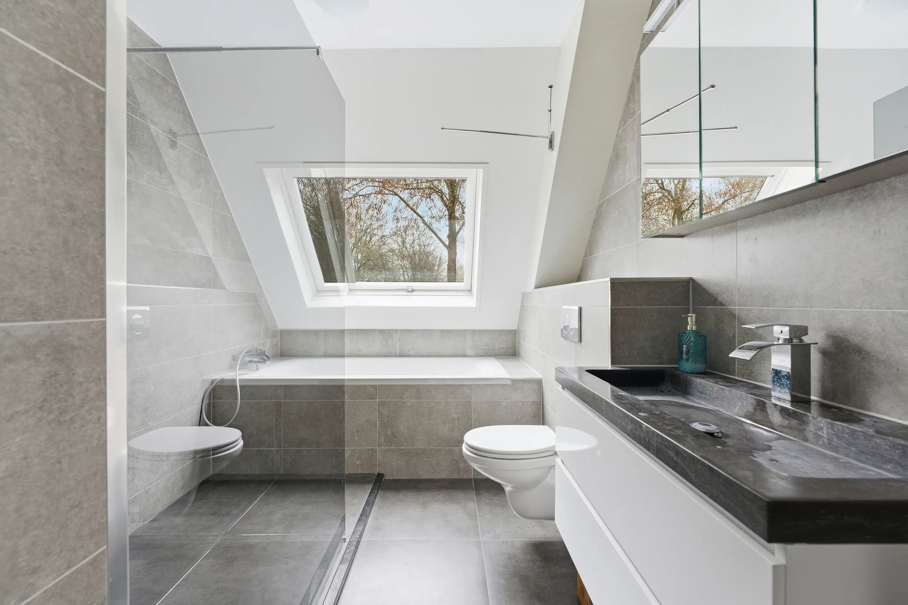 De luxe badkamer is slim ingedeeld en volledig betegeld met hoogwaardige wand- en vloertegels. De badkamer beschikt over een ligbad, een inloopdouche met glazen douchewand, een wastafelmeubel en een wandcloset.