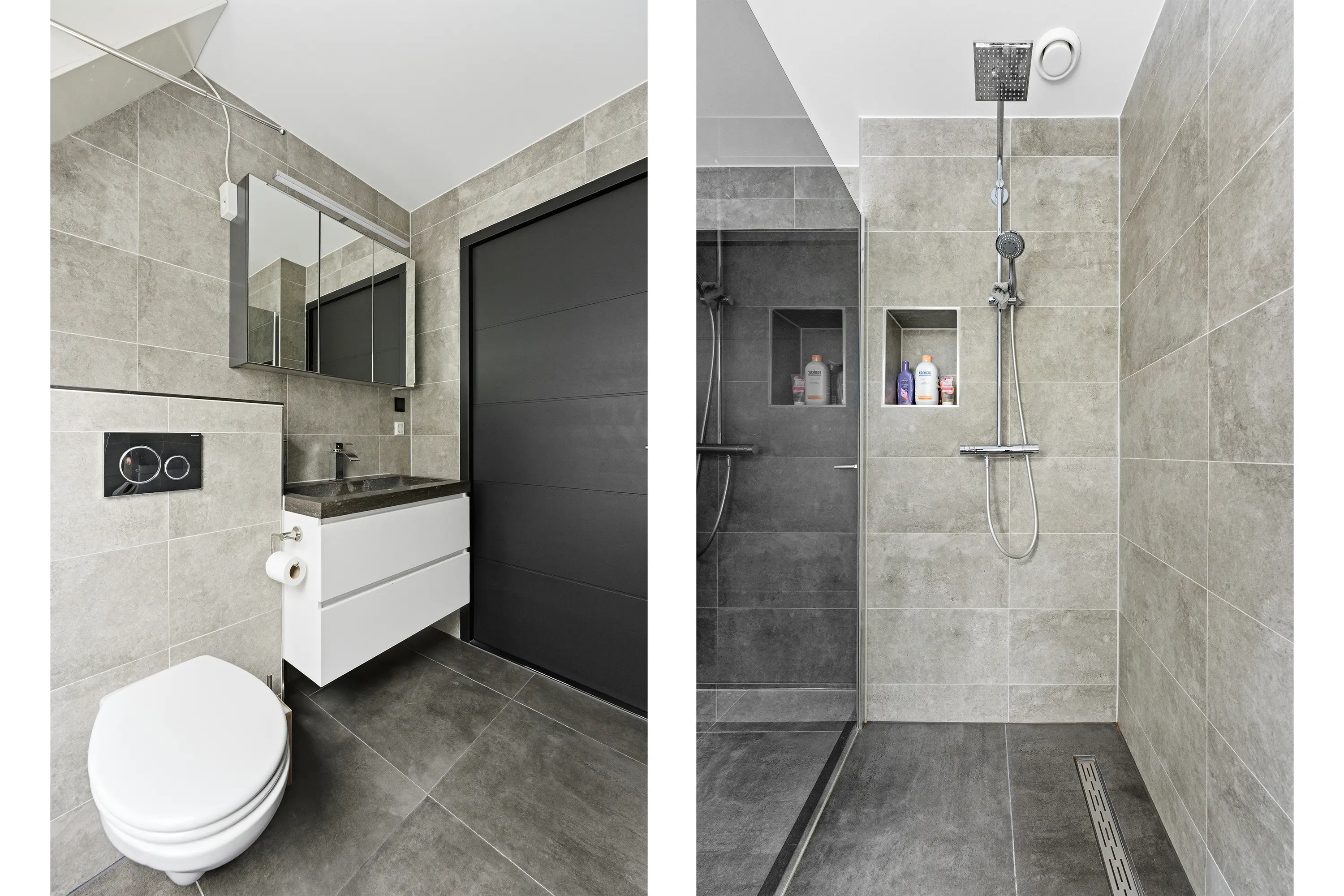 De toiletruimte is modern en stijlvol afgewerkt met eigentijdse wand- en vloertegels en voorzien van een wandcloset en fonteintje.