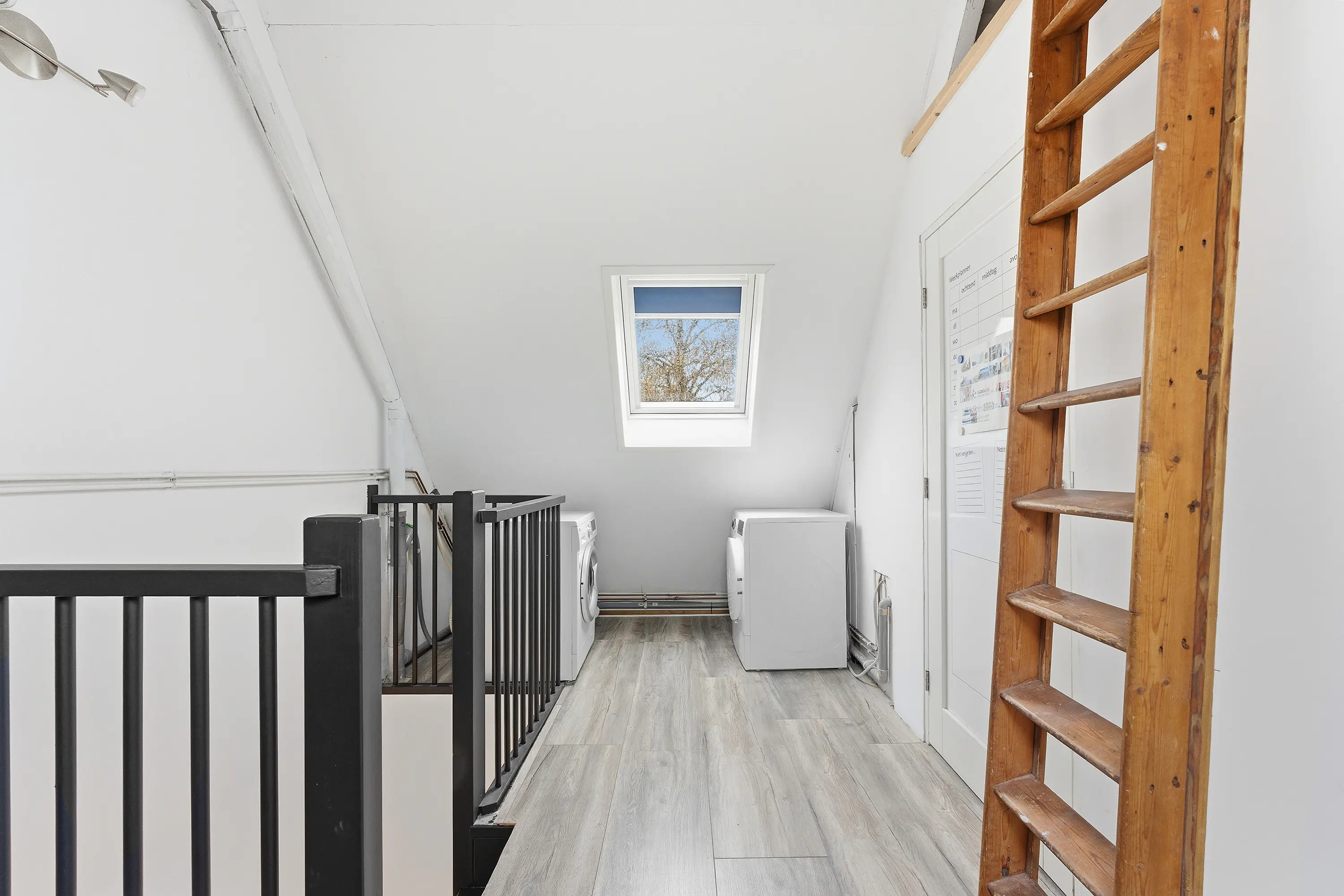 De ruime voorzolder biedt plaats aan de aansluitingen voor witgoed en de opstelling van de cv-ketel, warmtepomp, buffervat en de unit voor mechanische ventilatie. Tevens is er toegang tot een praktische bergruimte onder de schuine kap alsook een bergzolder.
