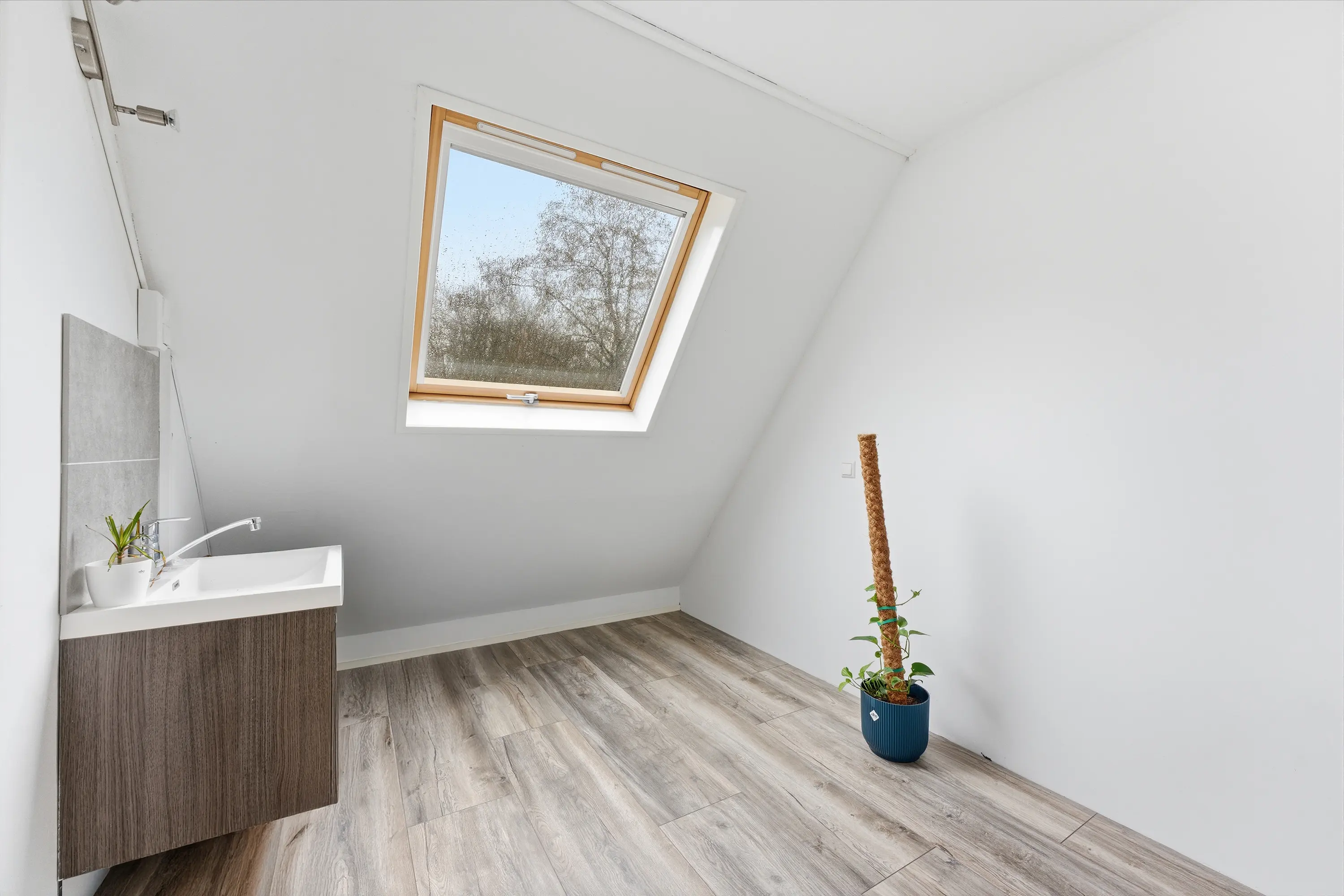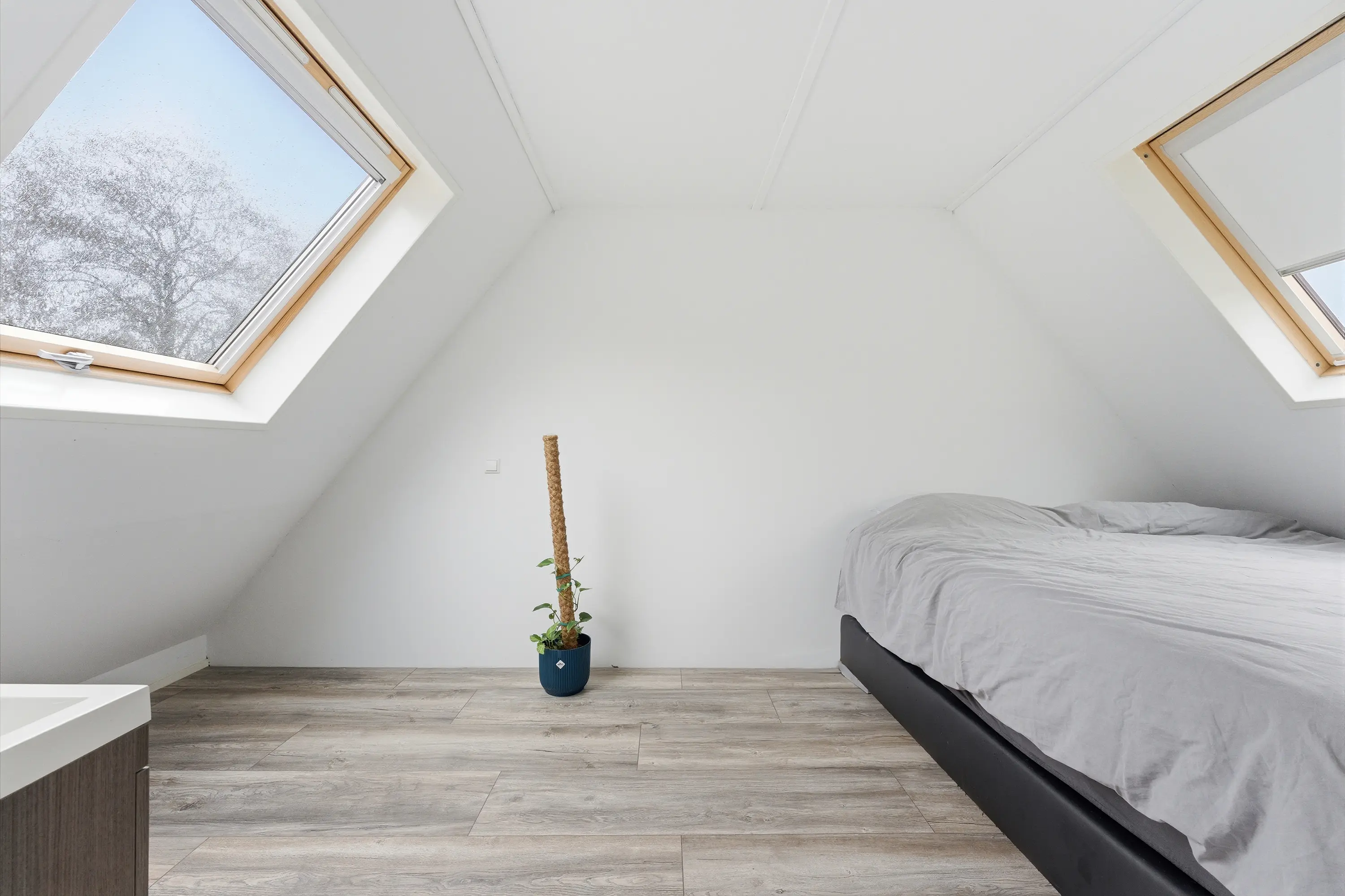 Lichte zolderkamer met dakvensters aan zowel de voor- als achterzijde, voorzien van een wastafelmeubel. Door de royale afmetingen bestaat hier de mogelijkheid om twee slaapkamers te realiseren.