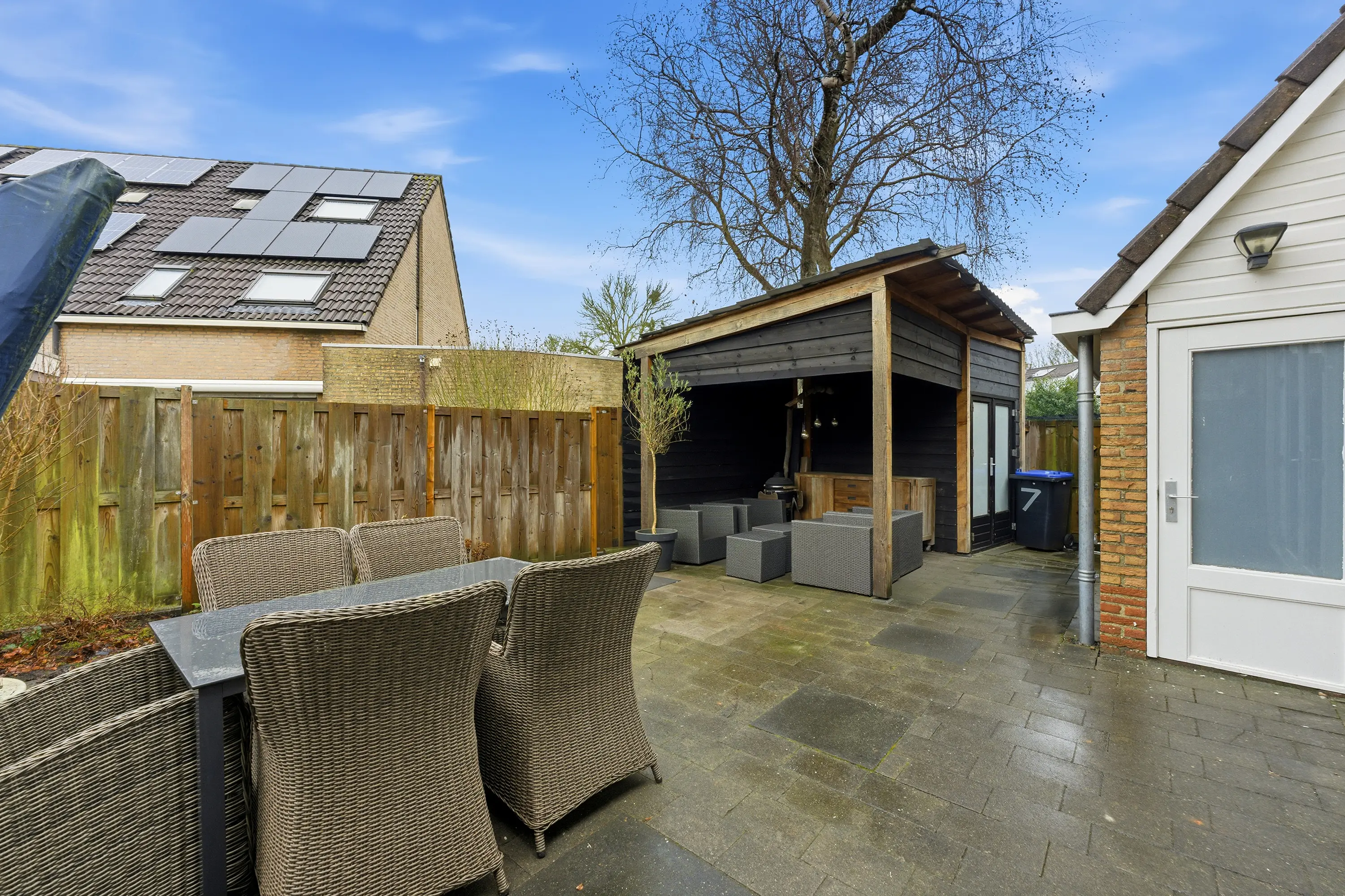 De achtertuin is circa 7 meter diep en 11 meter breed. Dankzij de hoekligging beschikt de woning over een extra brede tuin. De tuin is onderhoudsvriendelijk aangelegd met voornamelijk sierbestrating en houten erfafscheidingen. Hier geniet u volop van zon en privacy. Achter in de tuin bevindt zich een houten berging met openslaande deuren en een aangrenzende ruime overkapping waar het heerlijk verblijven is.