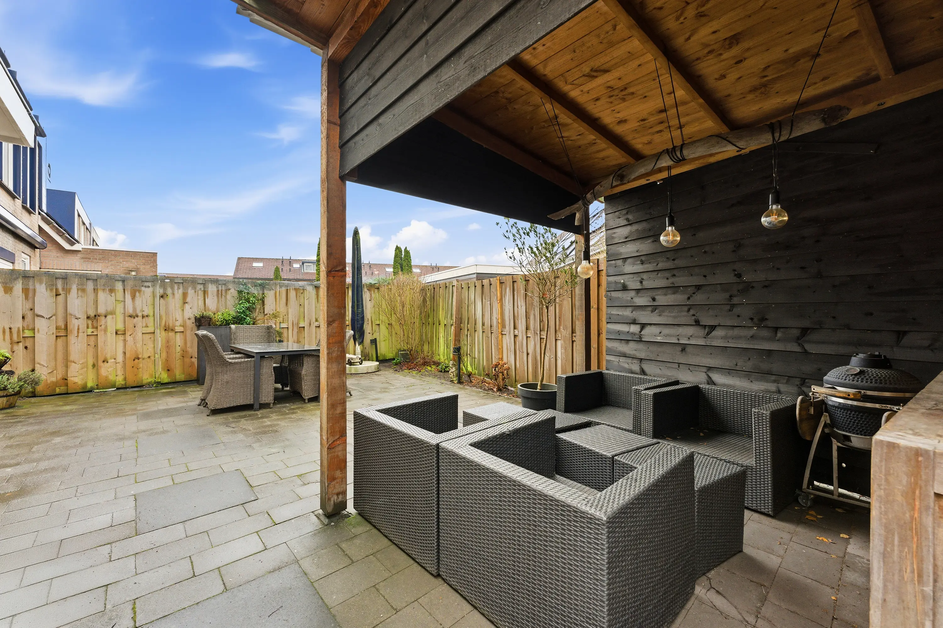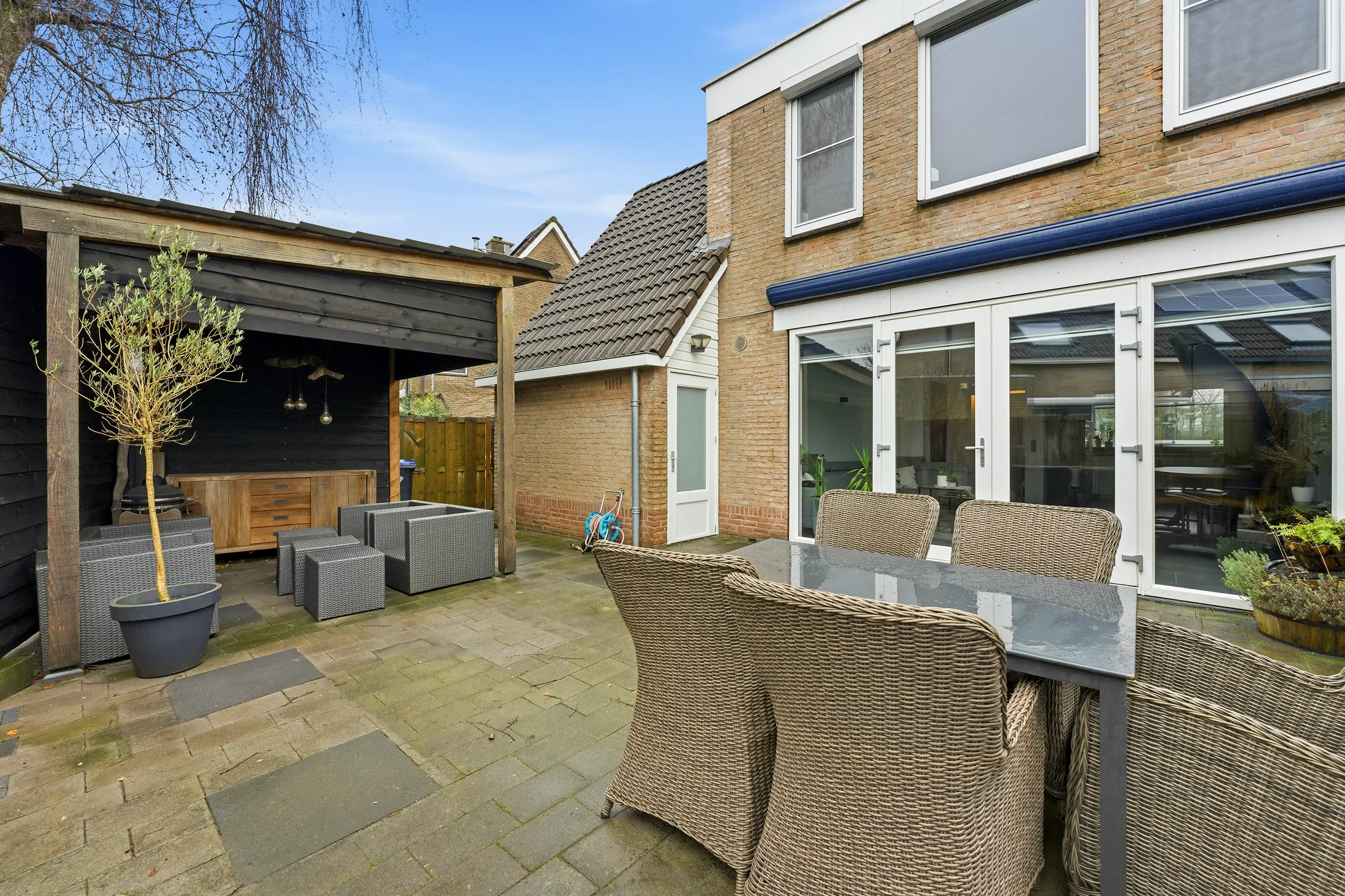 De brede, onderhoudsvriendelijke achtertuin biedt volop zon en privacy en beschikt over een berging met aangrenzende overkapping.