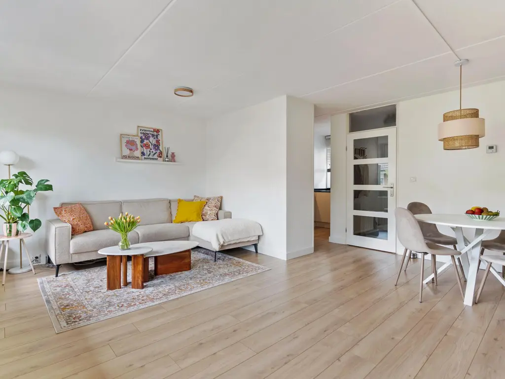 Ruime en lichte woonkamer met een grote raampartij aan de achterzijde en toegang tot het balkon, welke is afgewerkt met een nette houten vlonderdelen.