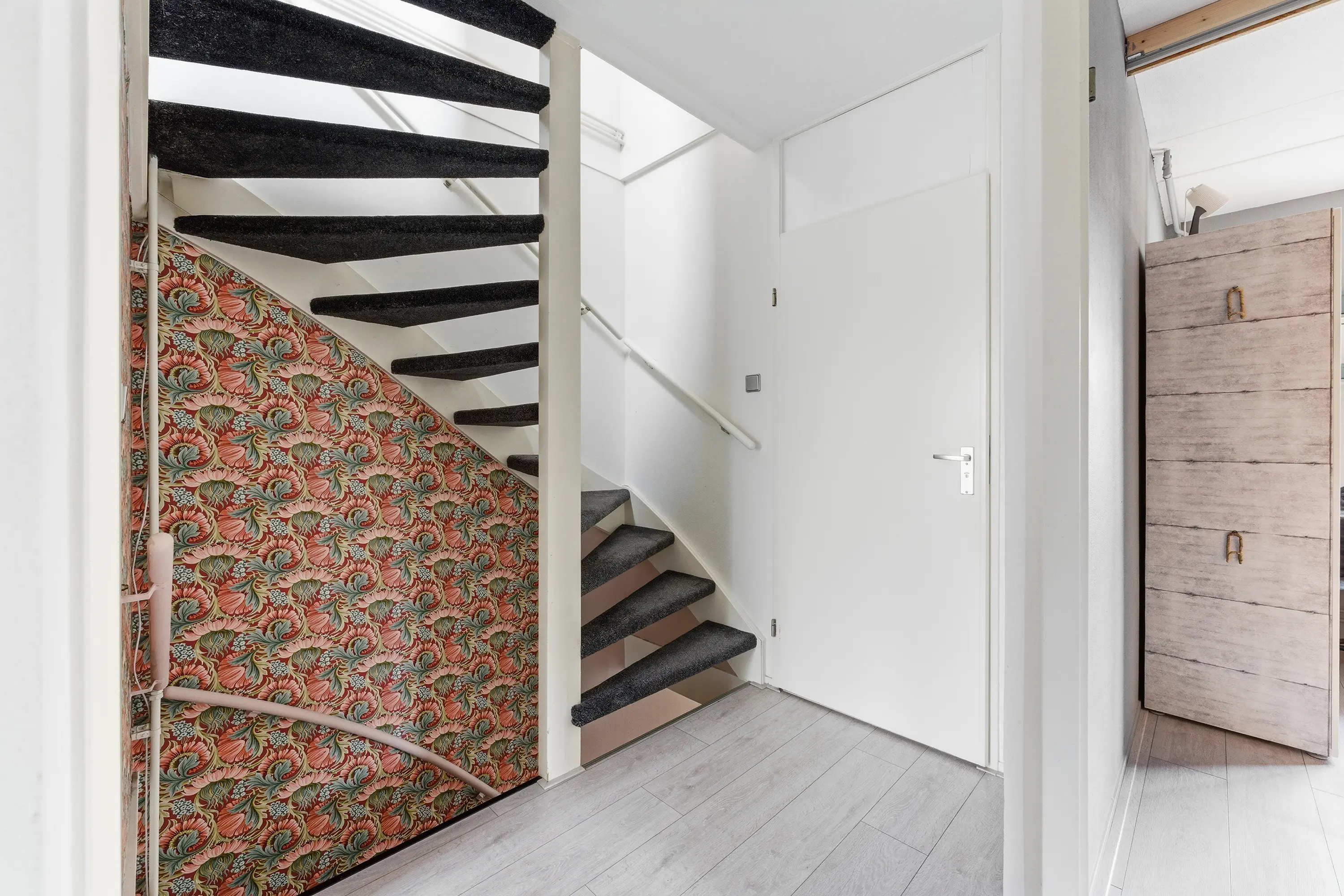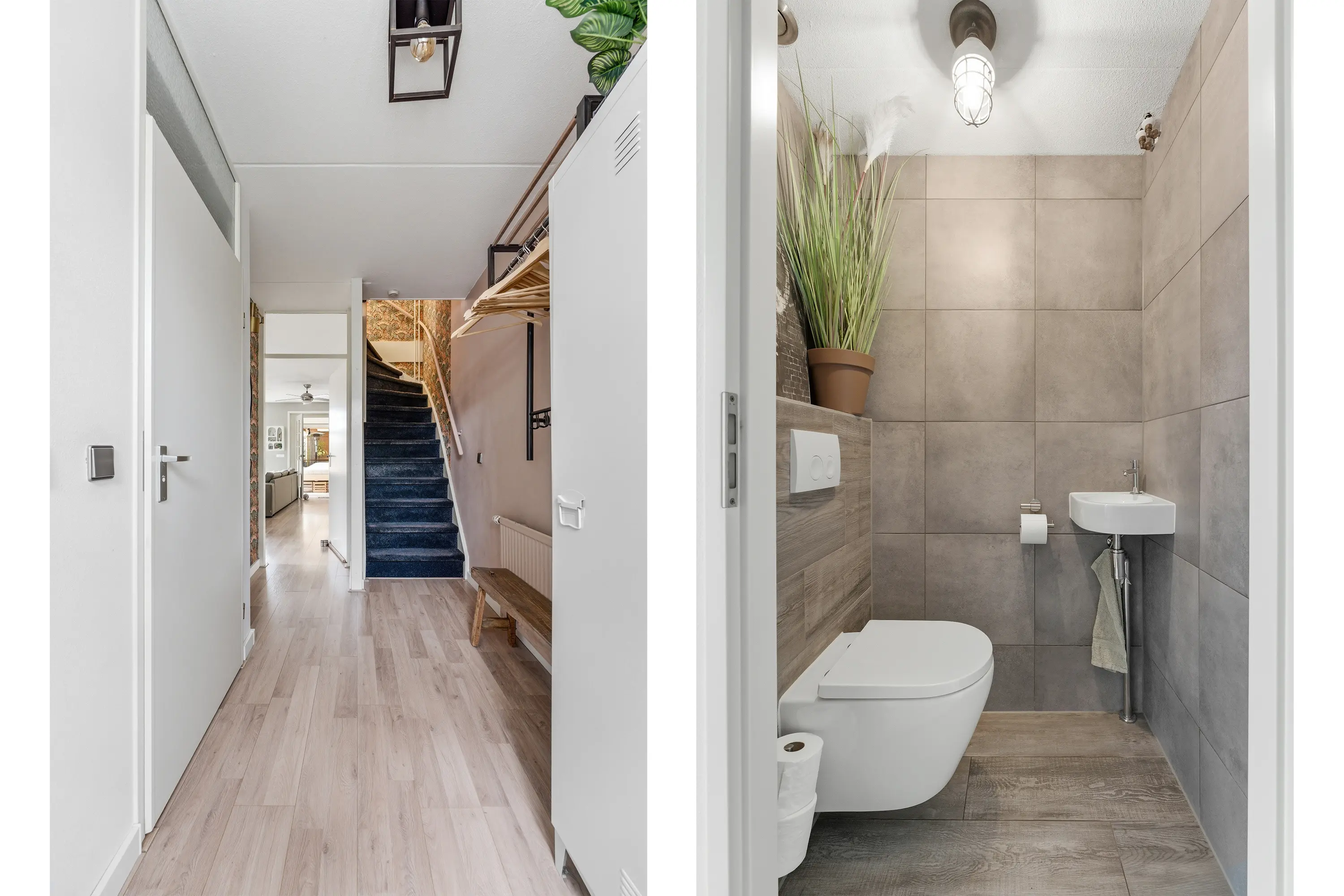 Via de entree komt u in de opvallend ruime en lichte hal met moderne de groepenkast, de trapopgang naar de eerste verdieping en een luxe betegelde toiletruimte met een wandcloset en een fonteintje.