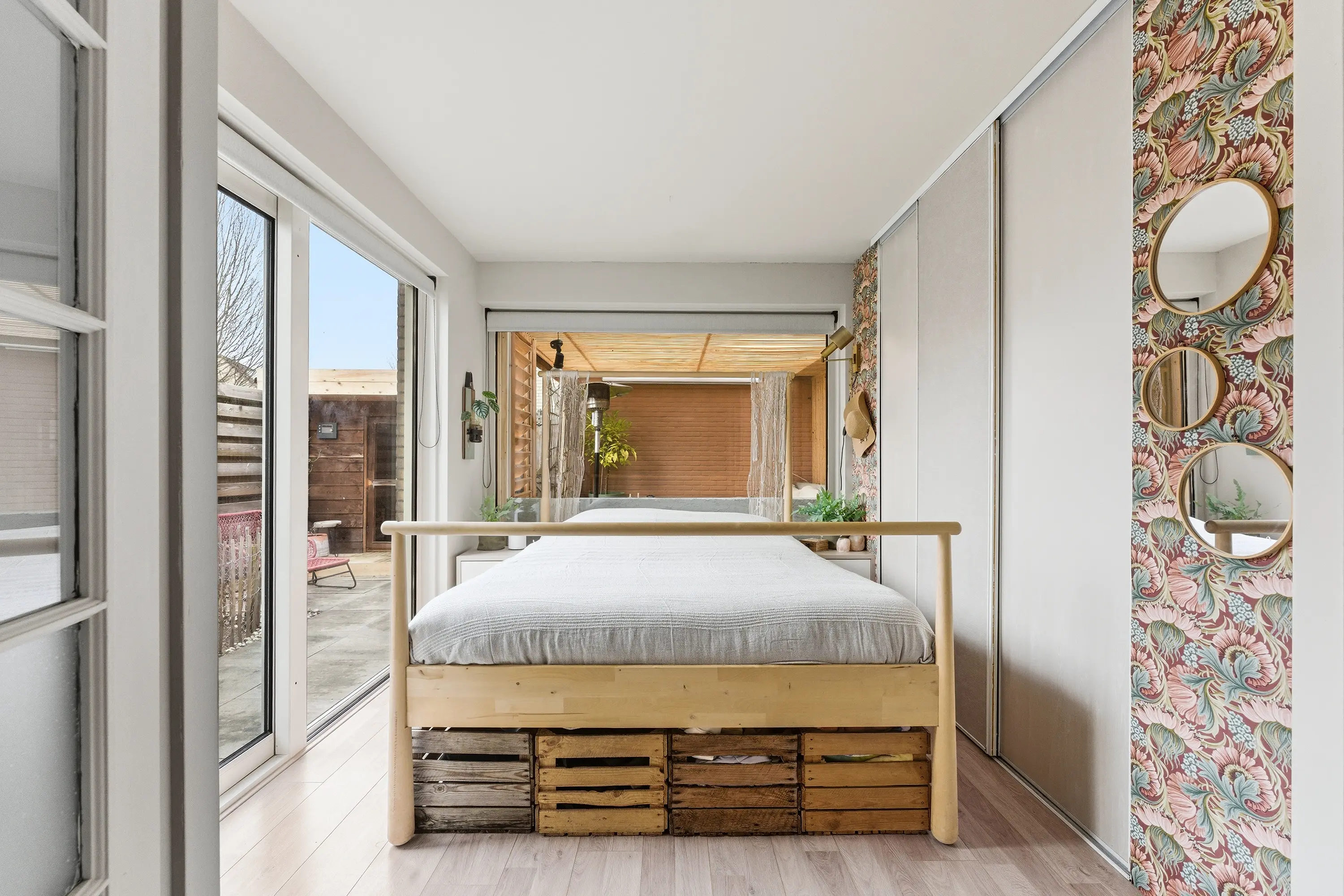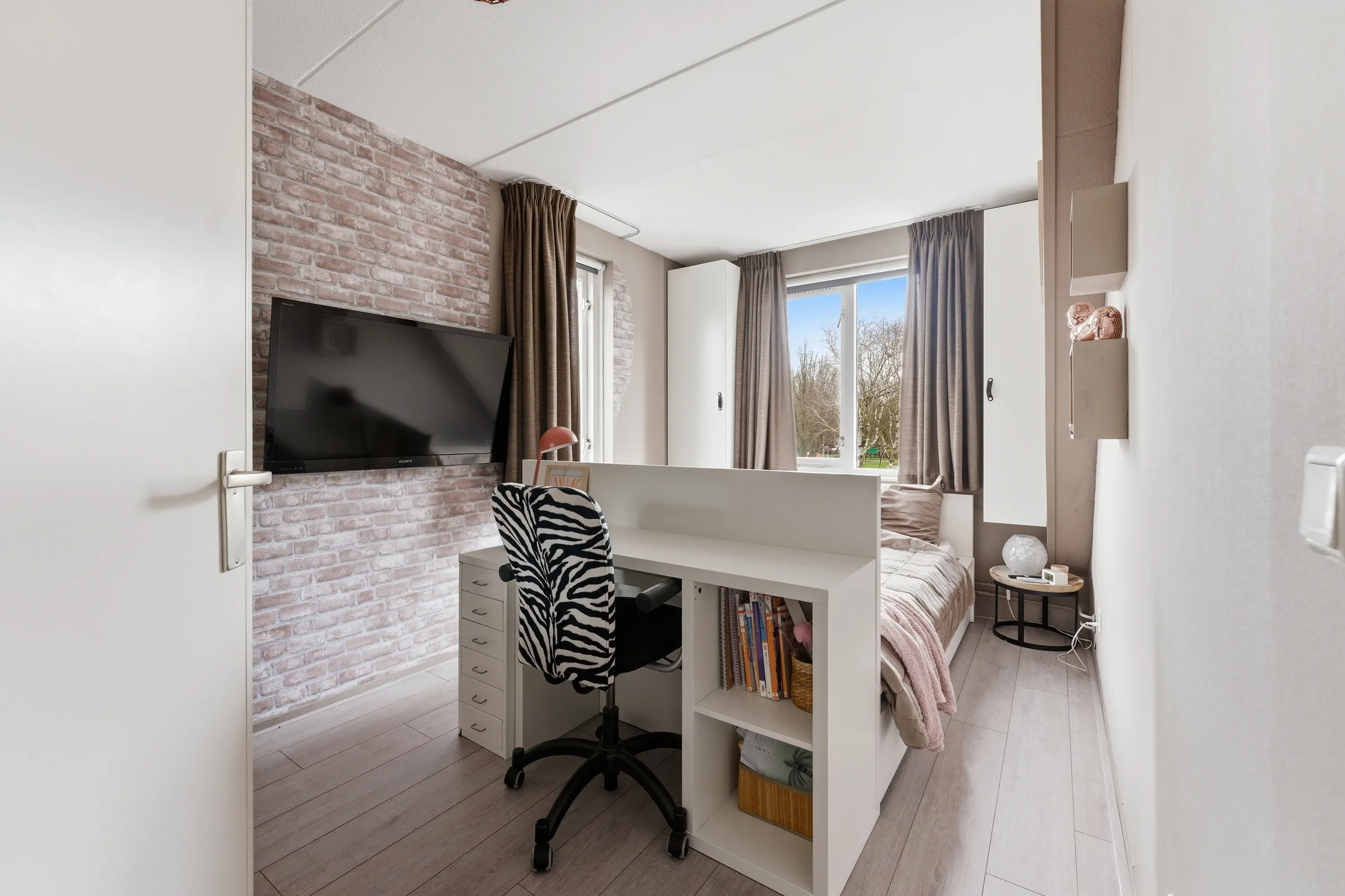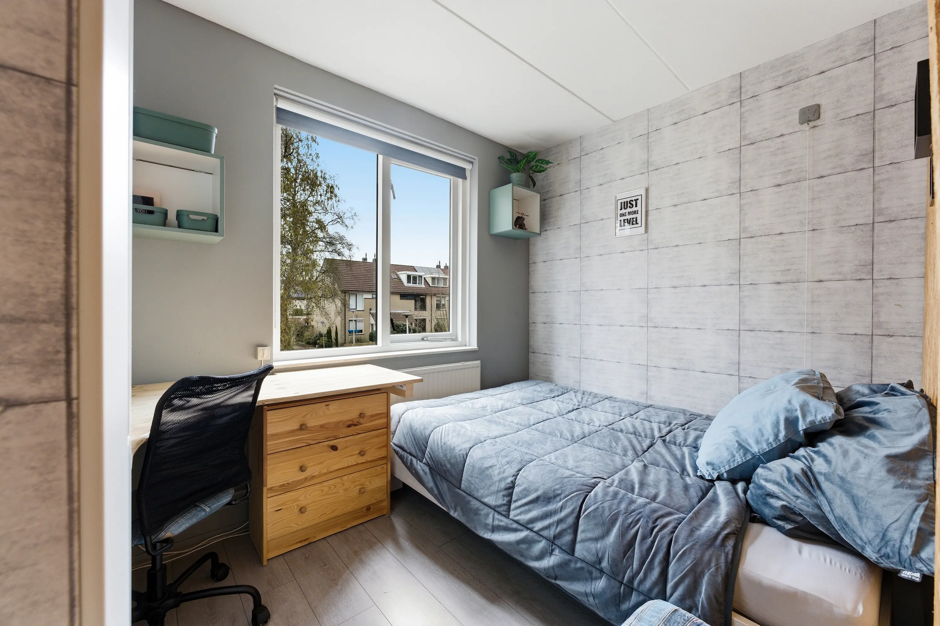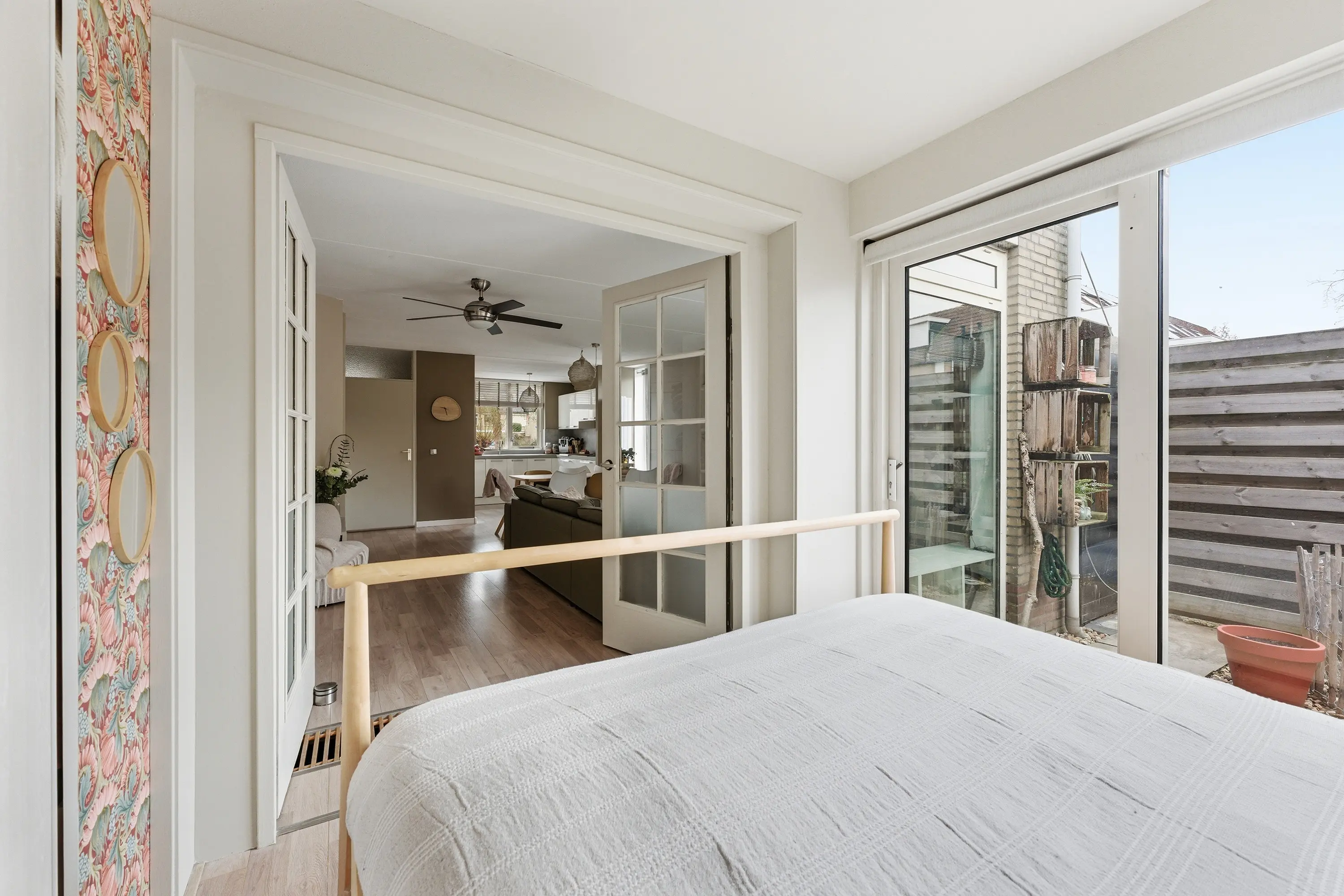 Praktische kamer met inbouwkastenwand en een schuifpui naar de achtertuin.