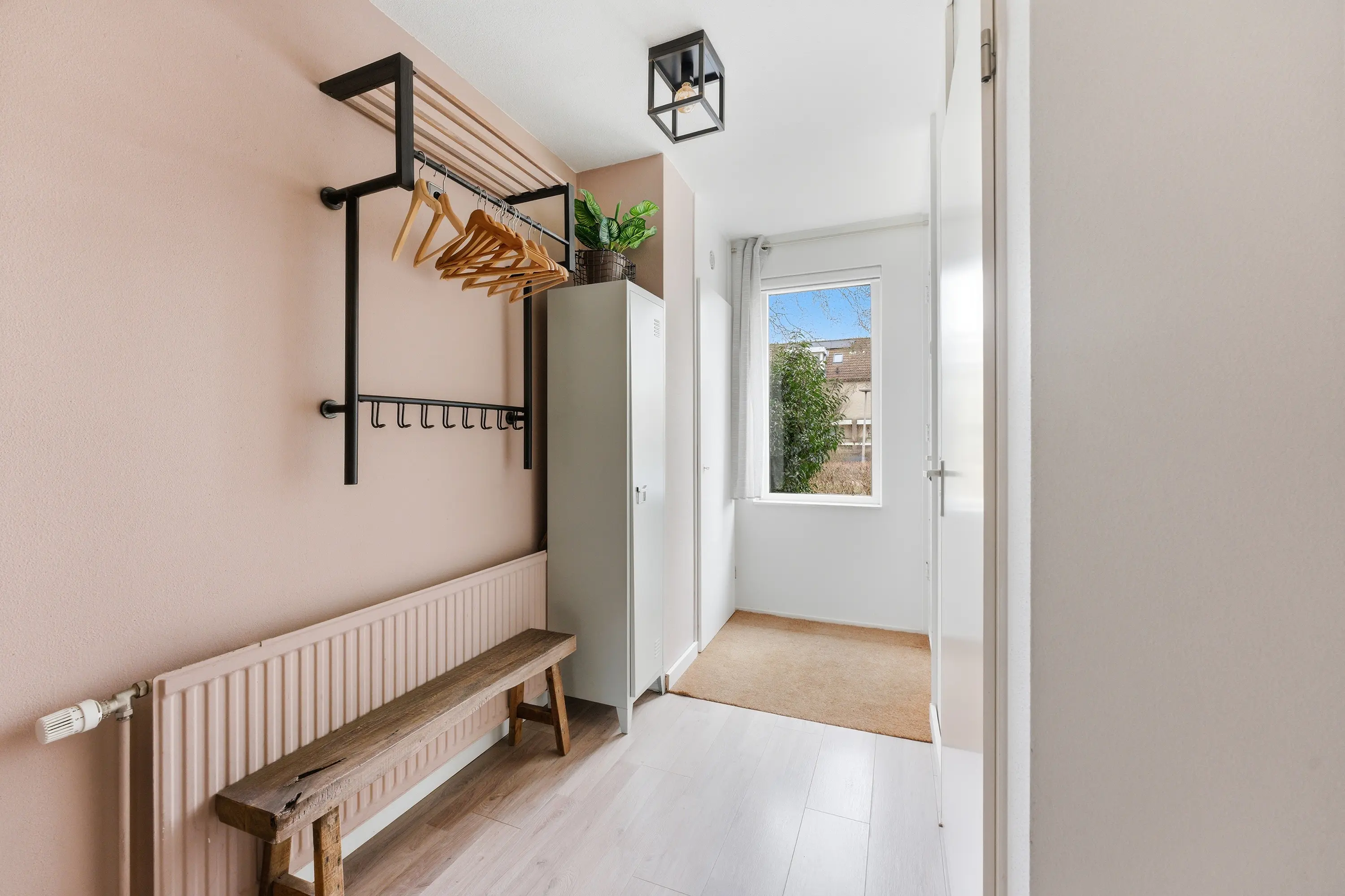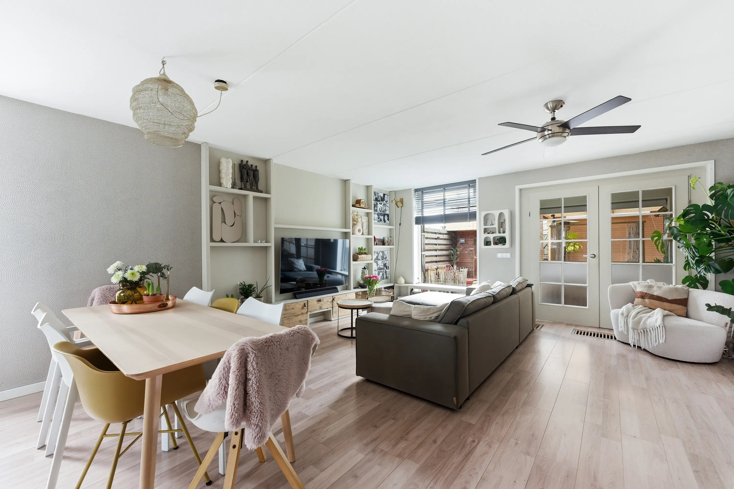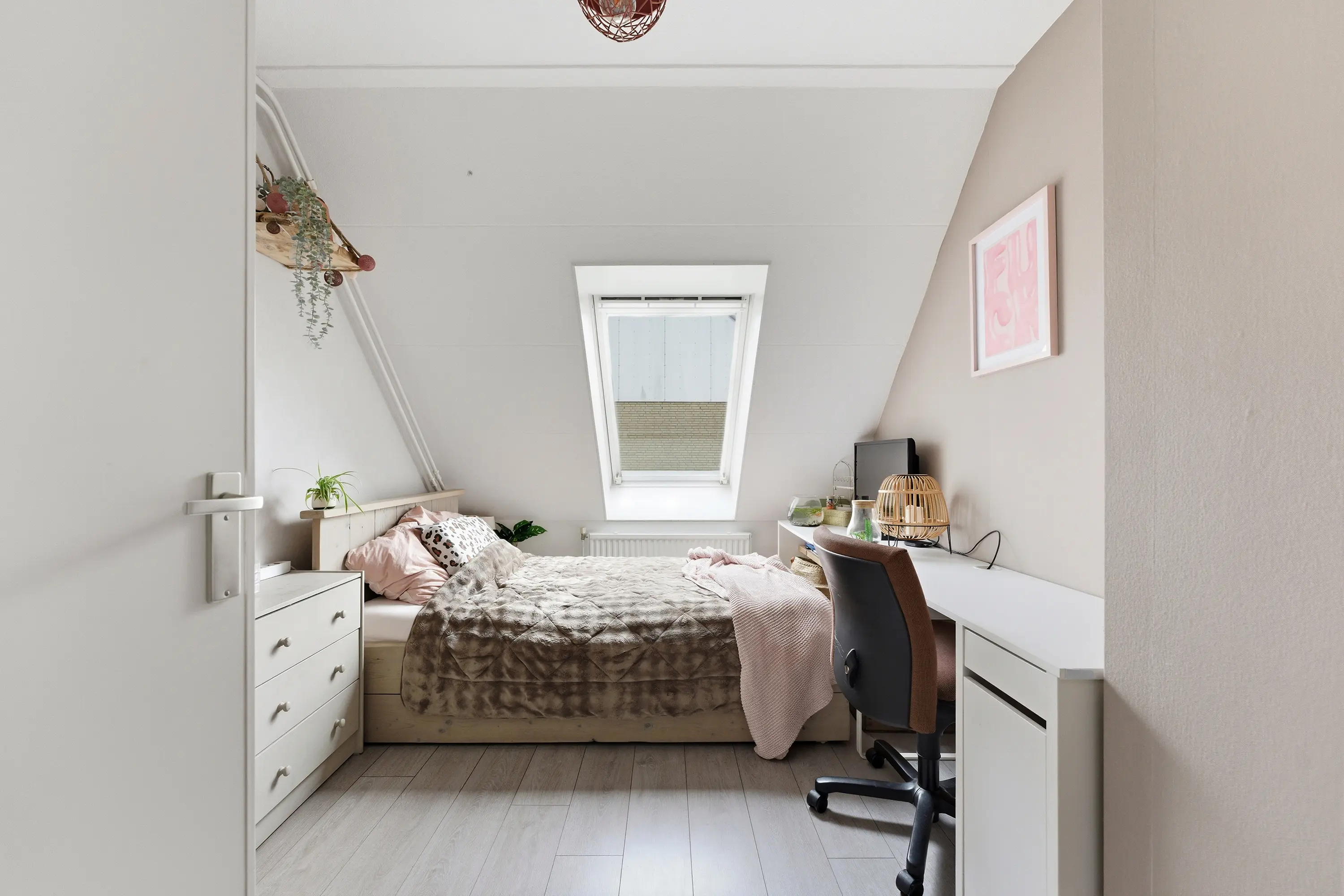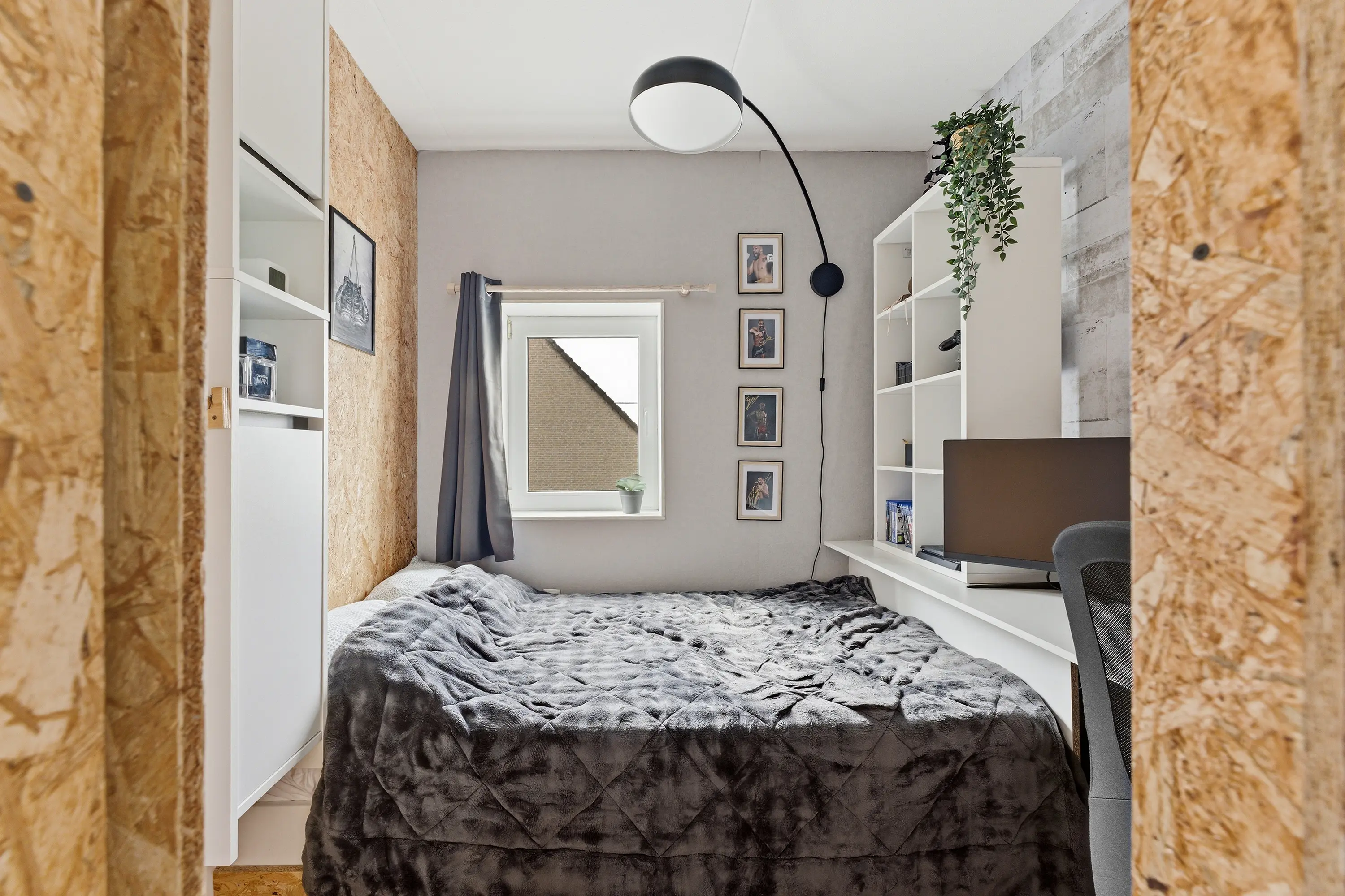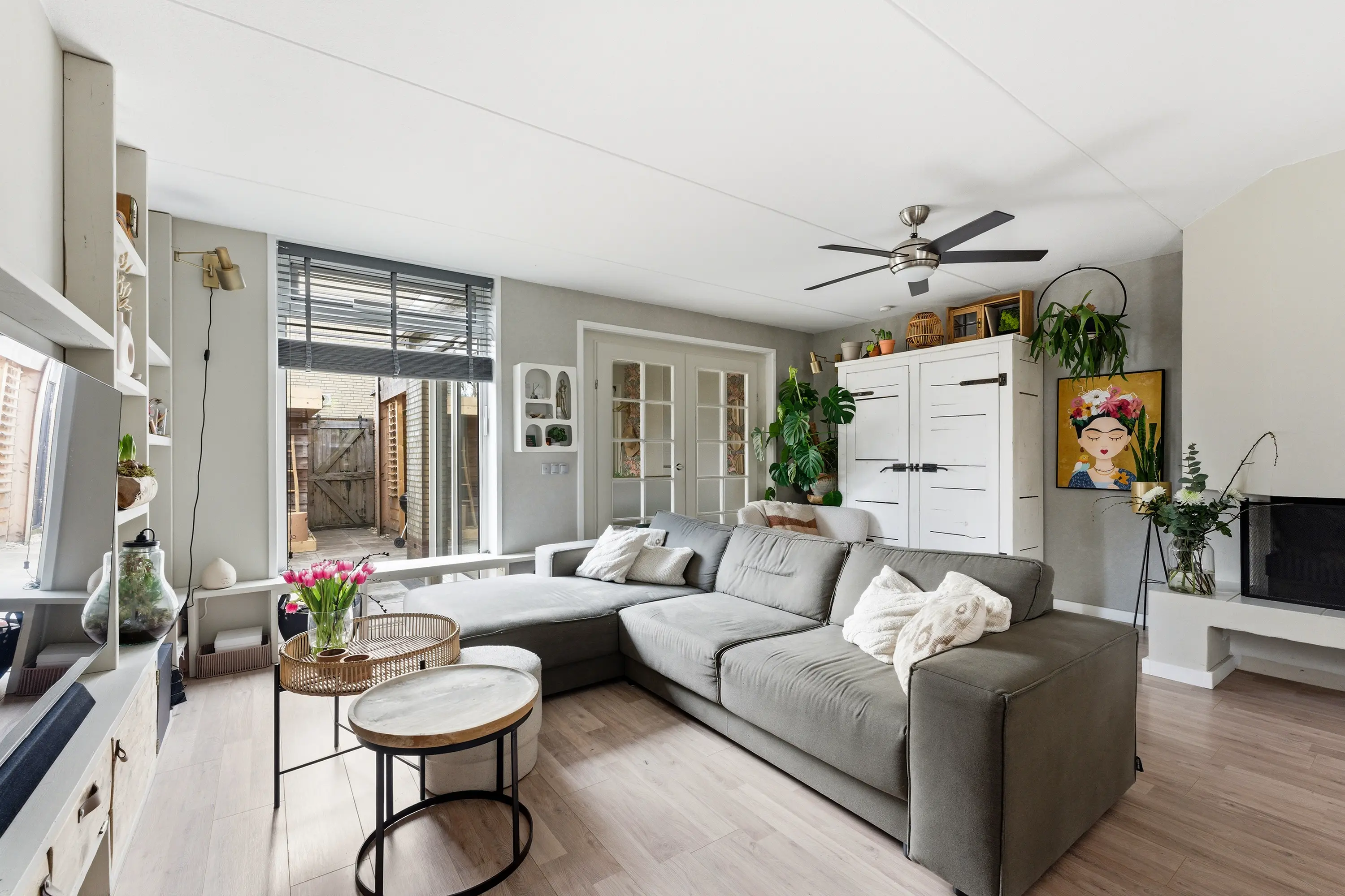 Praktische kamer met inbouwkastenwand en een schuifpui naar de achtertuin.