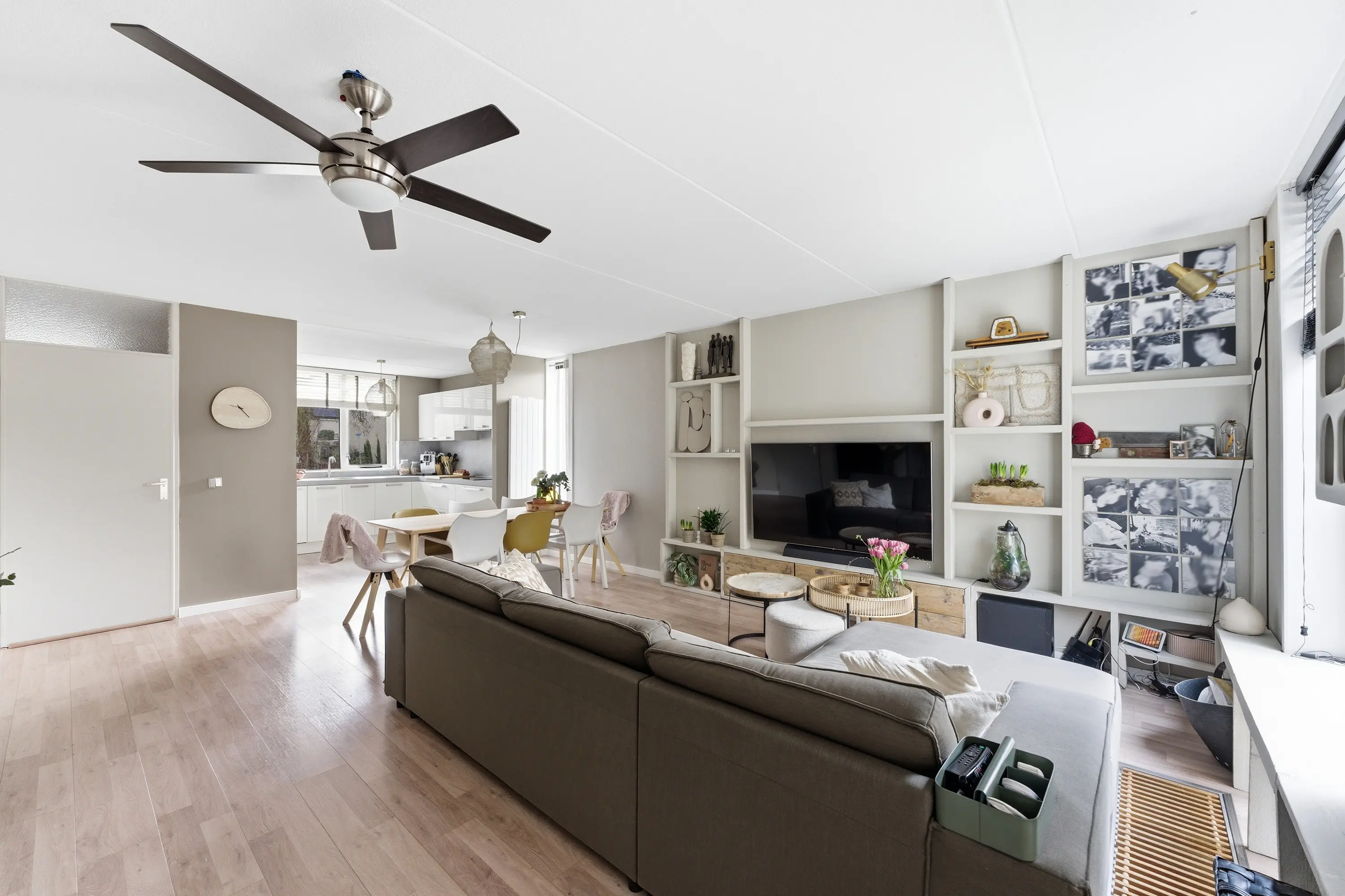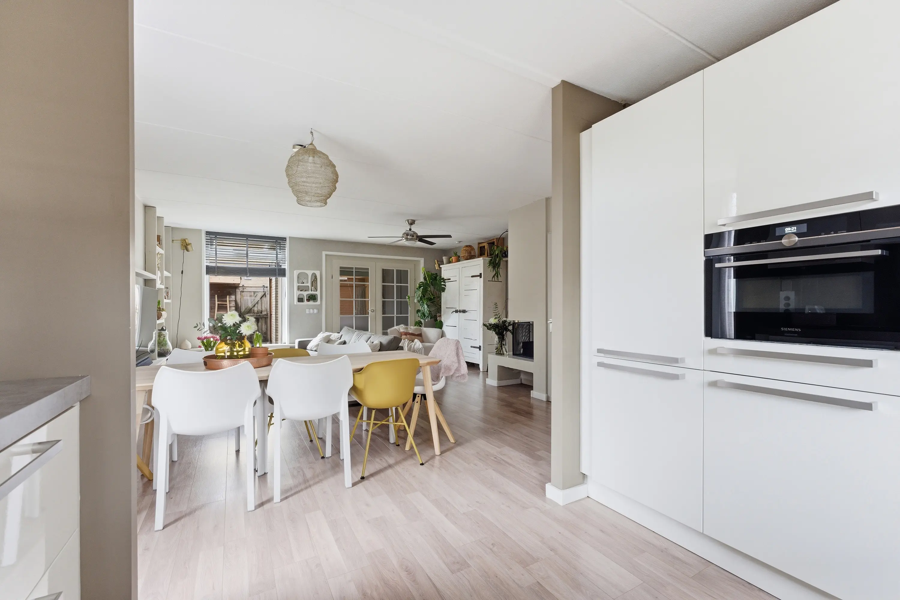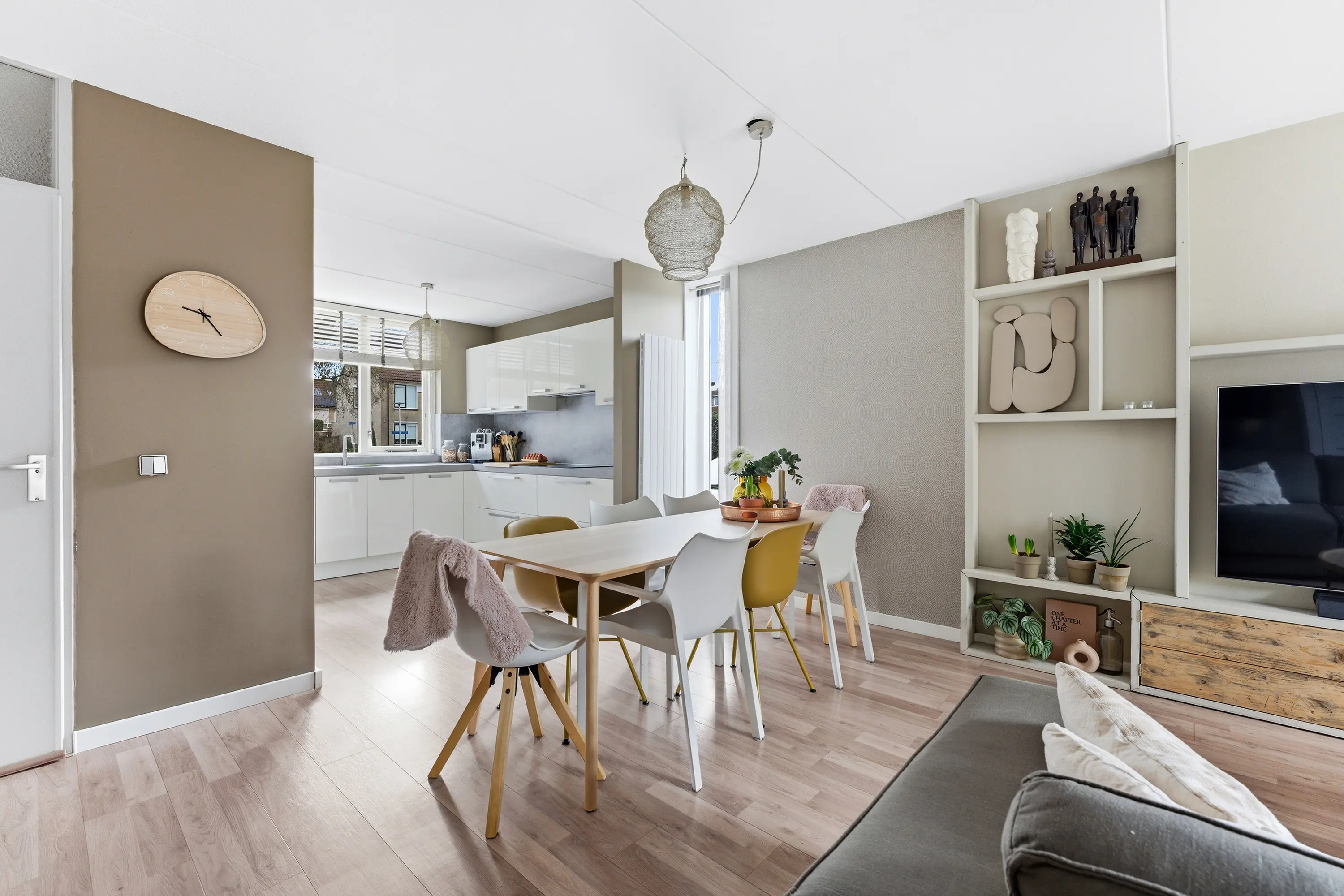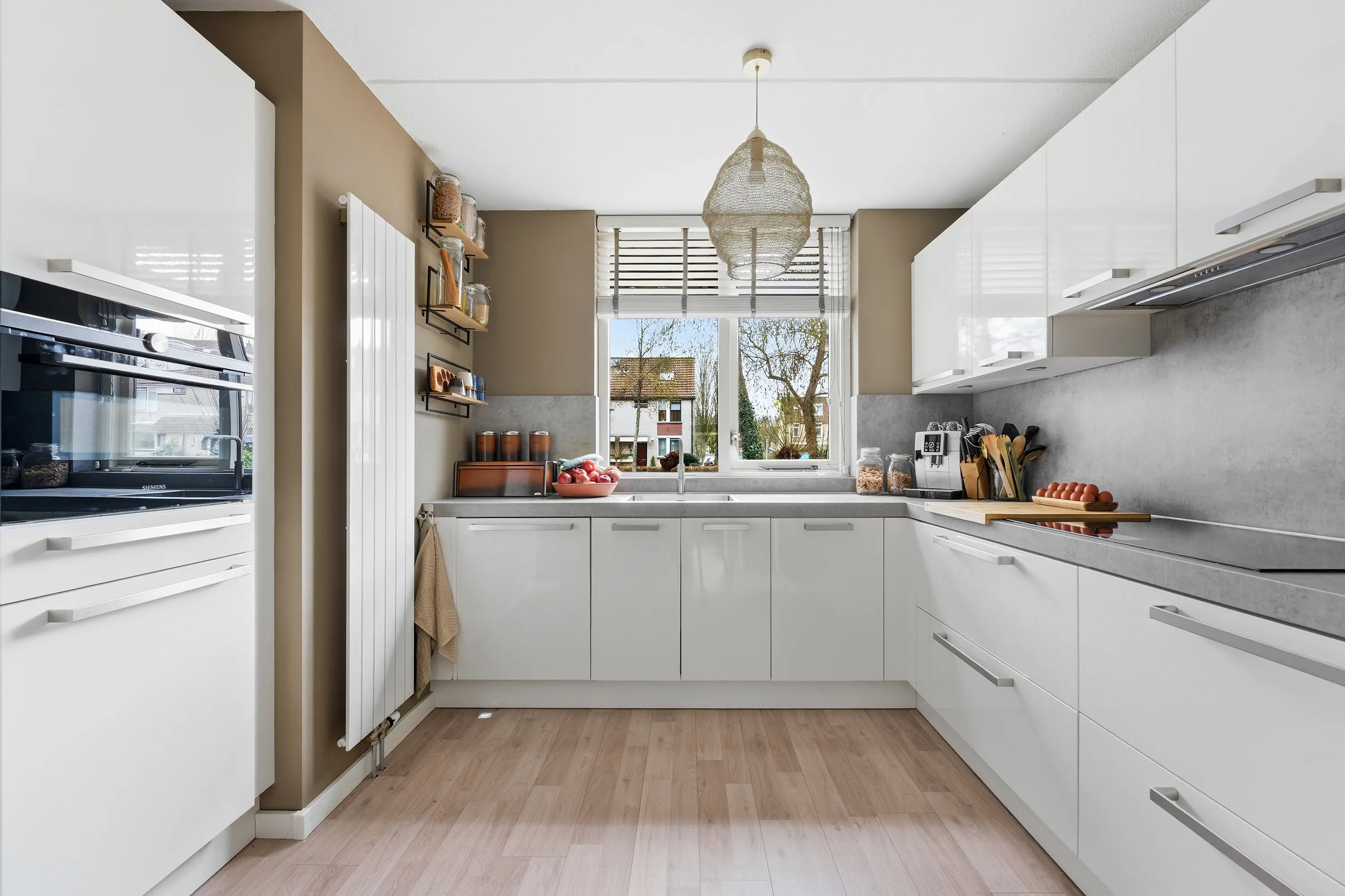 Aan de voorzijde bevindt zich de moderne keuken in L-opstelling met een separate kastenwand. De keuken is uitgevoerd in een neutrale kleurstelling met een contrasterend werkblad en beschikt over diverse kasten en lades. Inbouwapparatuur: inductiekookplaat, designafzuigkap, combi-oven, vaatwasser, koelkast, vriezer en Quooker.