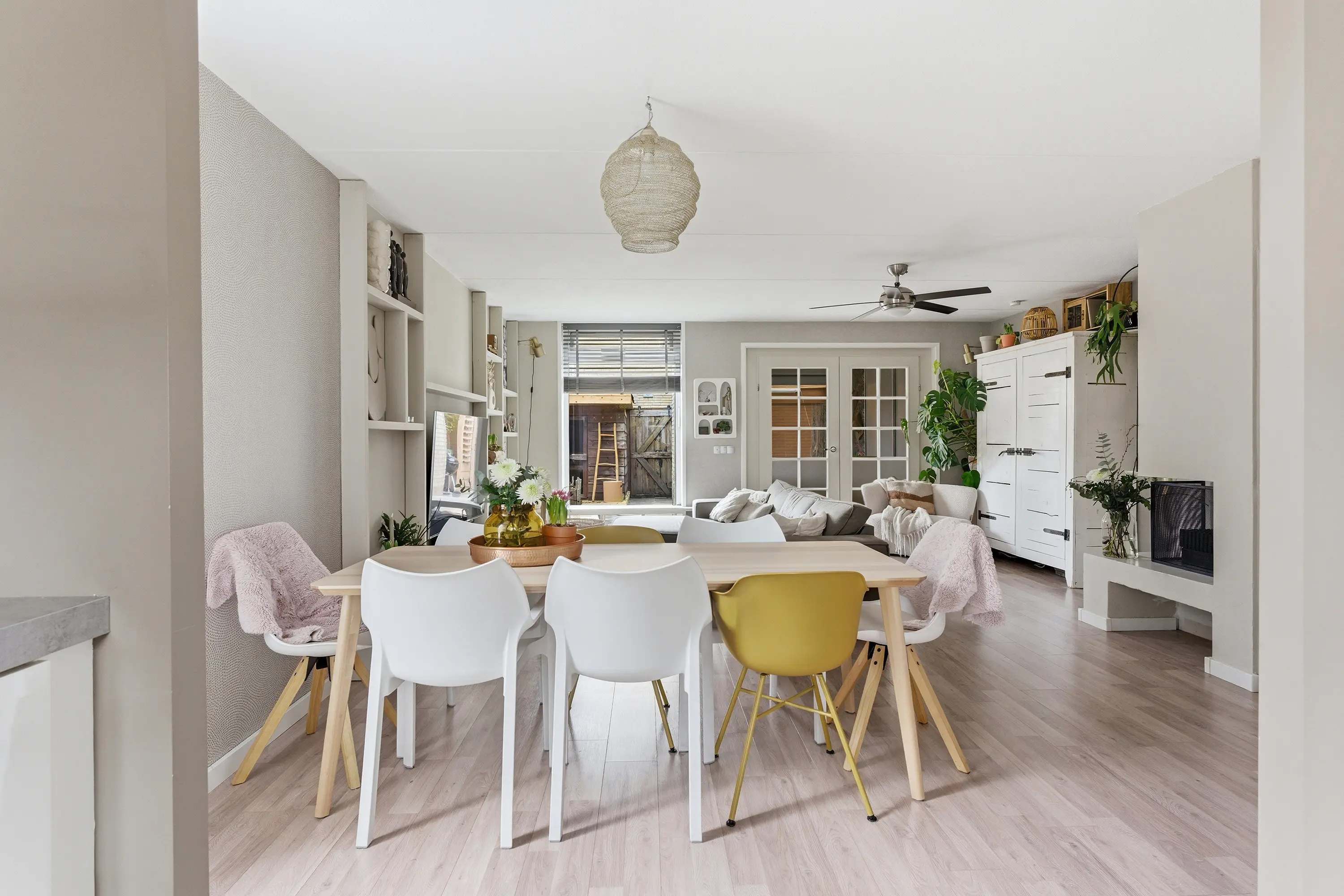 De brede, tuingerichte woonkamer is heerlijk licht en beschikt over een praktische trapkast. De centraal geplaatste open haard zorgt niet alleen voor warmte, maar ook voor extra sfeer. Via openslaande deuren bereikt u de uitbouw aan de achterzijde. Deze ruimte is momenteel in gebruik als slaapkamer, maar is multifunctioneel en bijvoorbeeld ook geschikt als werk- of speelkamer.