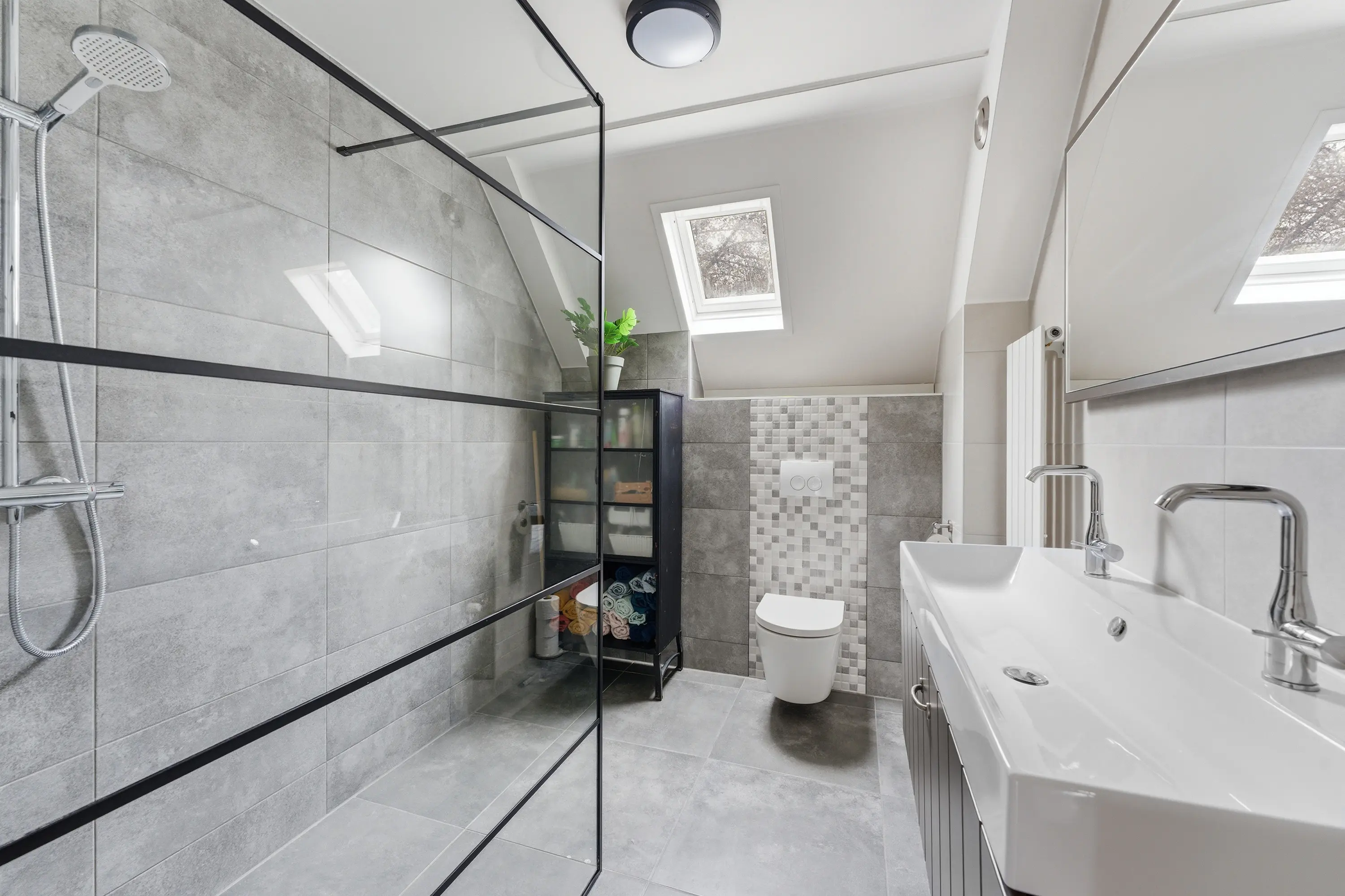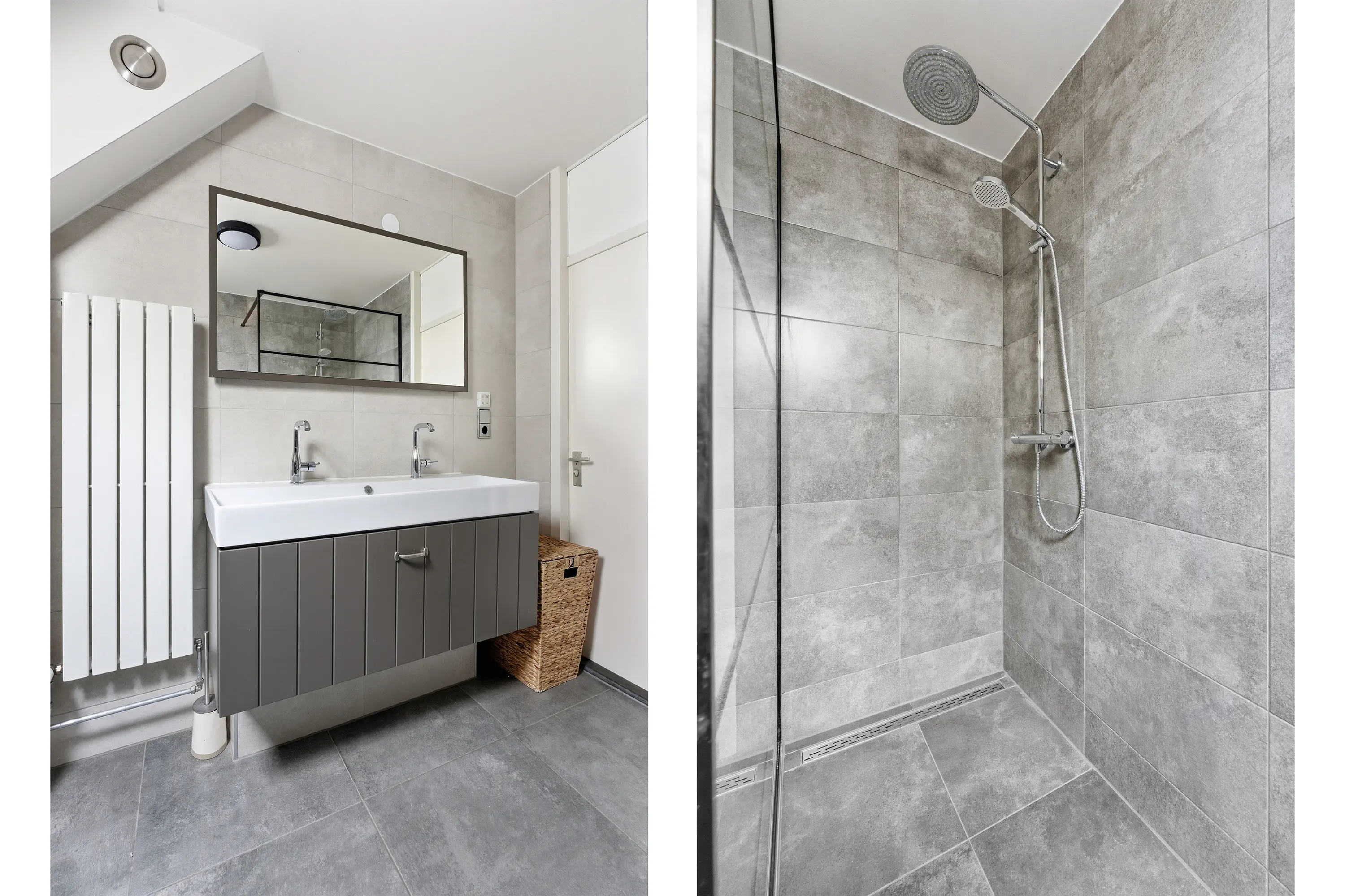De luxe, volledig betegelde badkamer is gelegen aan de voorzijde en voorzien van een ruime inloopdouche met een glazen wand en een regendouche, een wastafelmeubel met dubbele kraan, een wandcloset en designradiator.