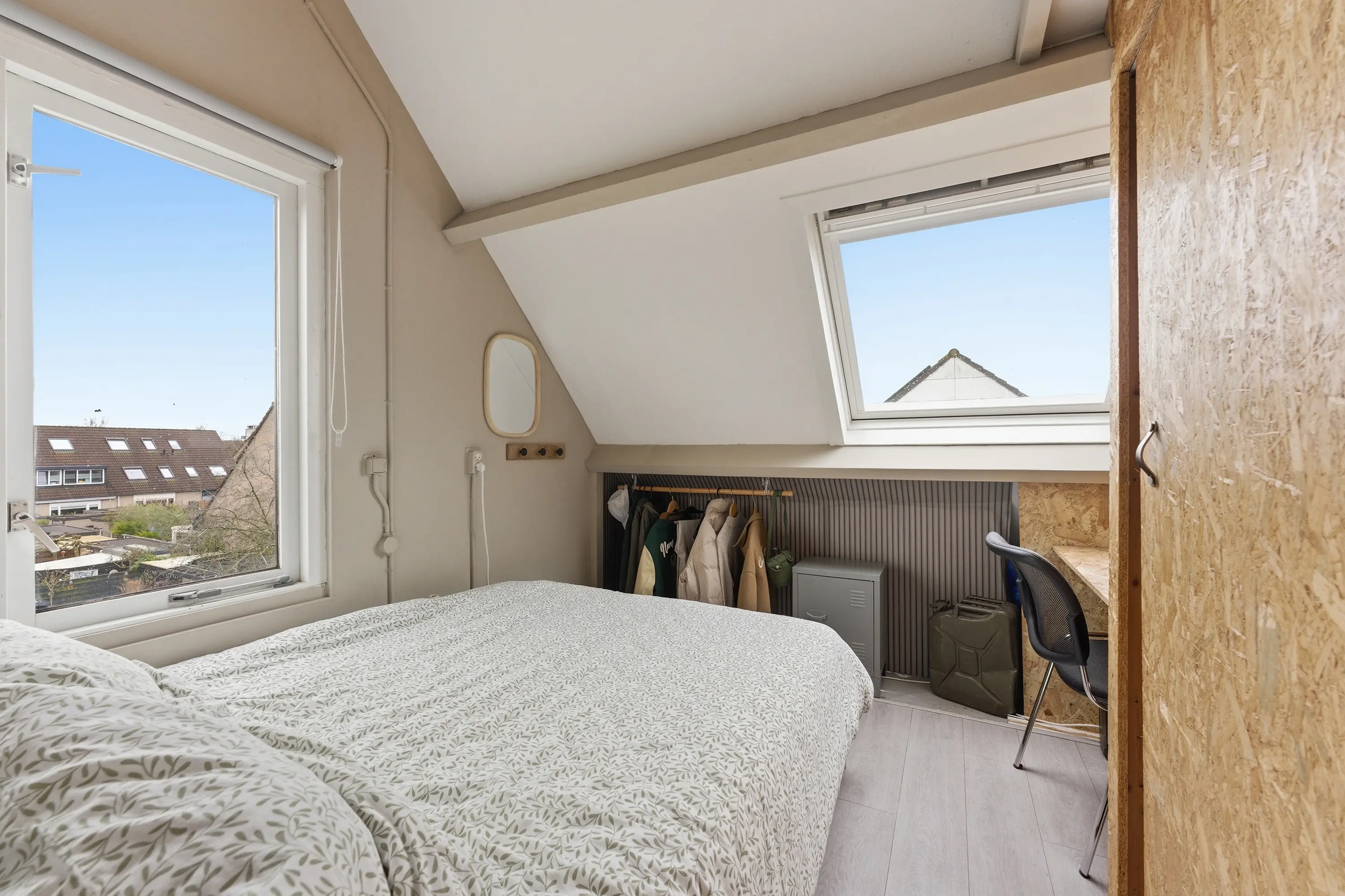 De ruime open zolder beschikt over twee dakvensters en een zijraam, wat zorgt voor prettig daglicht. Deze verdieping is momenteel ingericht als zesde slaapkamer. Tevens bevinden zich hier de wasmachineaansluiting en de cv-combiketel (Vaillant, 2019). Achter de knieschotten is volop bergruimte aanwezig.