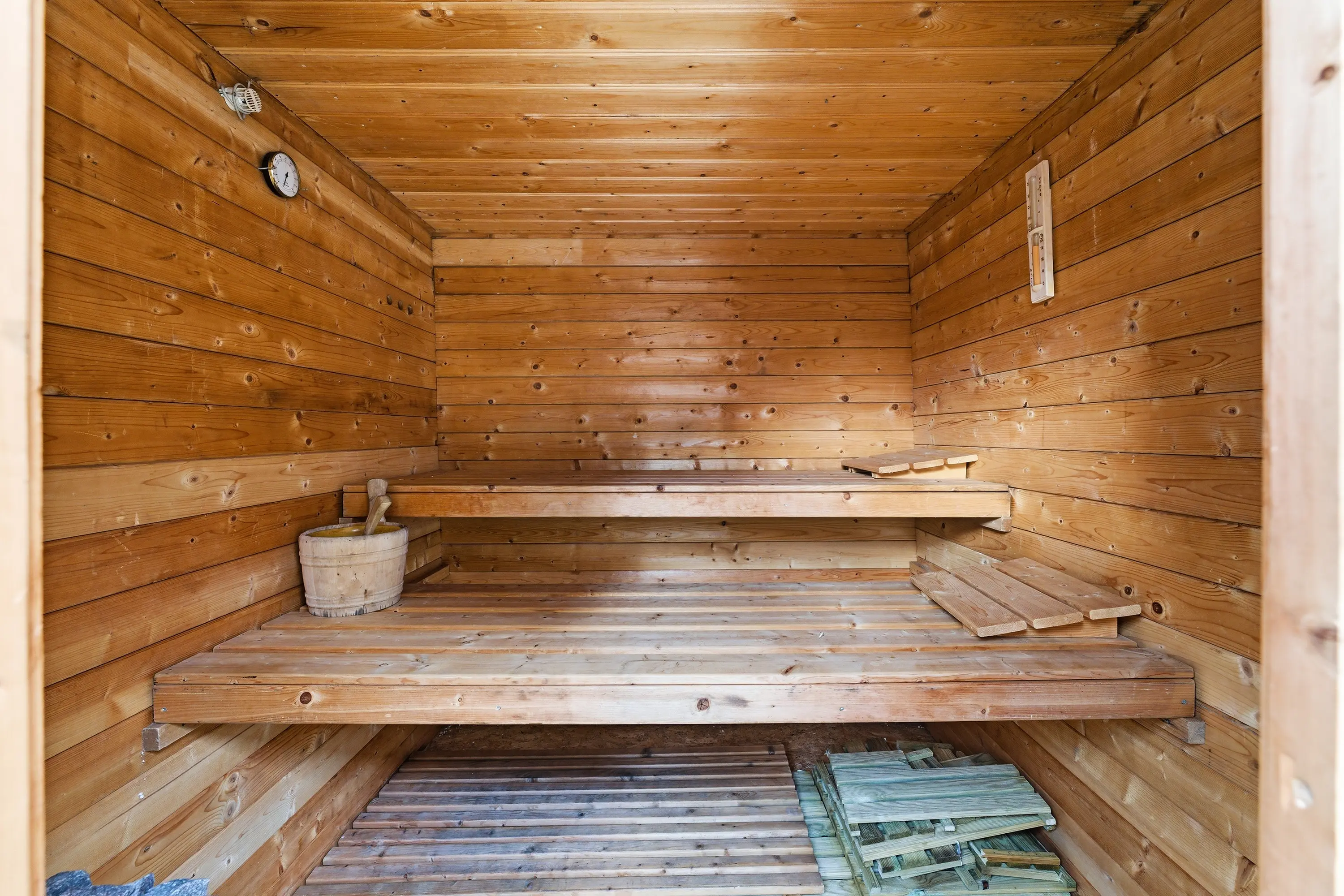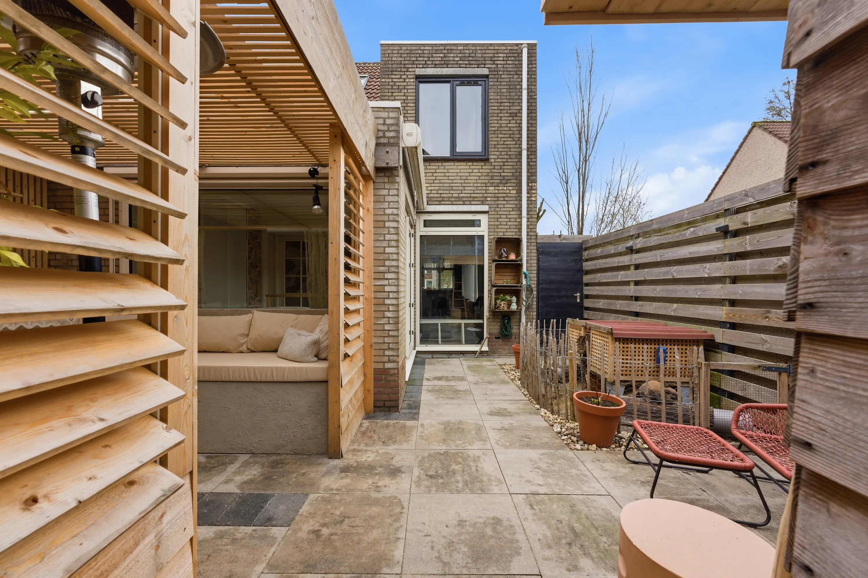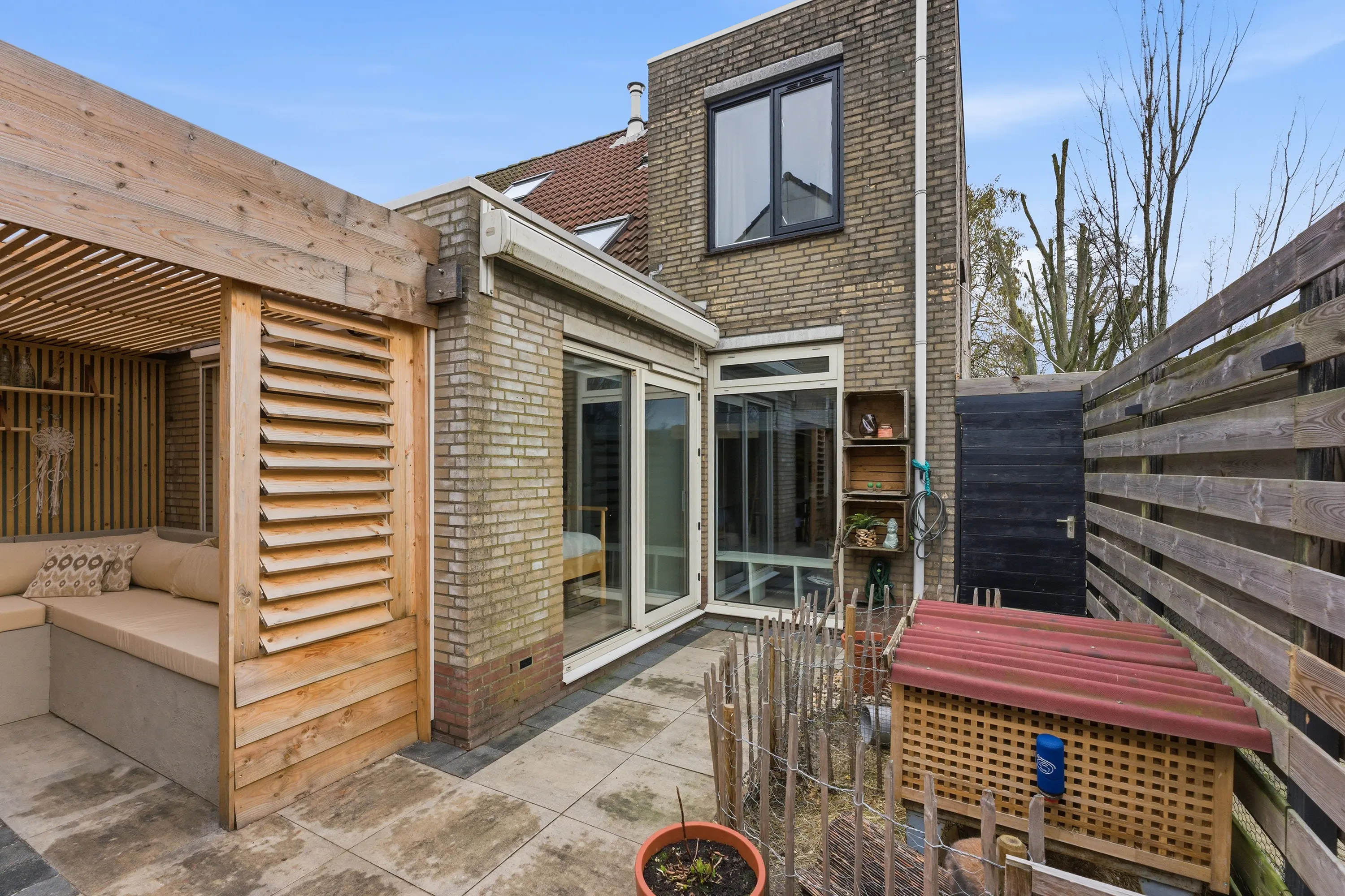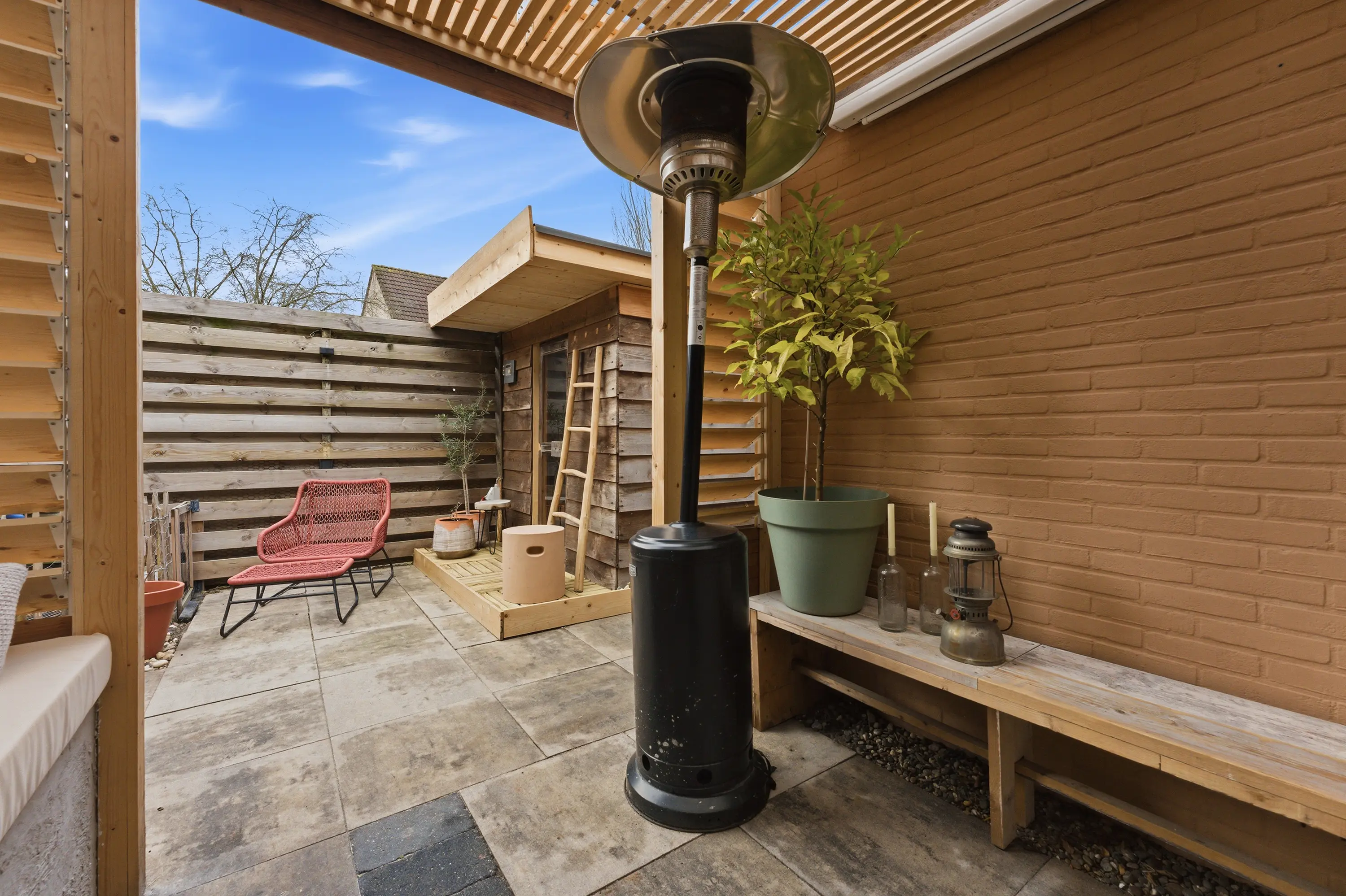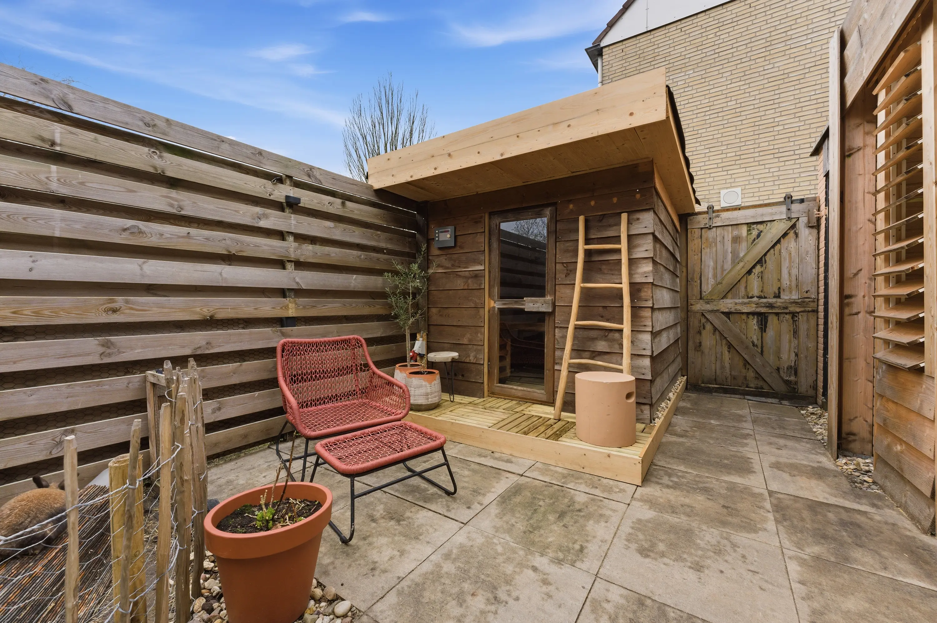 - Achtertuin op het westen met een overkapping en een vrijstaande sauna