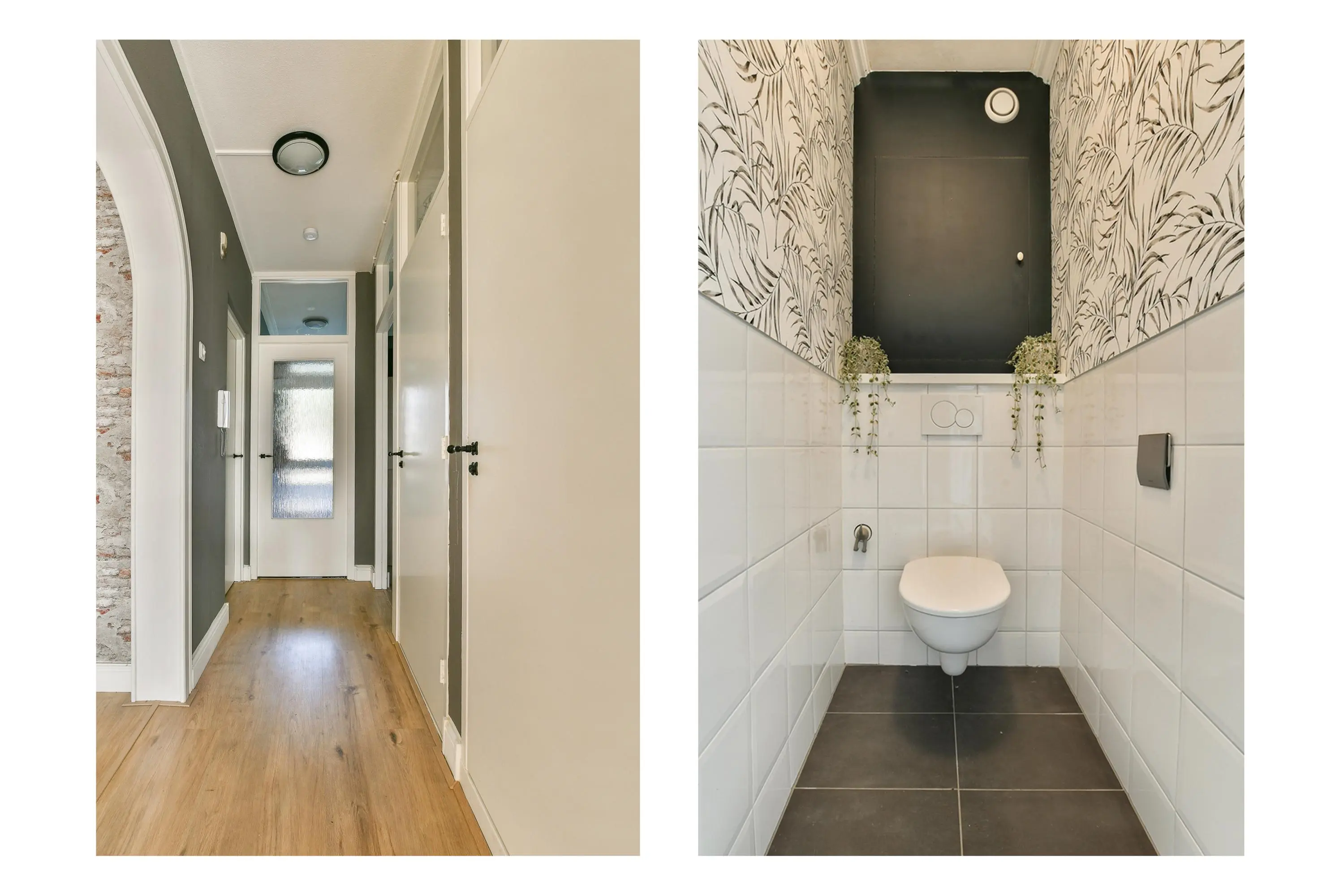Modern uitgevoerde toiletruimte, betegeld met neutrale wand- en vloertegels en voorzien van een wandcloset.