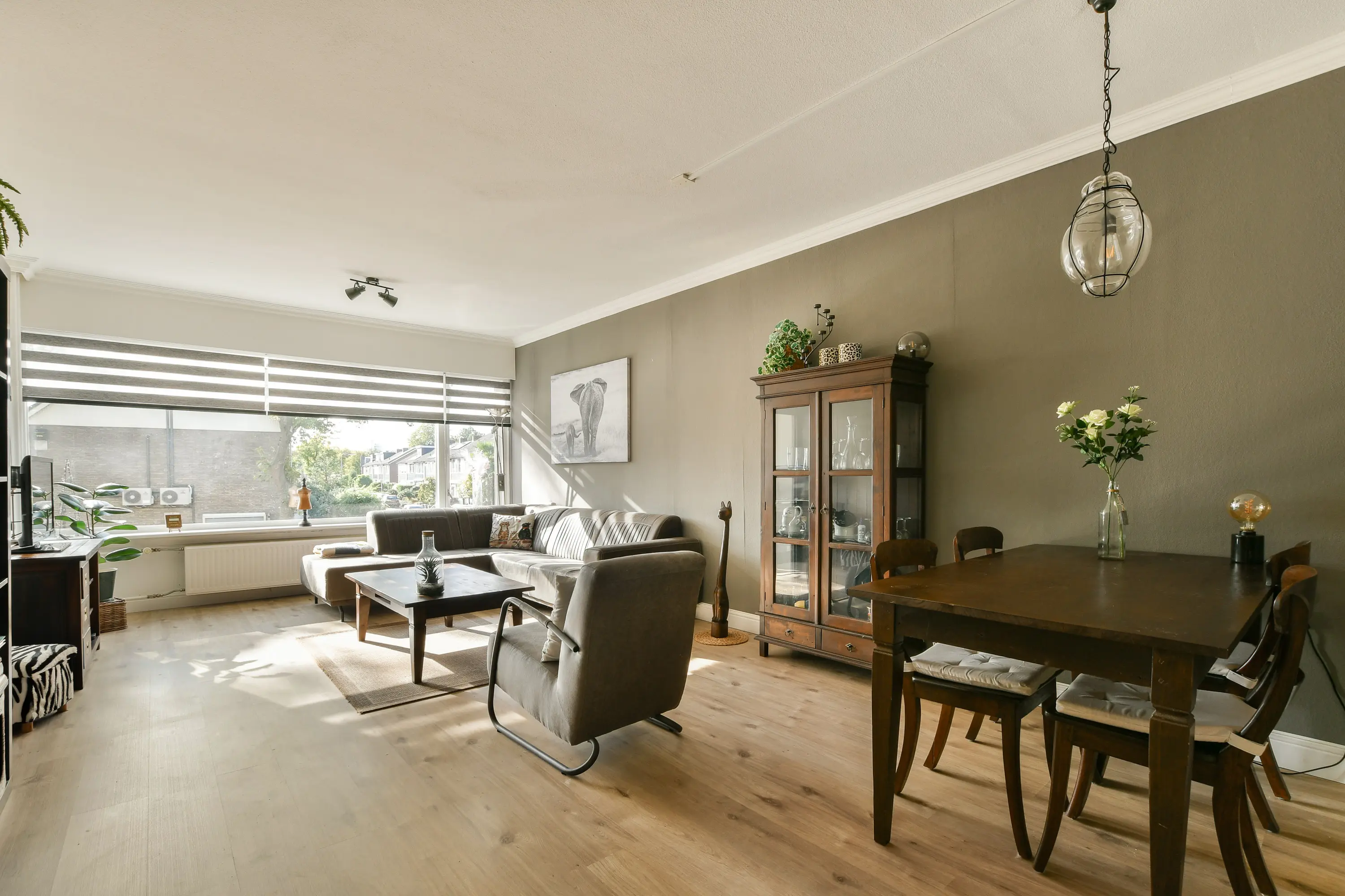 Sfeervolle en lichte woonkamer met grote raampartijen die zorgen voor veel natuurlijk licht en een prachtig vrij uitzicht.