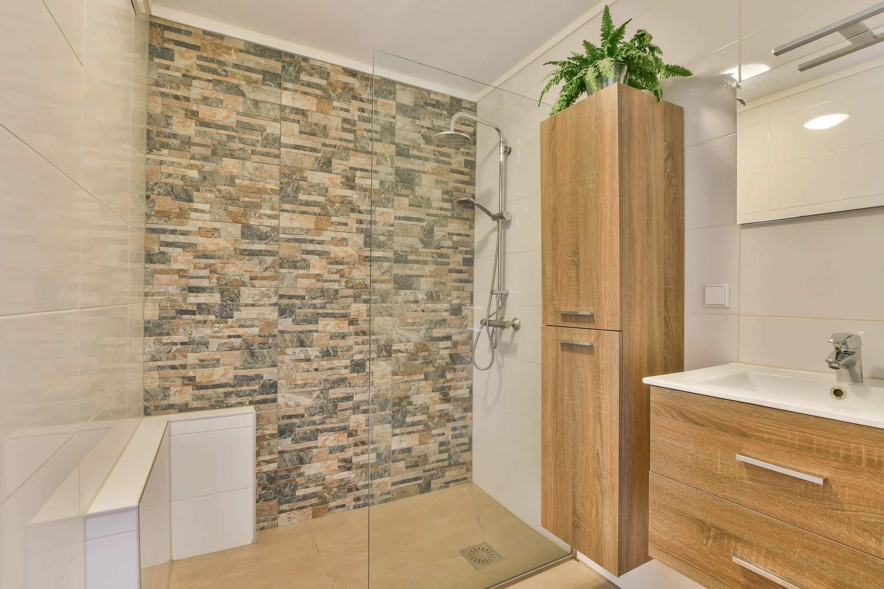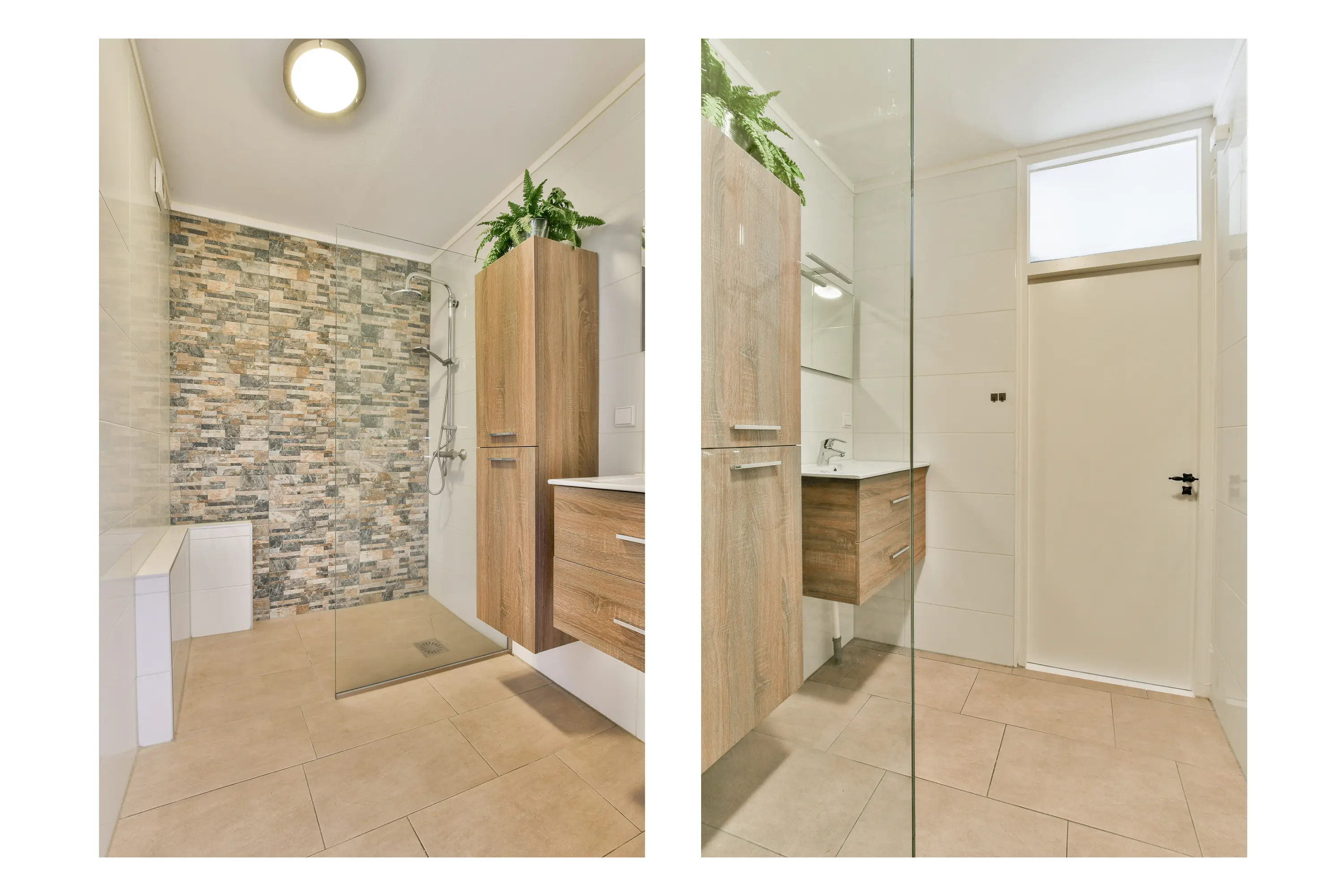Strak afgewerkte, volledig betegelde badkamer met stijlvol badkamermeubel en een royale inloopdouche met glazen douchewand.