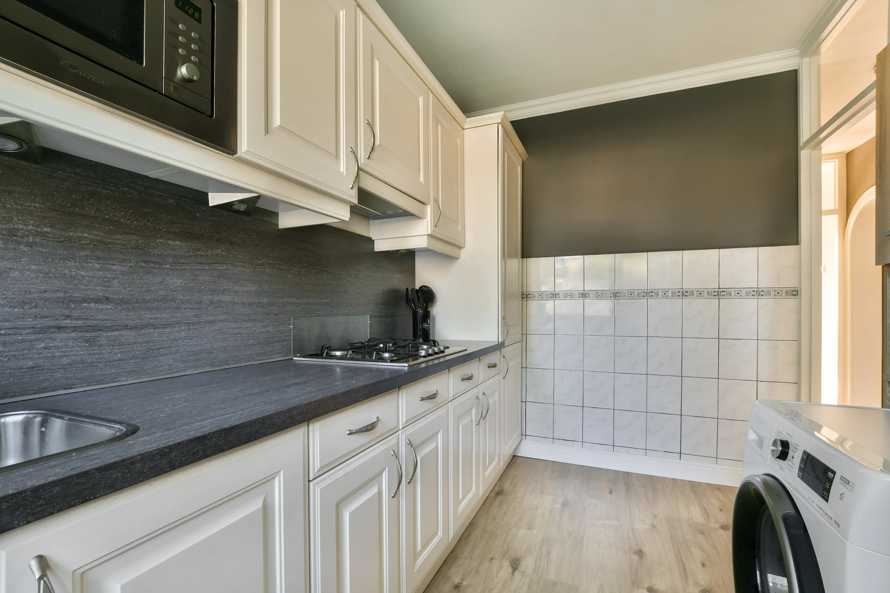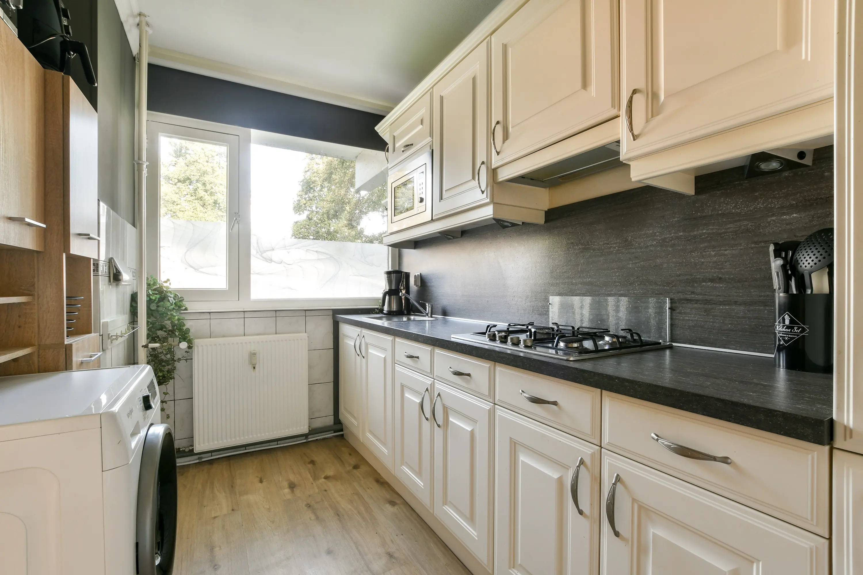 Gelegen aan de galerijzijde. Moderne inbouwkeuken, compleet uitgerust met diverse apparatuur zoals een gaskookplaat, vlakscherm-afzuigkap, magnetron, koel-vriescombinatie en aansluitingen voor wasmachine en droger.