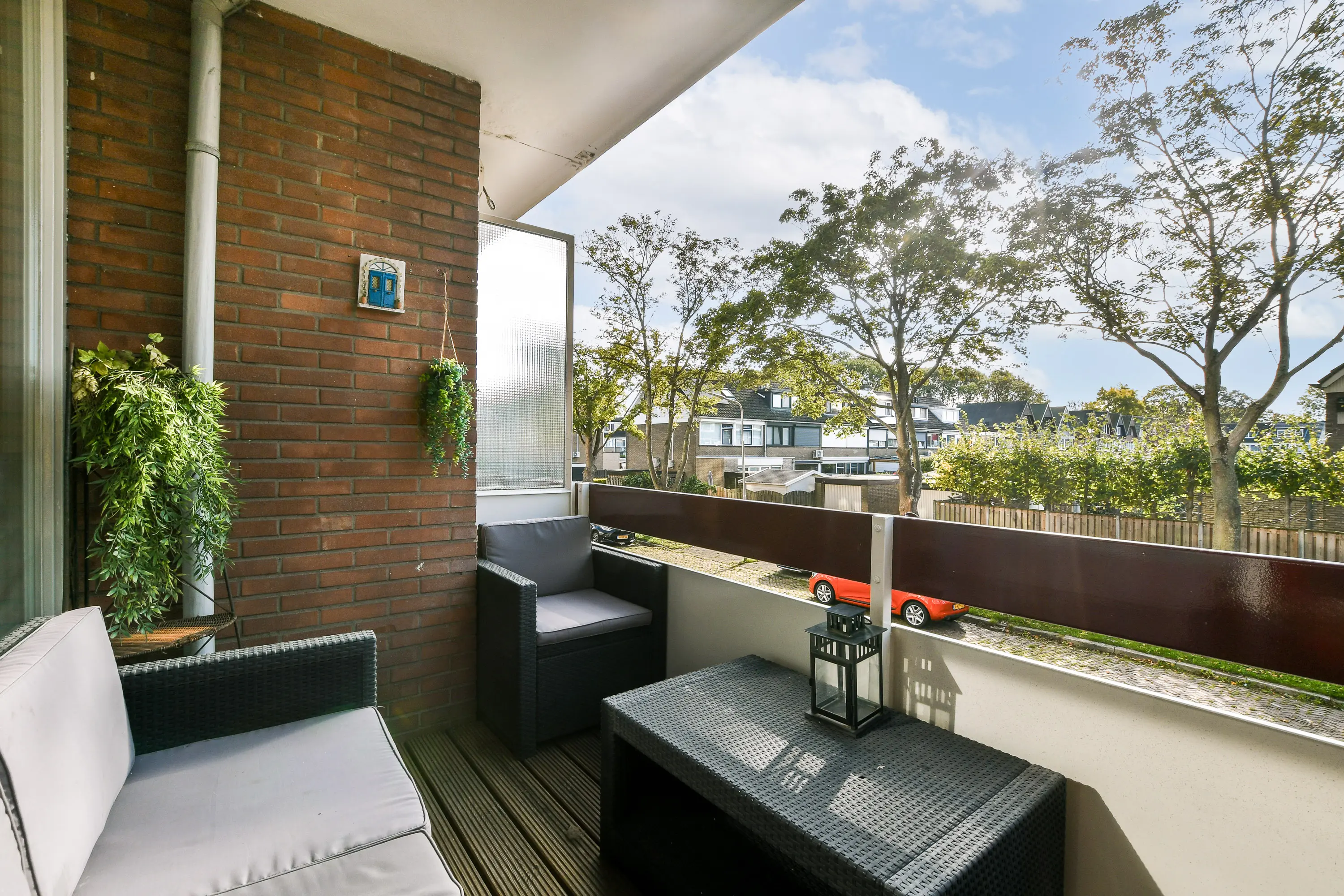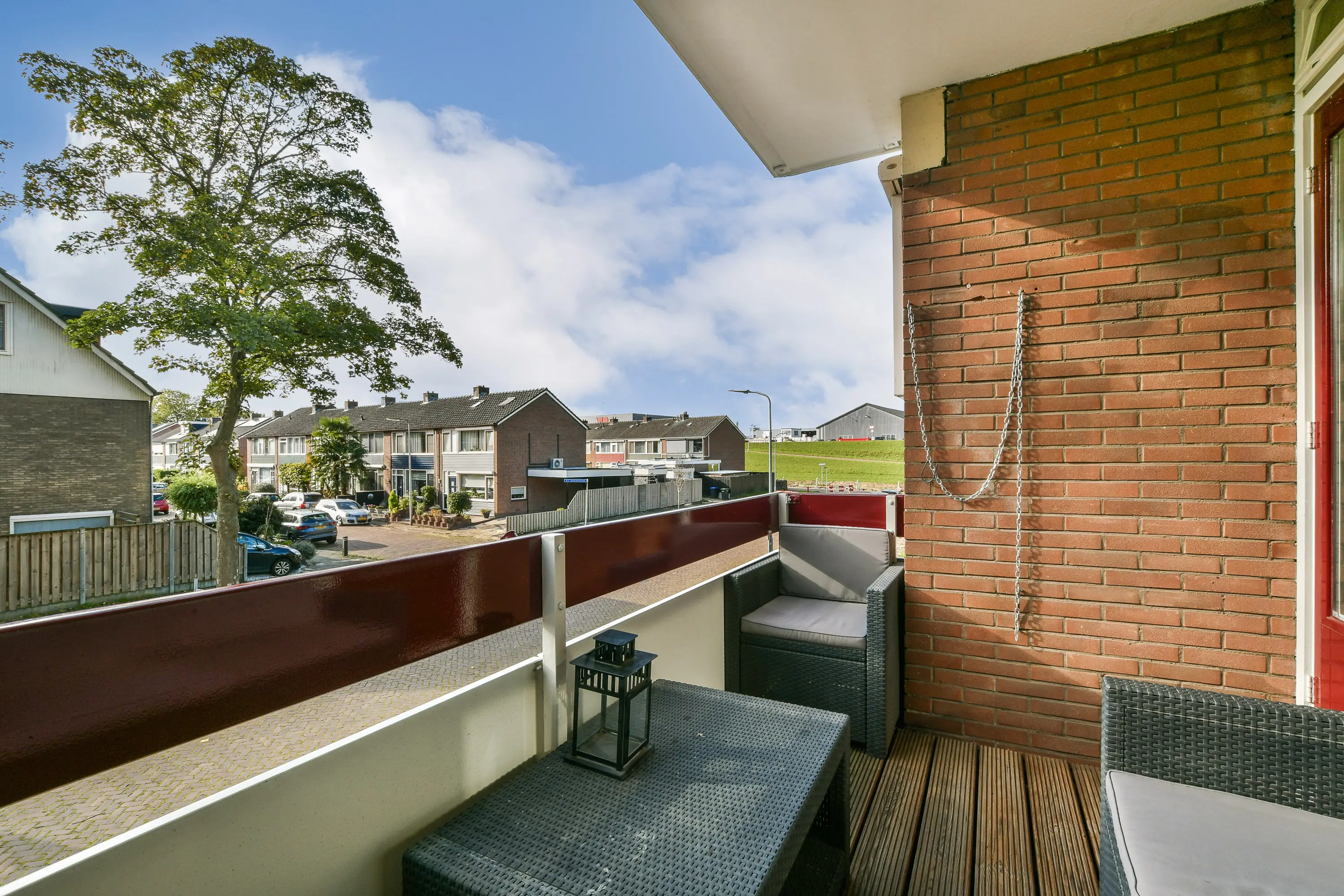 Zonnig balkon van ca. 6 m², voorzien van een bankirai-vlonder en met een fraai uitzicht.