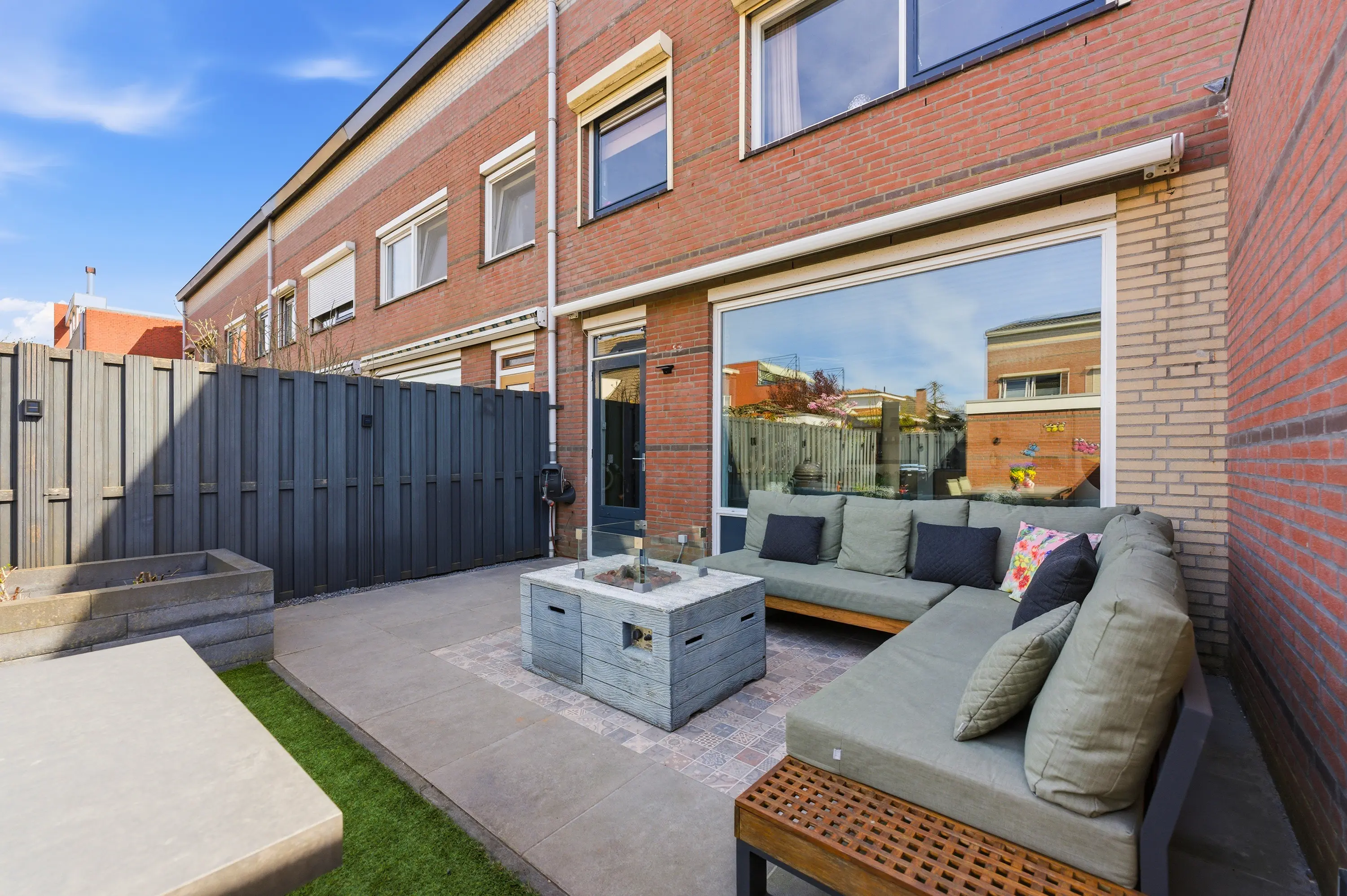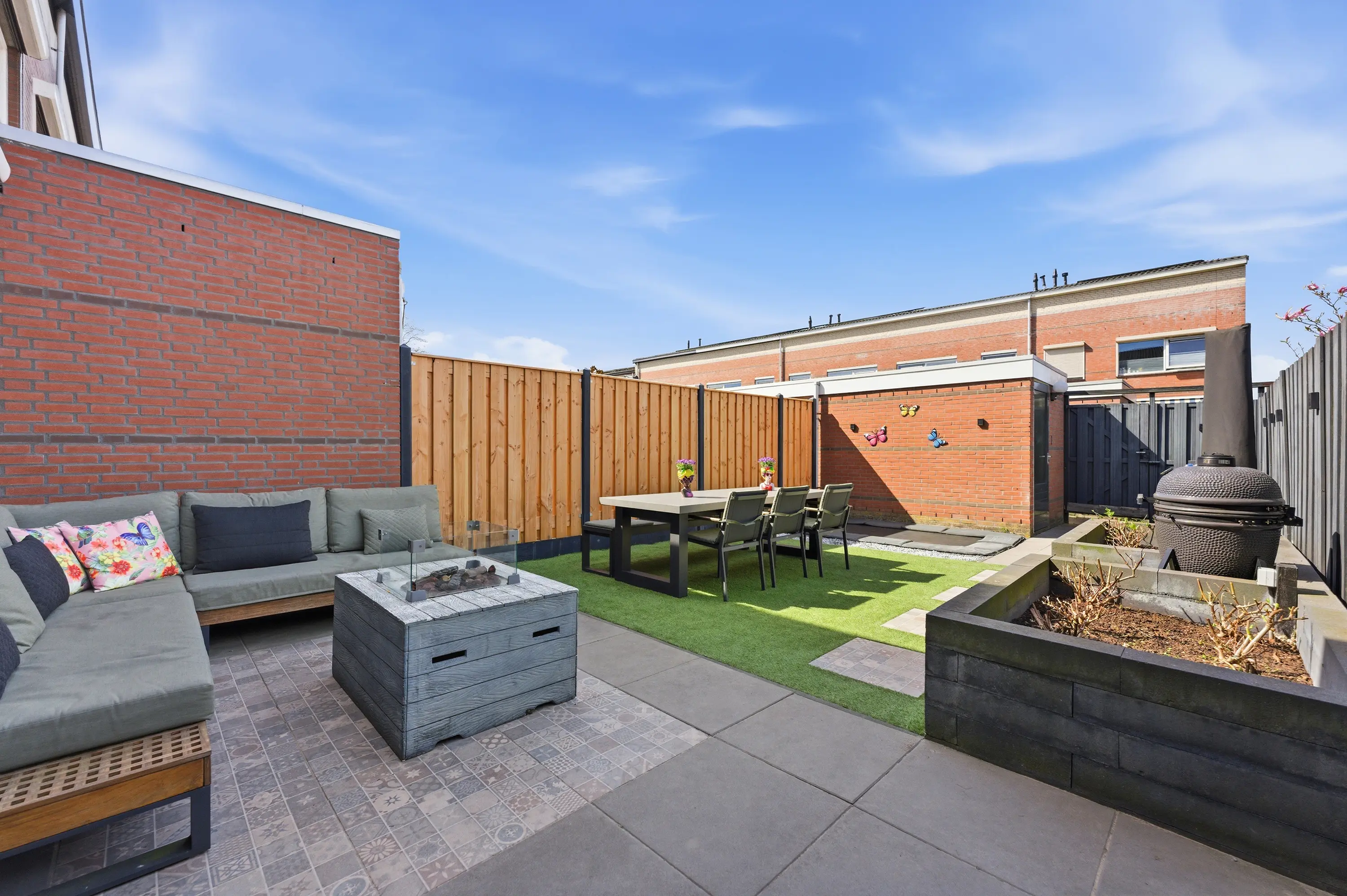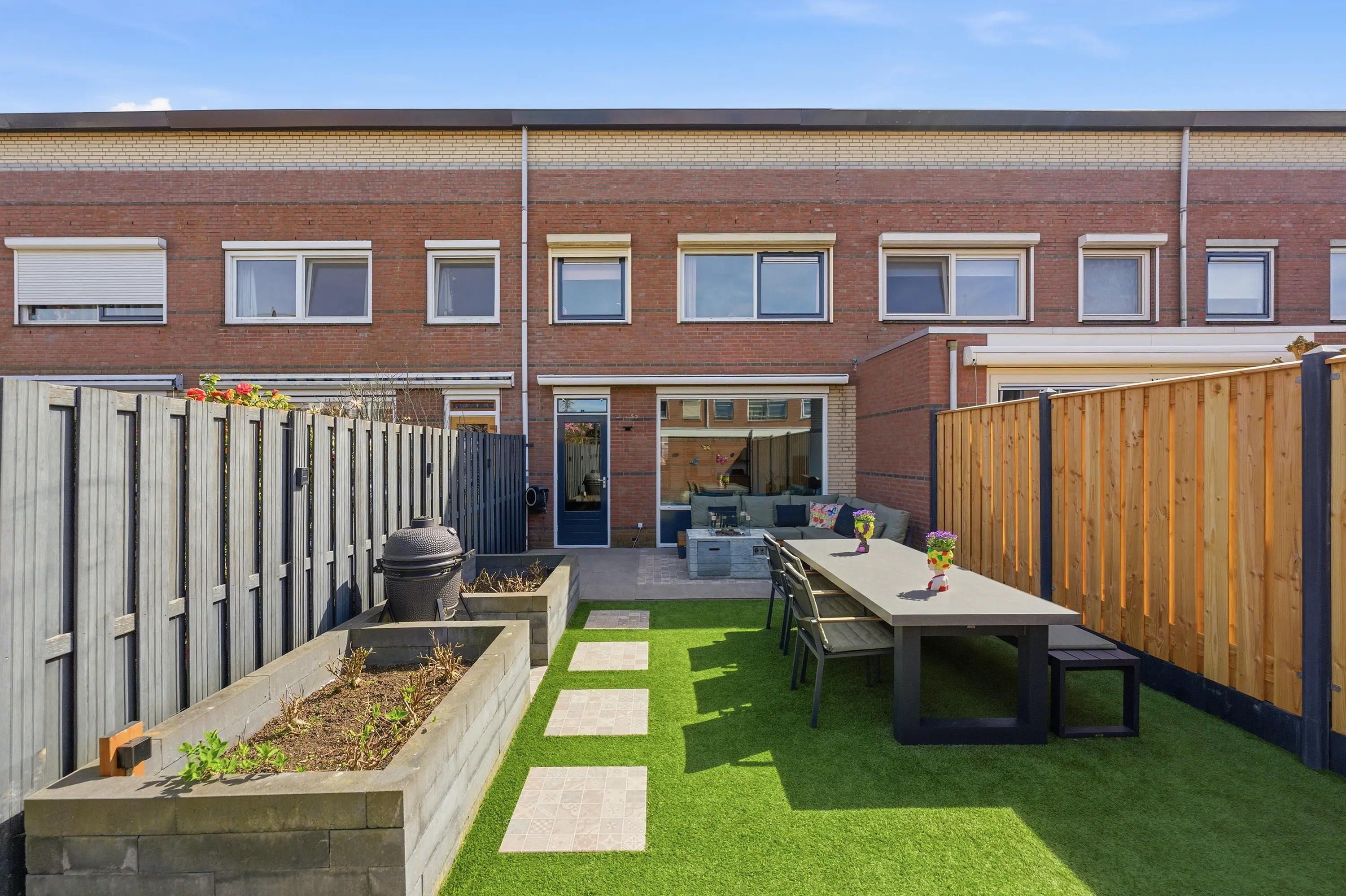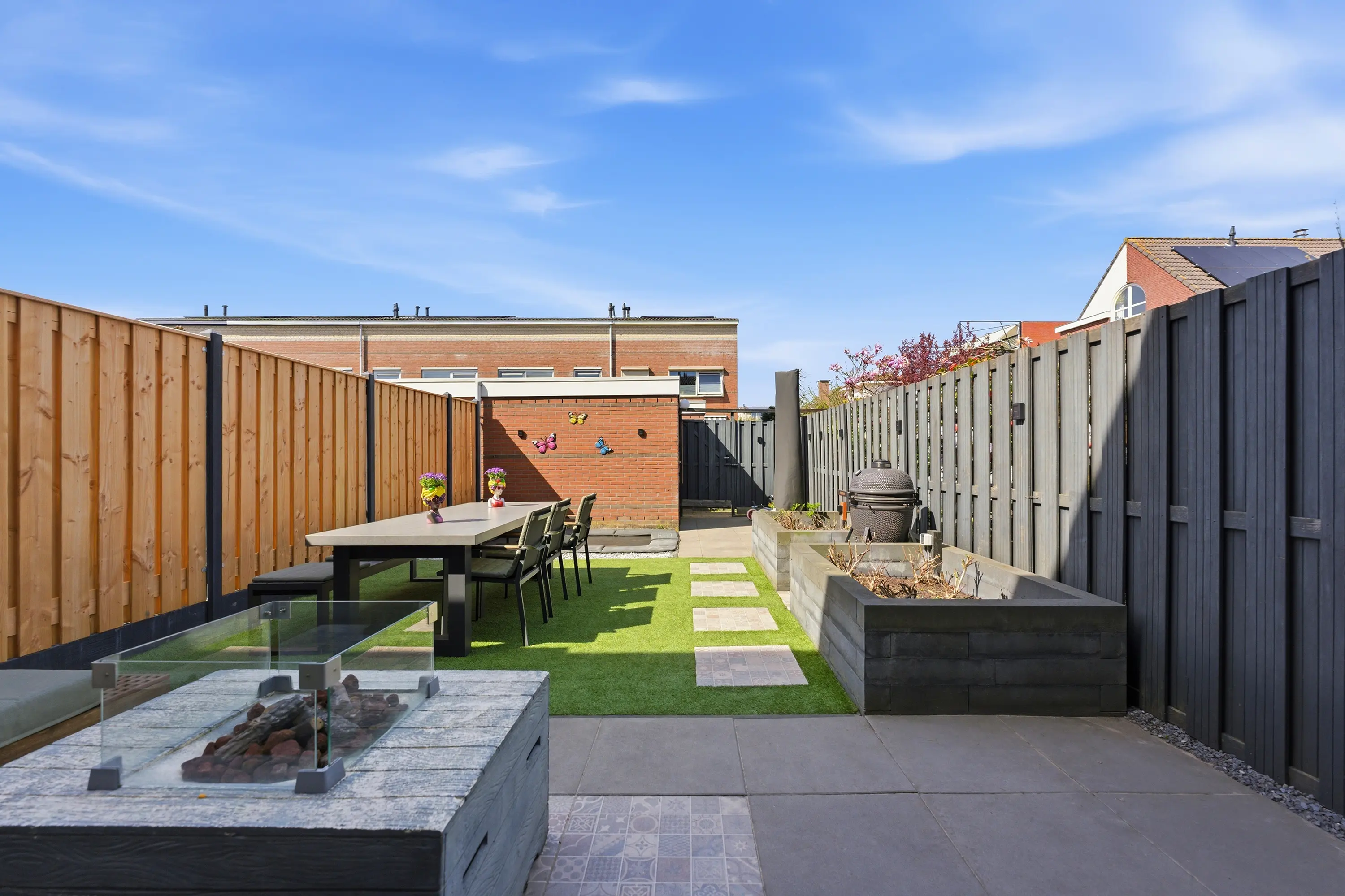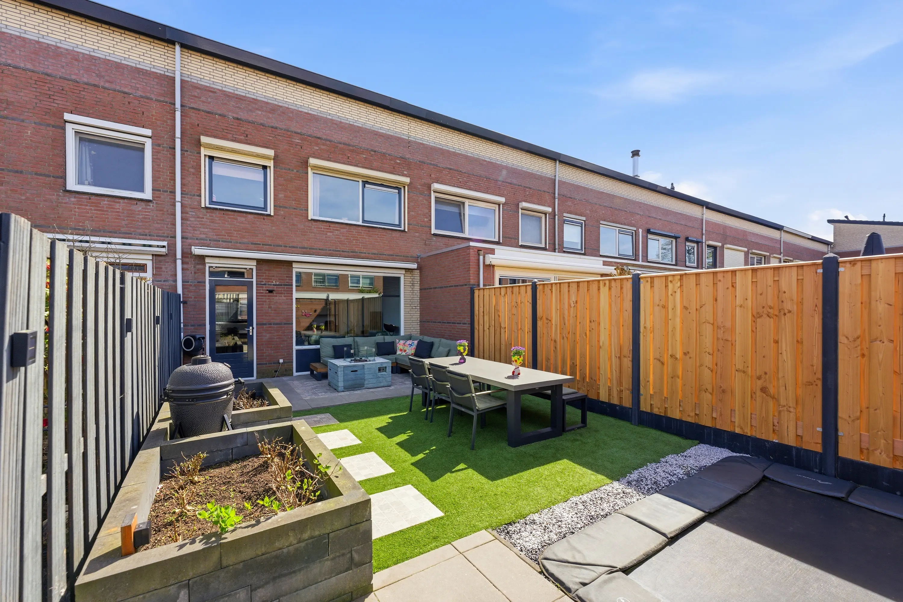De achtertuin is een heerlijke plek om te ontspannen en van het buitenleven te genieten. Strak en verzorgd aangelegd met een ruim terras direct aan de woning en een gazon van kunstgras. Achterin de tuin staat een stenen berging en uiteraard is er een achterom aanwezig.