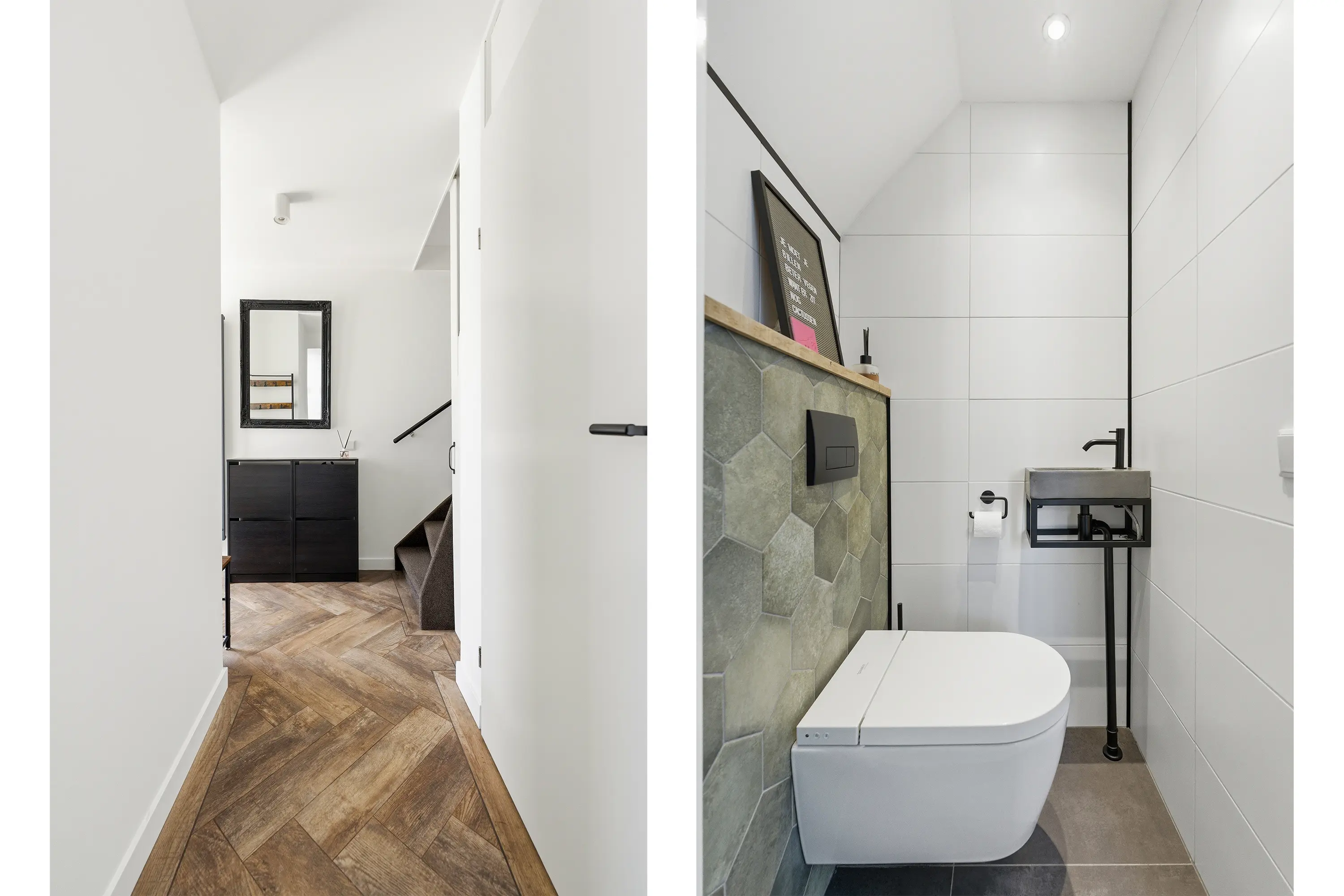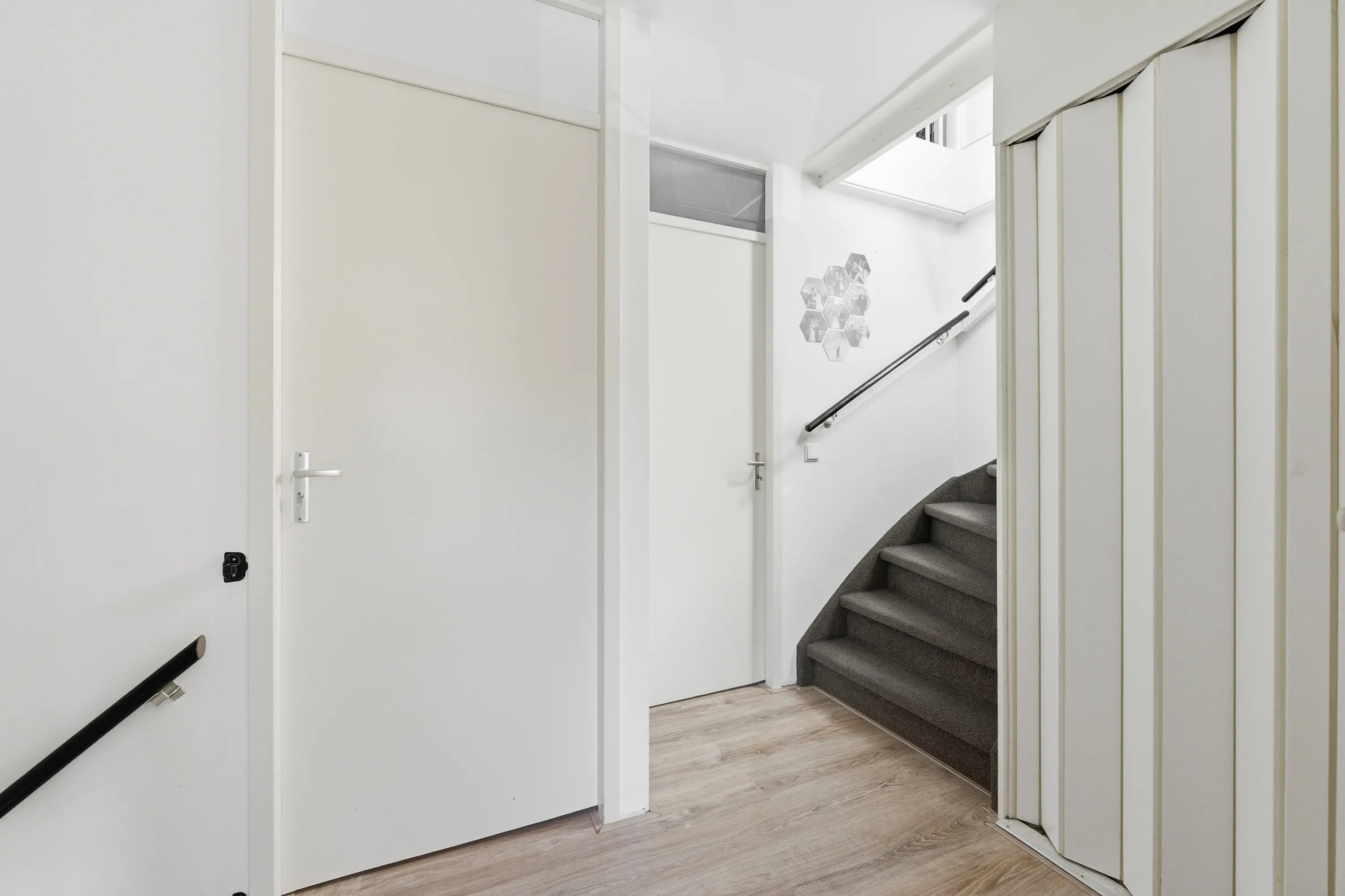 Entree in de hal met de meterkast, een moderne toiletruimte, de trapopgang naar de eerste verdieping en een praktische trapkast. Vanuit de hal is er toegang tot de woonkamer.