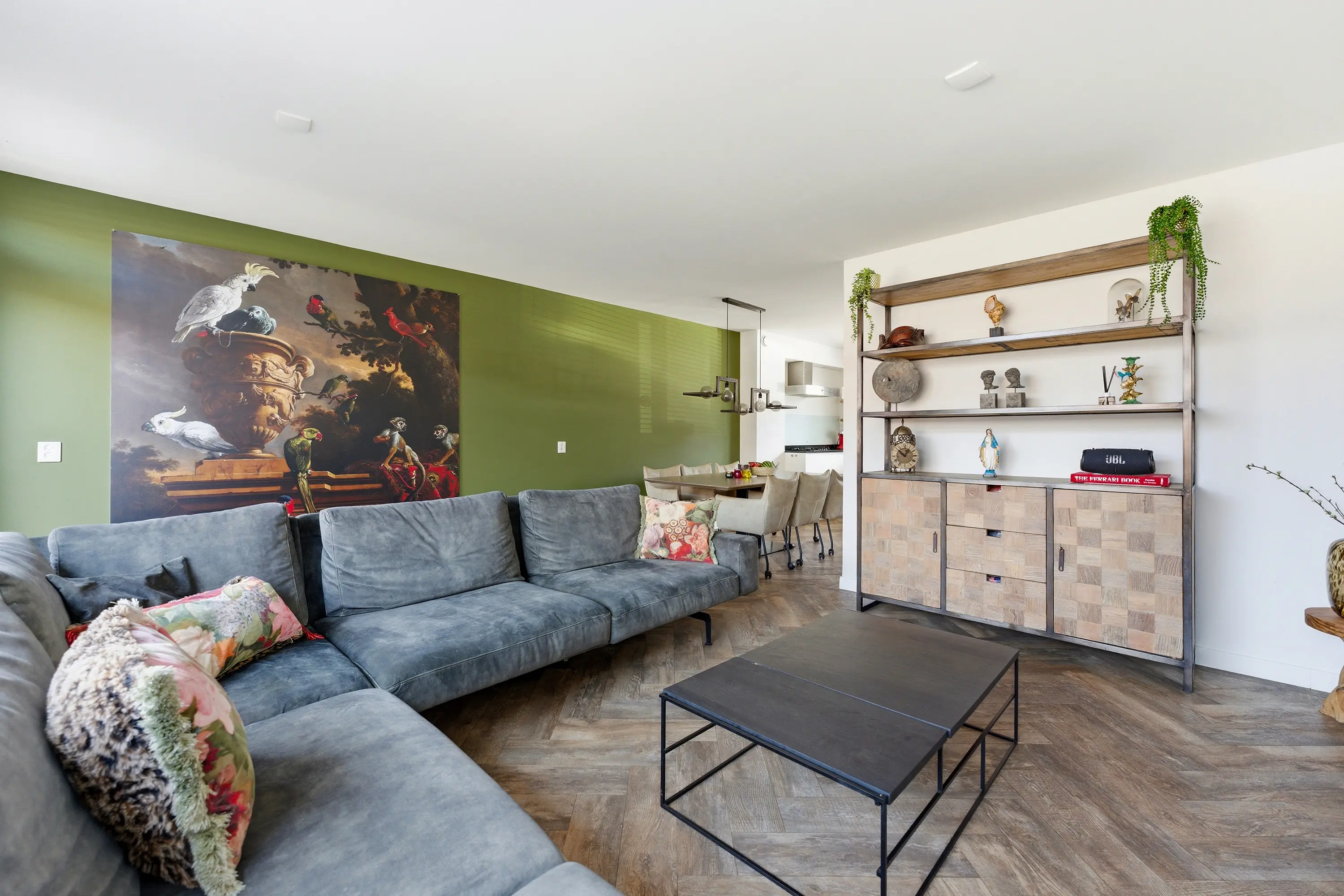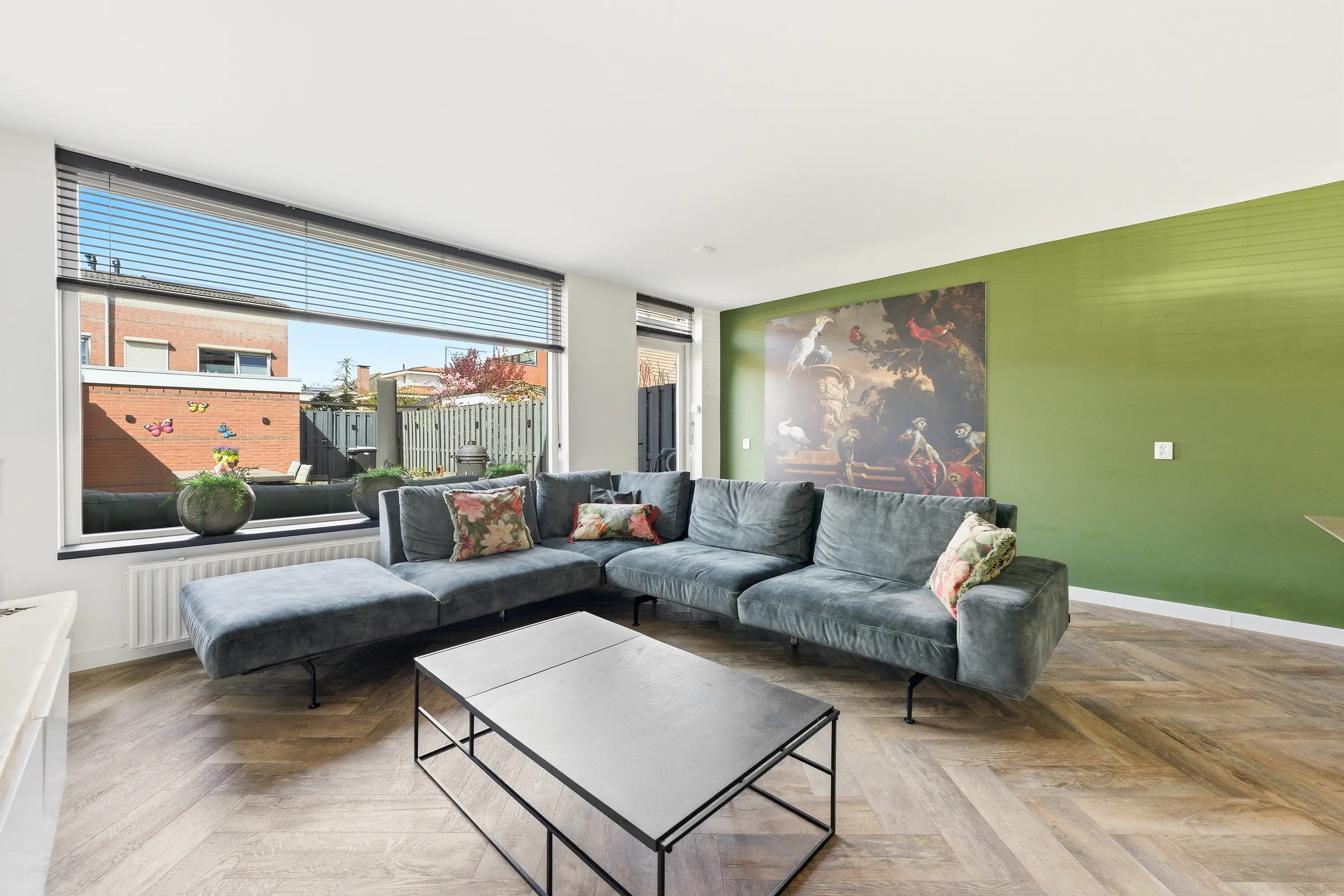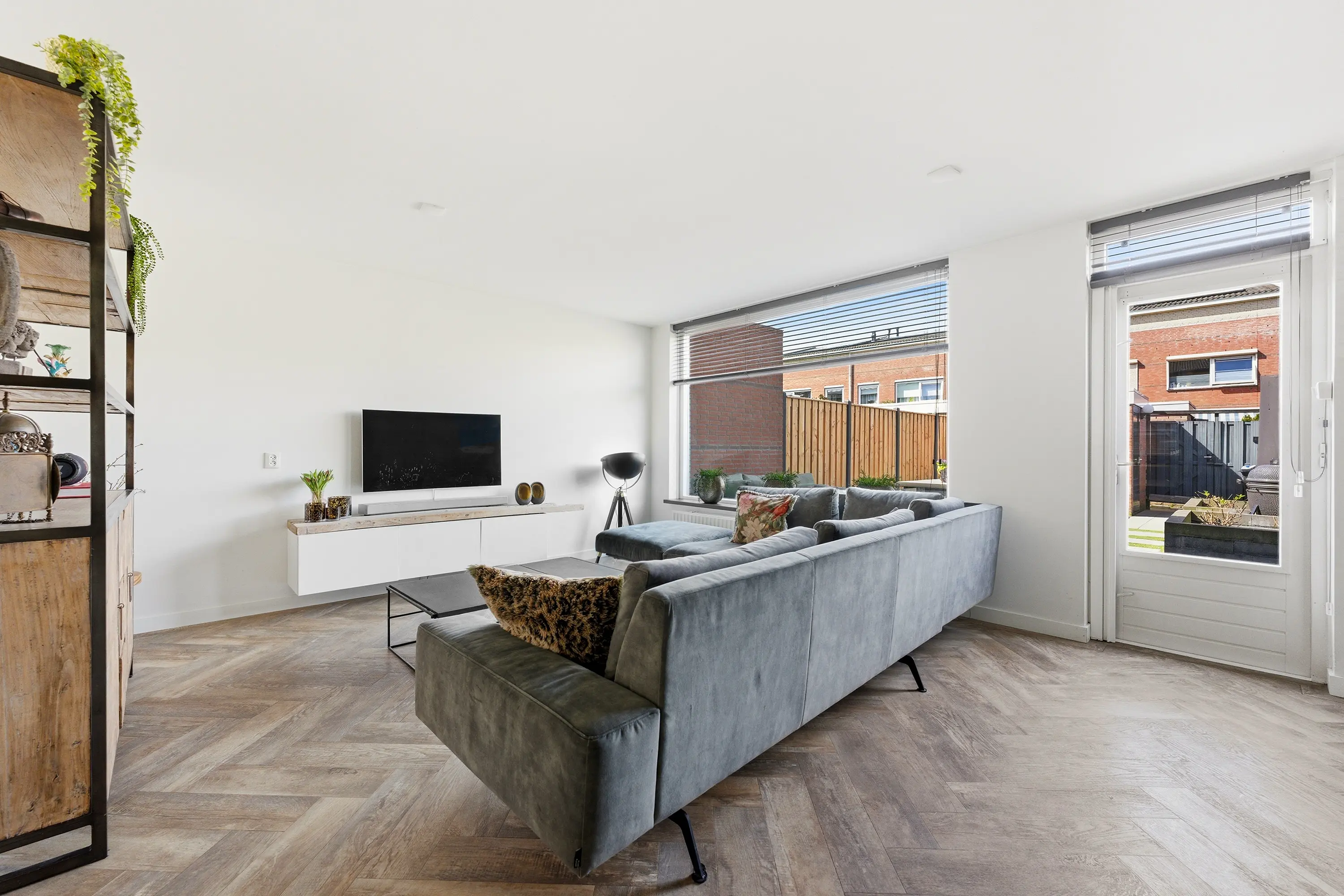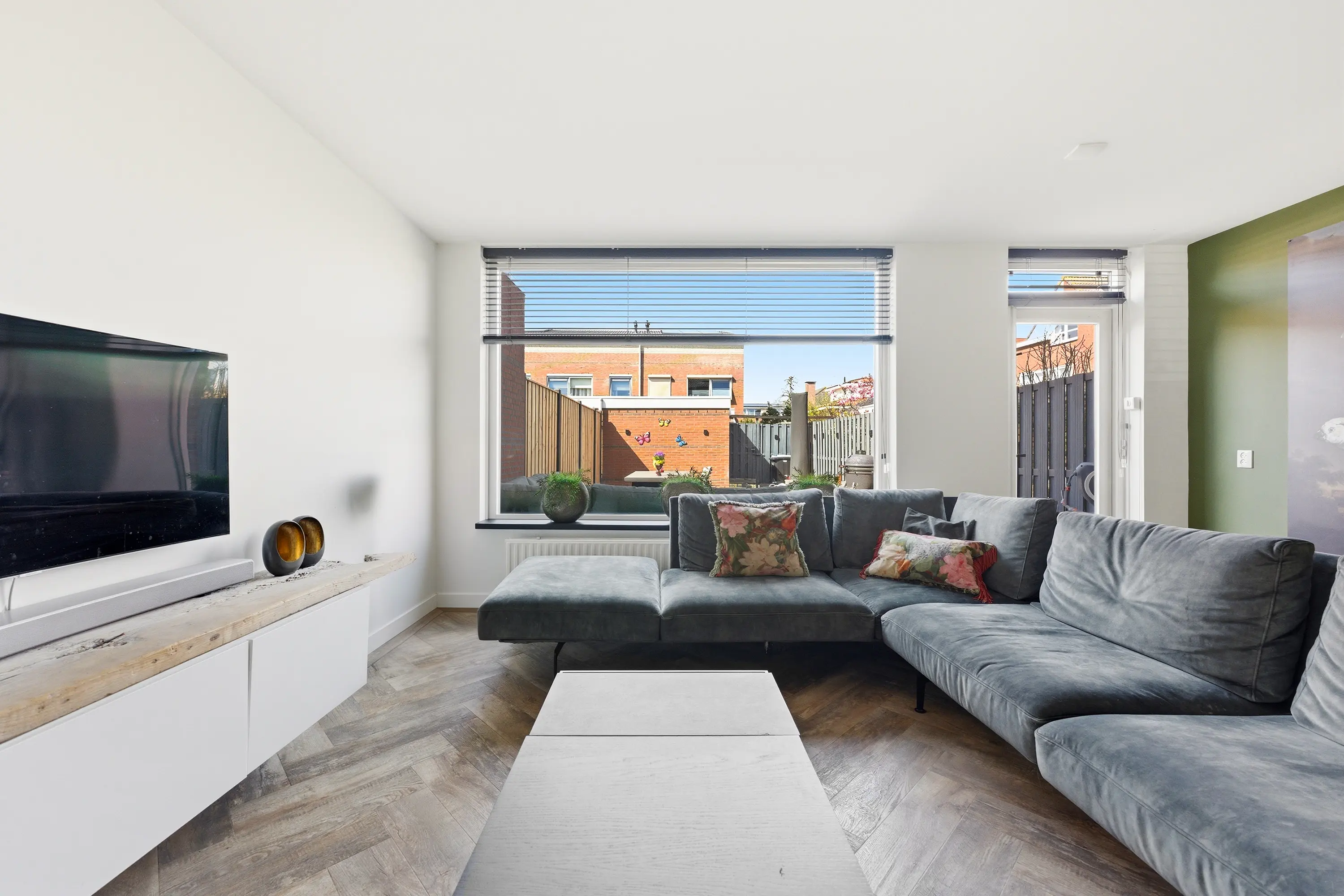 Lichte, tuingerichte woonkamer met grote raampartijen en een zonwering, wat zorgt voor een prettige lichtinval. Via de loopdeur is de achtertuin bereikbaar. De woonkamer staat in open verbinding met de keuken aan de voorzijde.