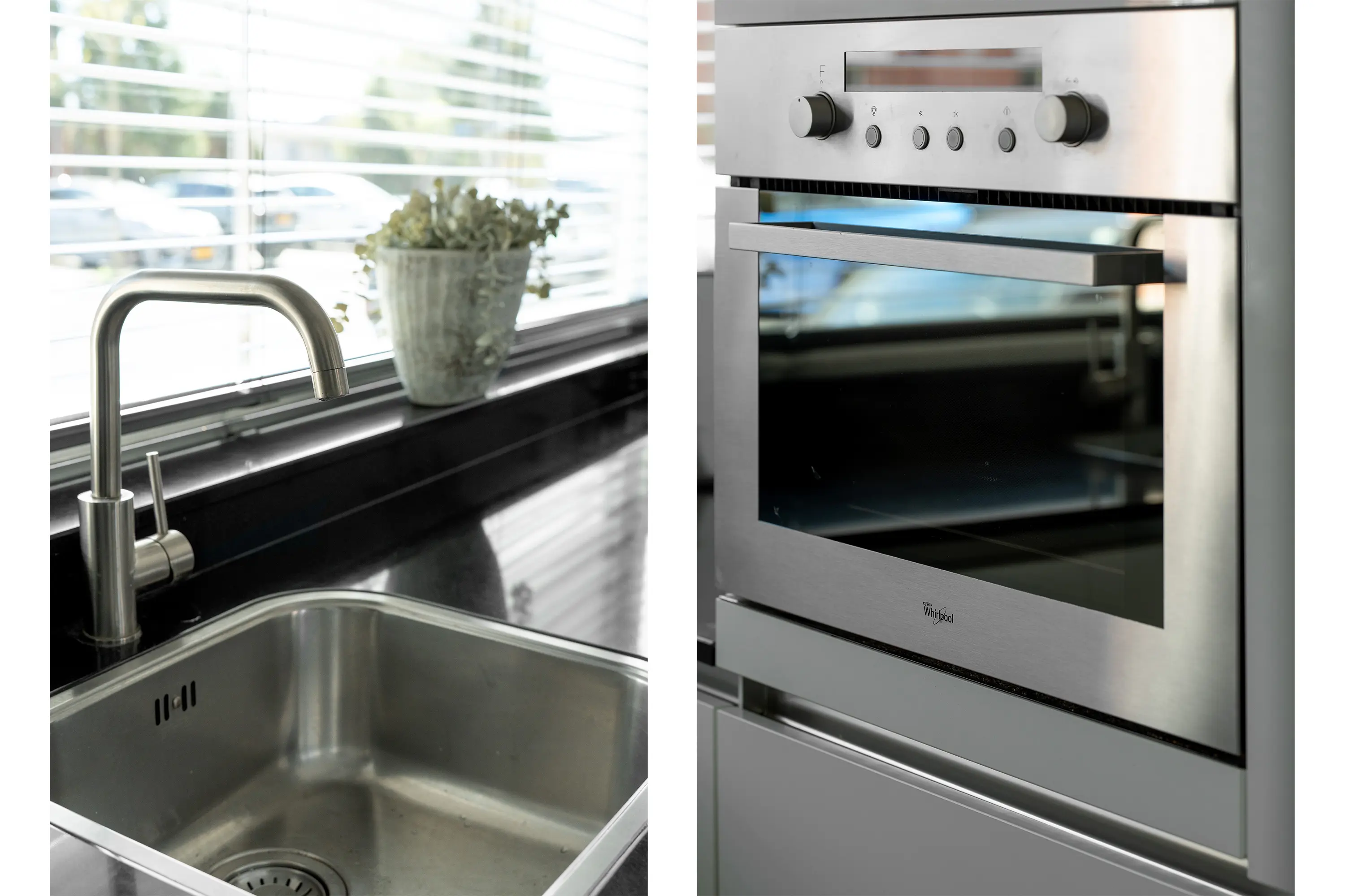 De keuken is opgesteld in een praktische U-vorm. Uitgevoerd in een neutrale kleurstelling met een stijlvol contrasterend granieten werkblad. Voorzien van diverse kasten en laden en de volgende inbouwapparatuur: 4-pits gaskookplaat, RVS-afzuigkap, vaatwasser, combi-oven, plintverwarming en een koelkast met vriesvak.