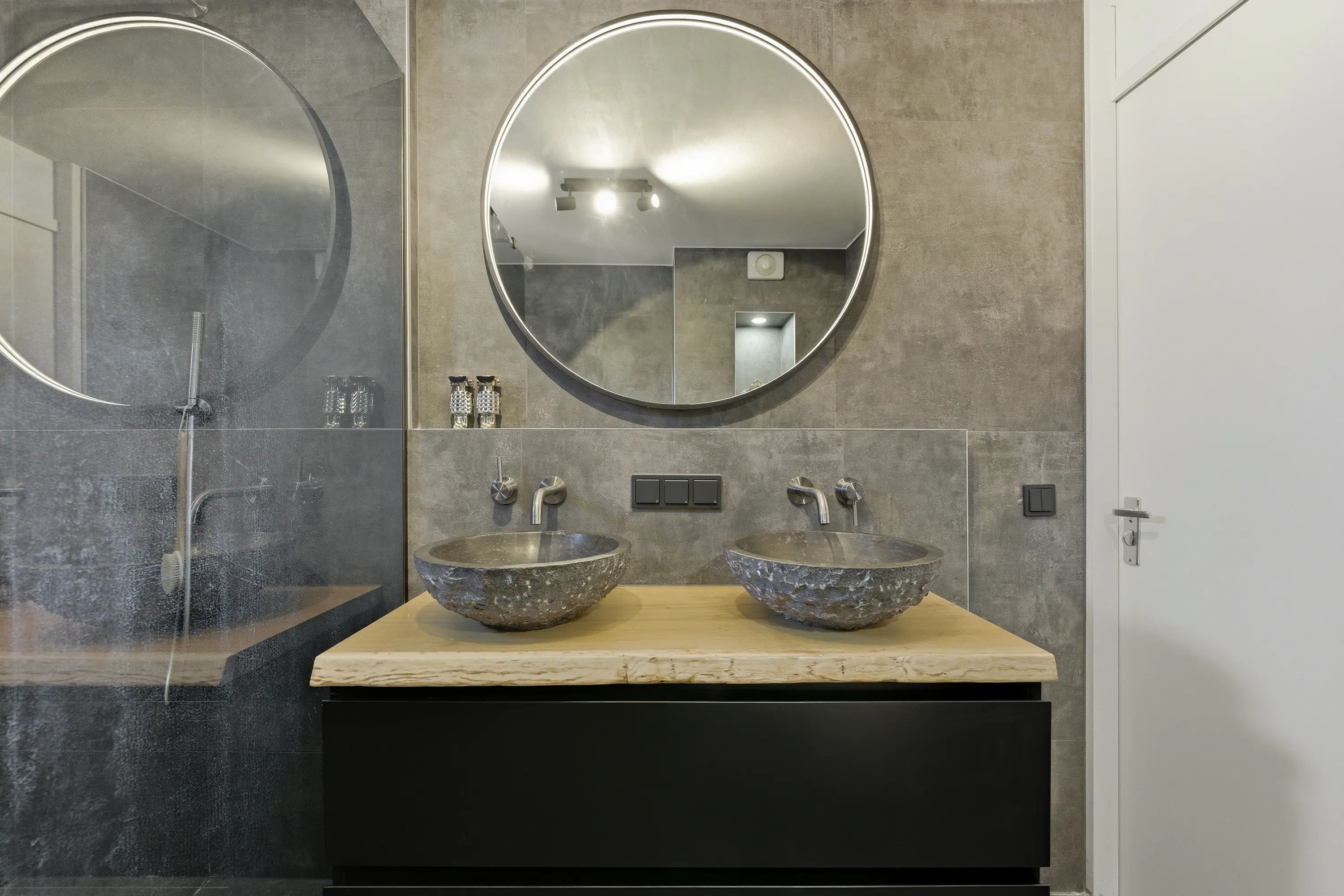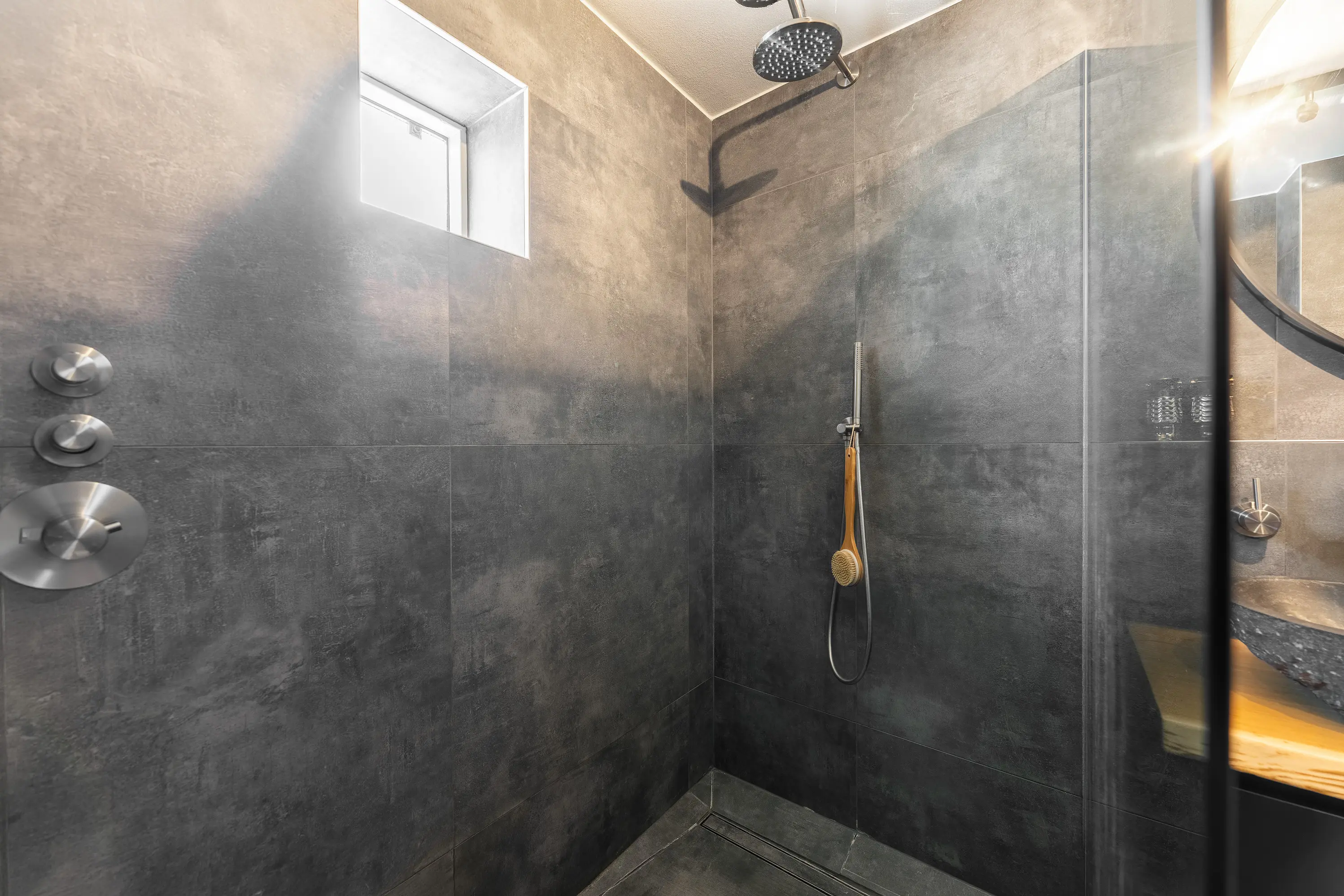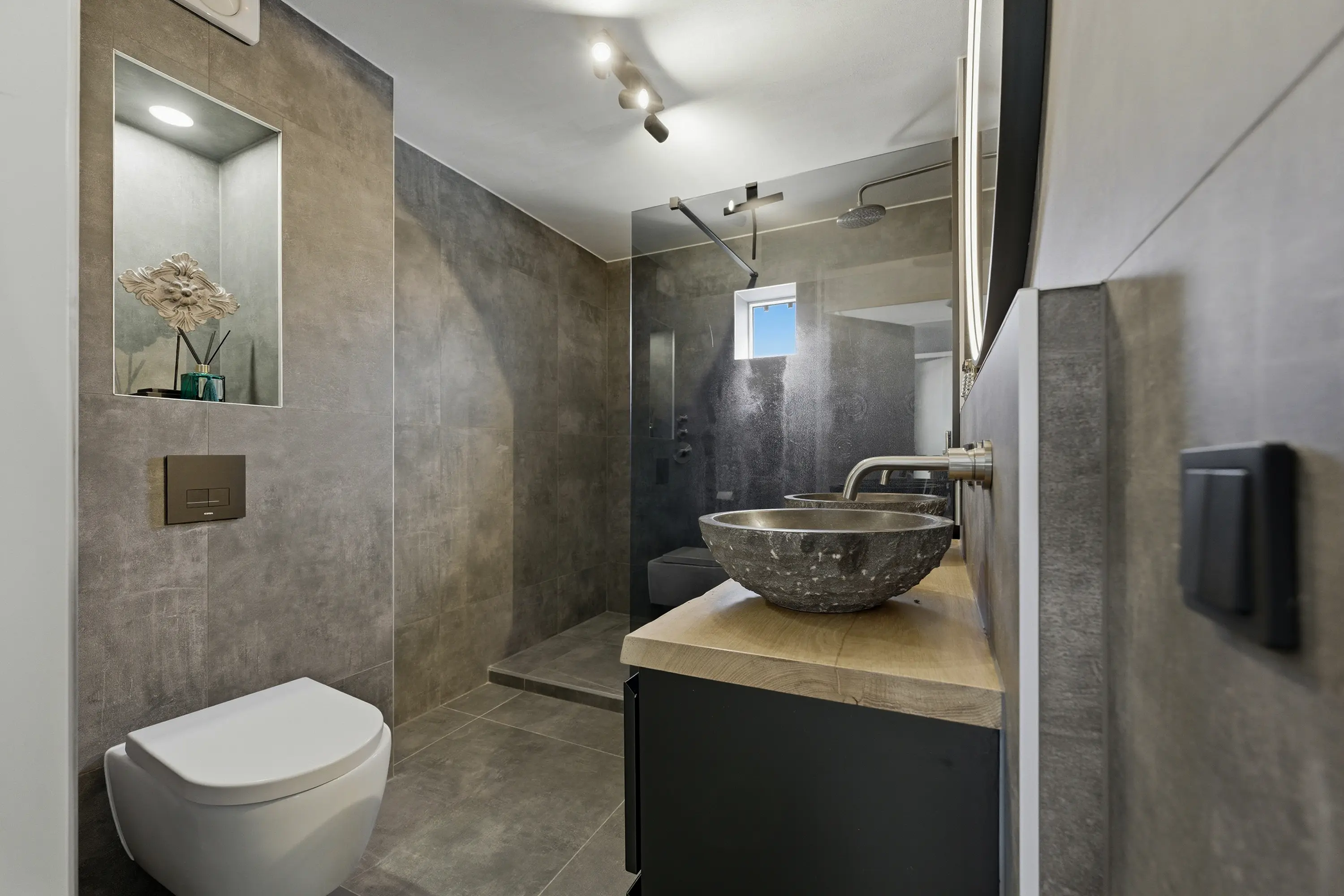 Luxe en volledig betegelde badkamer met fraaie wand- en vloertegels en elektrische vloerverwarming. Uitgerust met een inloopdouche (regendouche en handdouche), een wandcloset en een dubbel wastafelmeubel met fraaie waskommen.