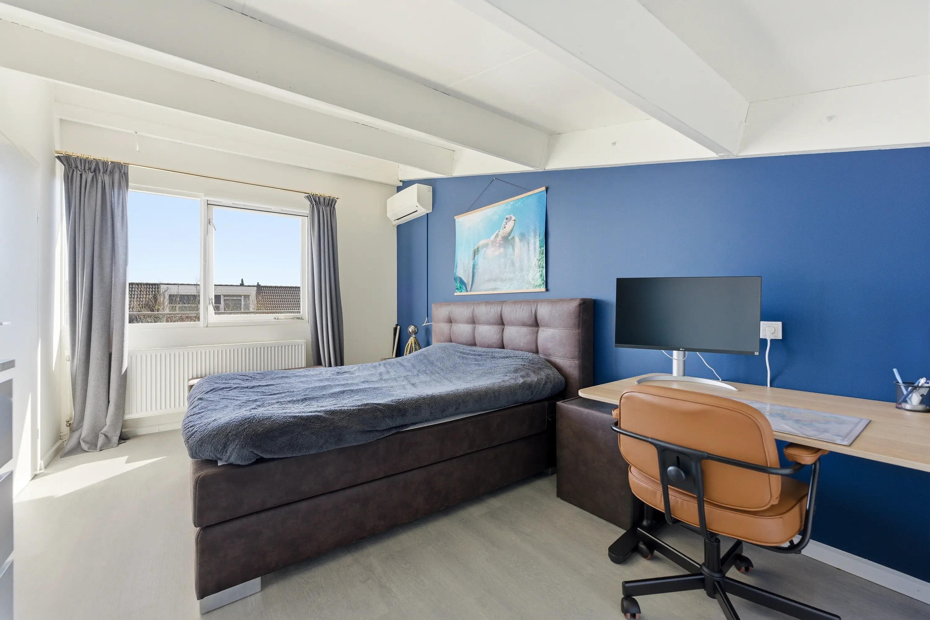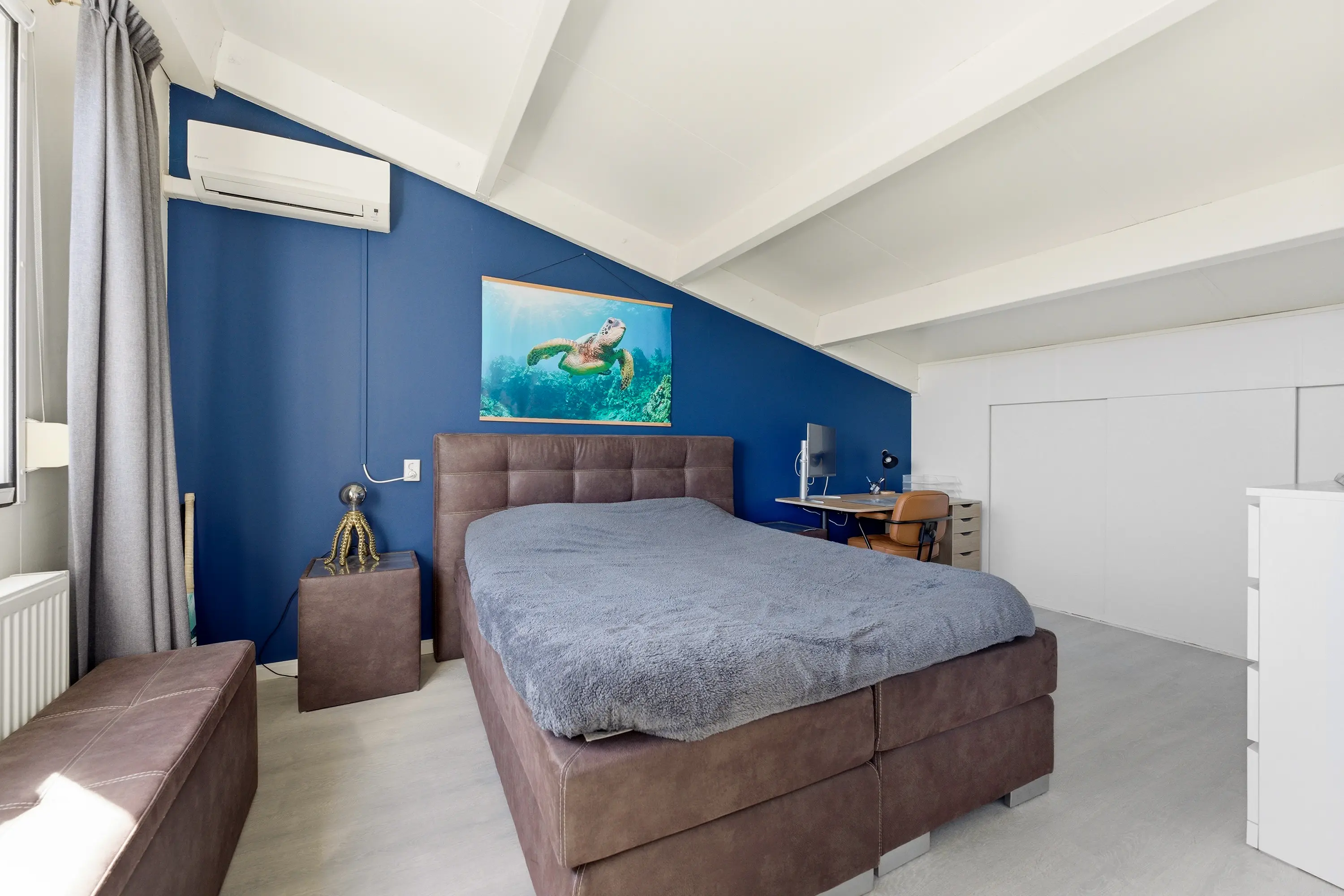 Riante en sfeervolle slaapkamer met bergruimte achter de knieschotten en voorzien van airconditioning. Dankzij de grote ramen en de hoge nok heeft deze ruimte een extra ruimtelijk gevoel. Ook deze kamer beschikt over een rolluik.