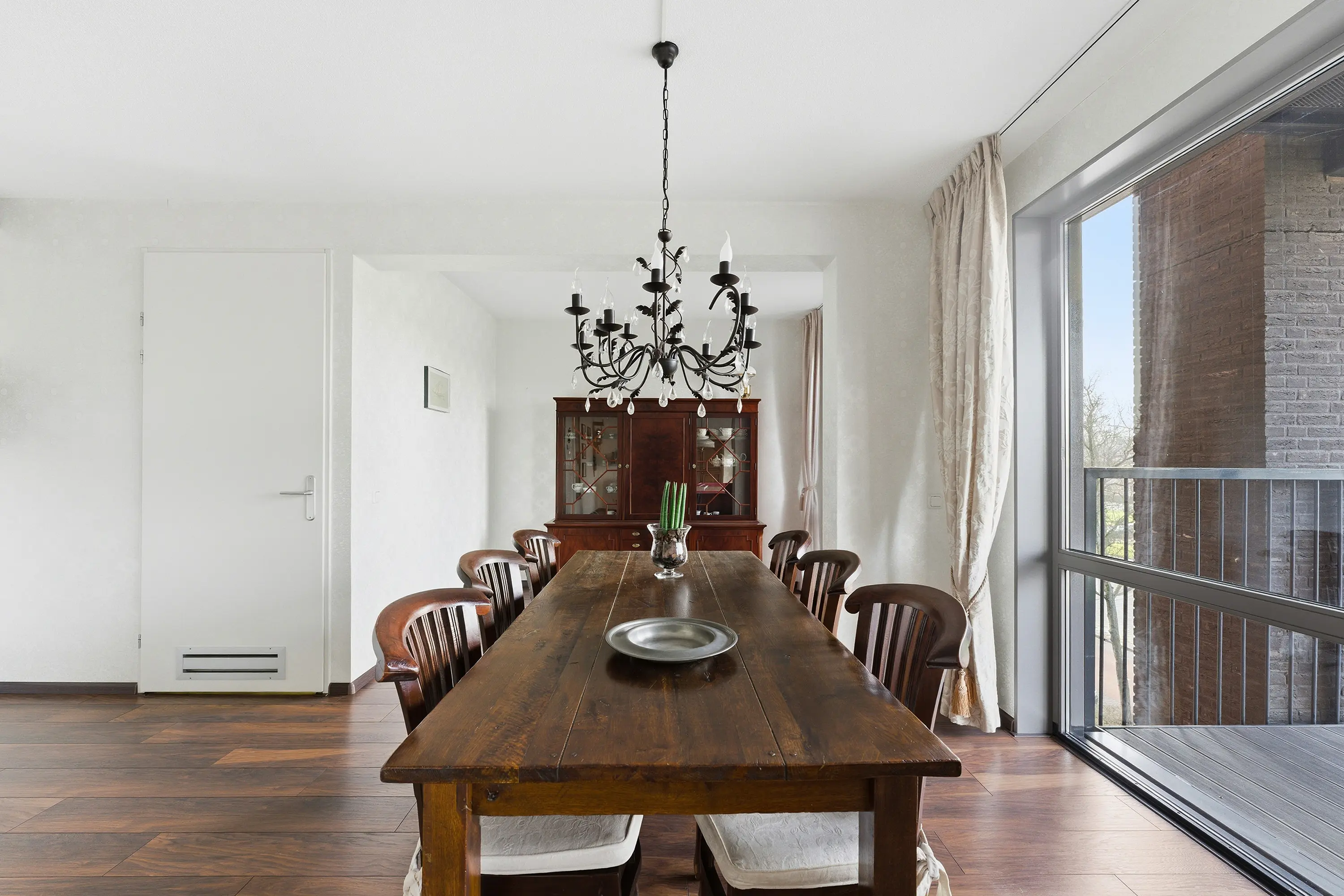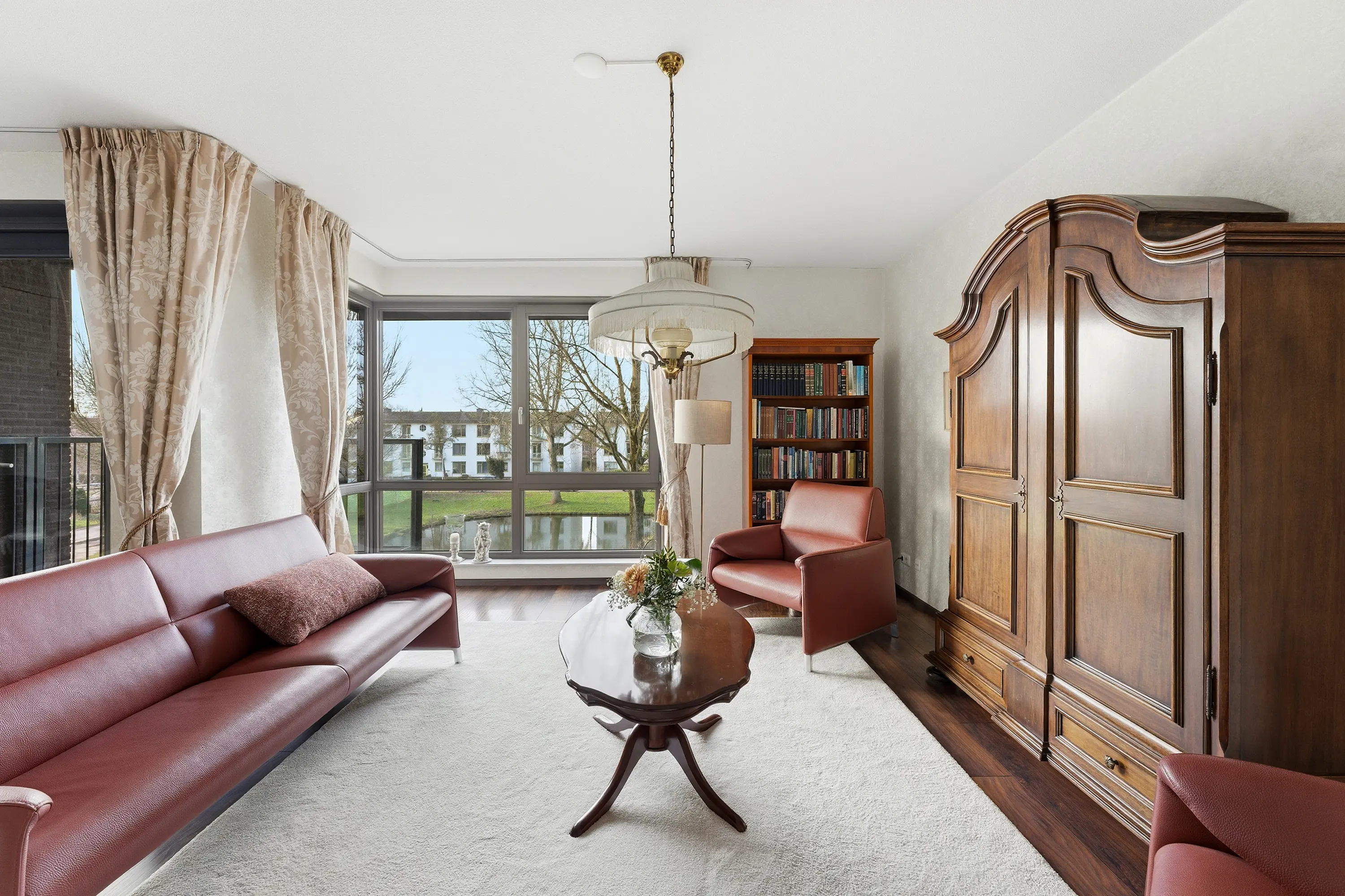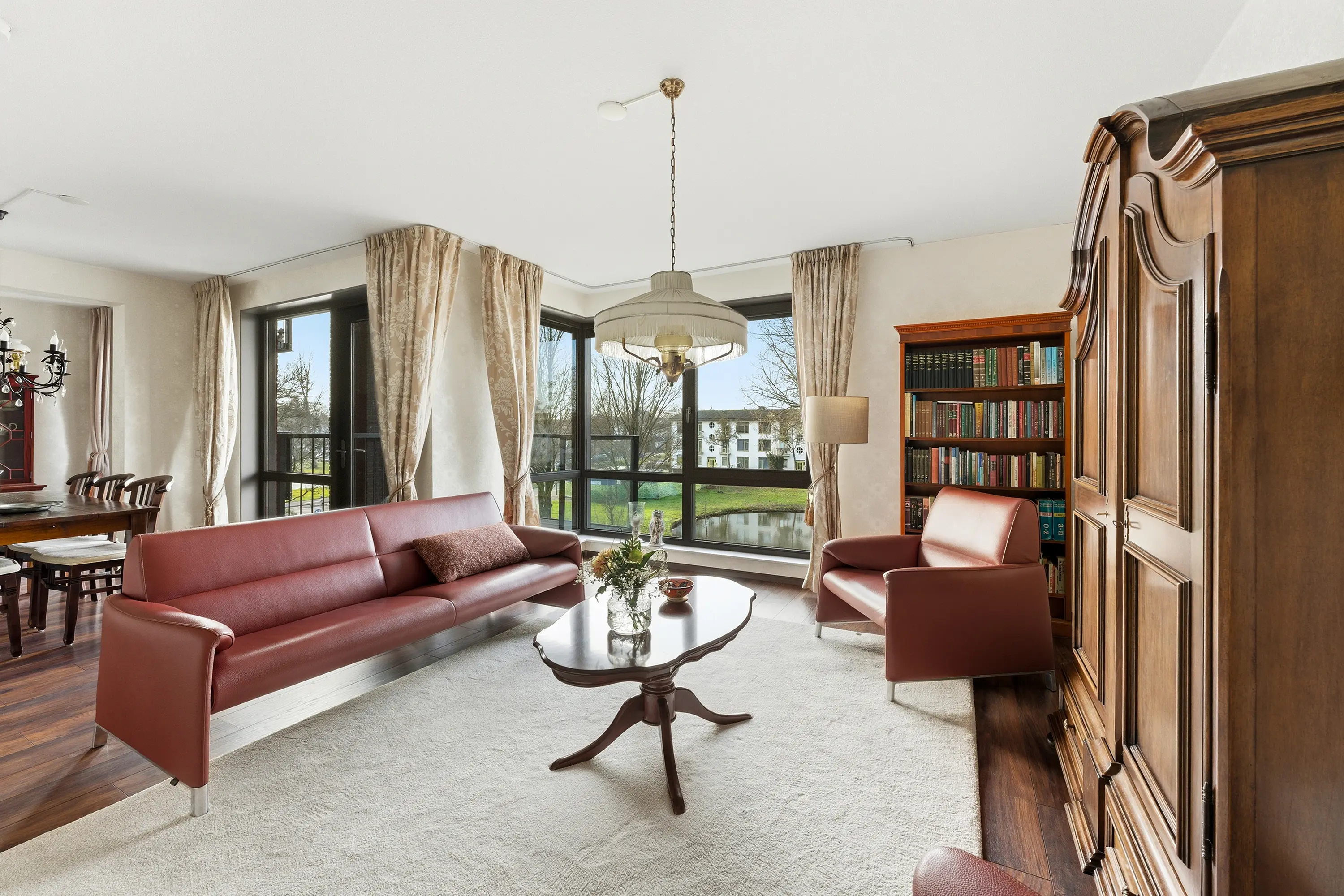 Vanuit de hal komt u in de ruime en lichte woonkamer met grote ramen tot aan de grond. Deze zorgen voor een prettige lichtinval en een ruimtelijk gevoel. De woonkamer staat in directe verbinding met het eetgedeelte, dat extra royaal is doordat een voormalige slaapkamer bij de ruimte is betrokken. Via een loopdeur bereikt u het ruime balkon met een heerlijk vrij uitzicht op het water en het groen van de singel.