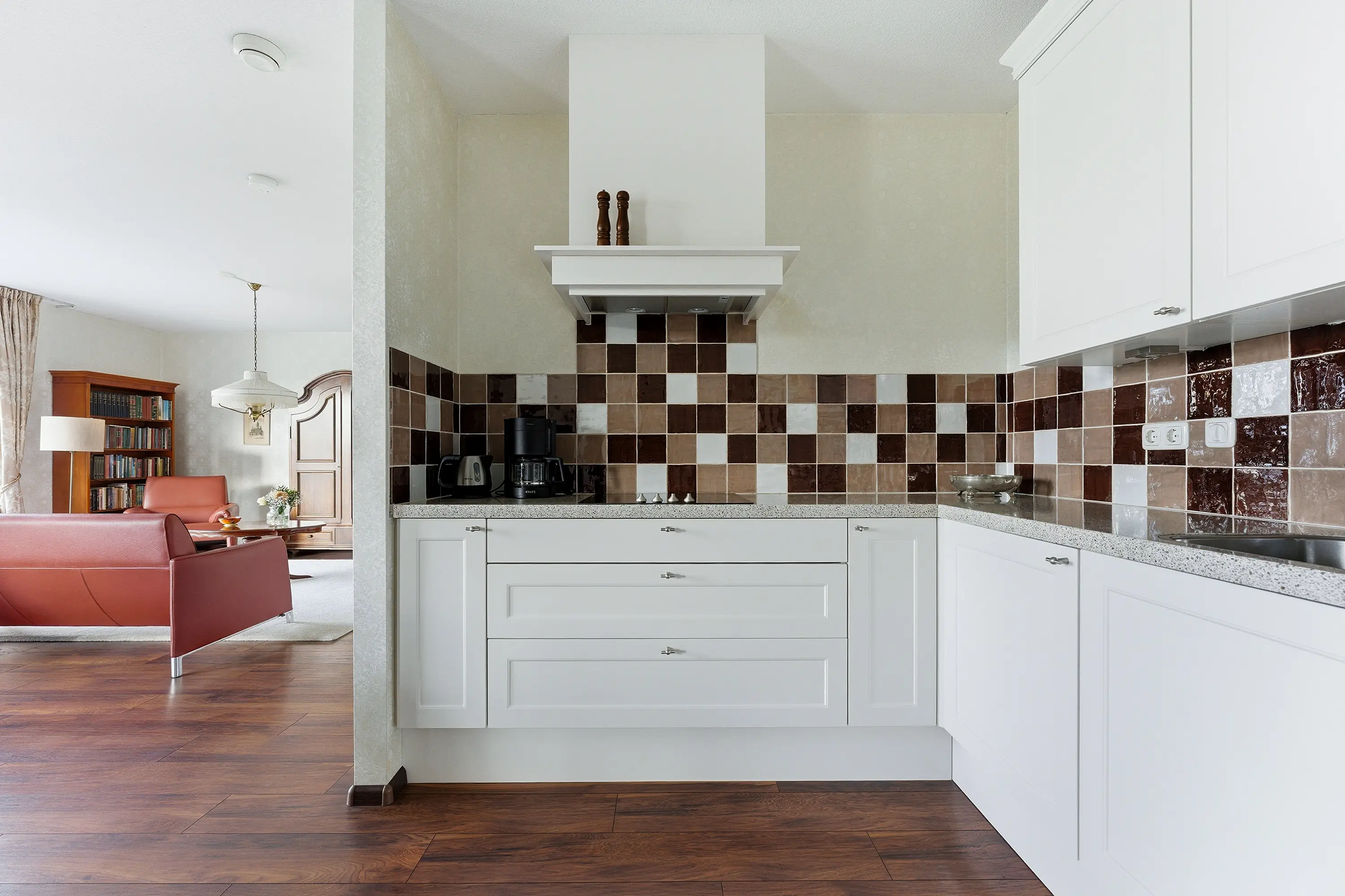 De open keuken is uitgevoerd in een praktische L-opstelling en voorzien van diverse kasten, laden en inbouwapparatuur. De keuken is netjes onderhouden en met zorg gebruikt.