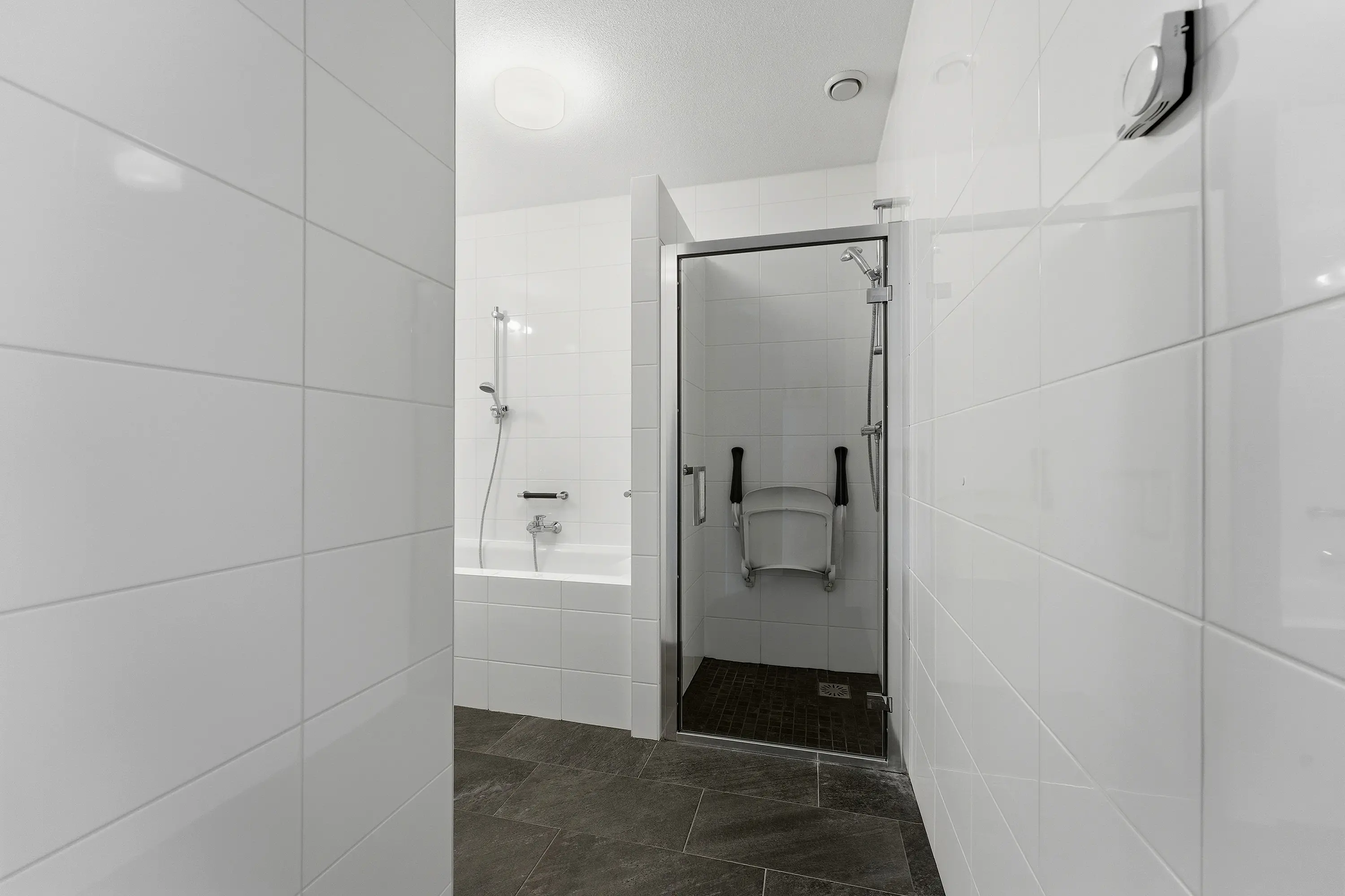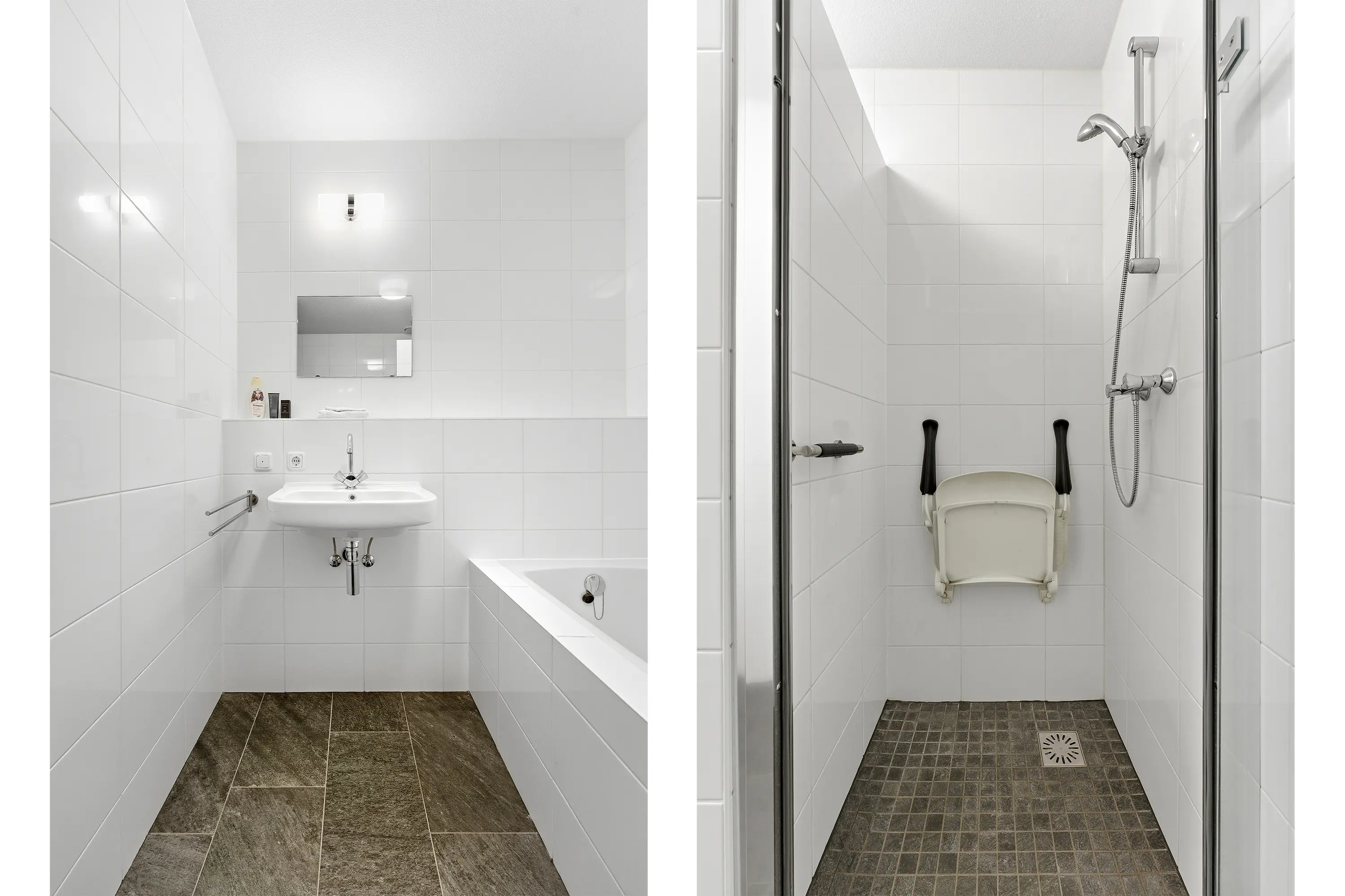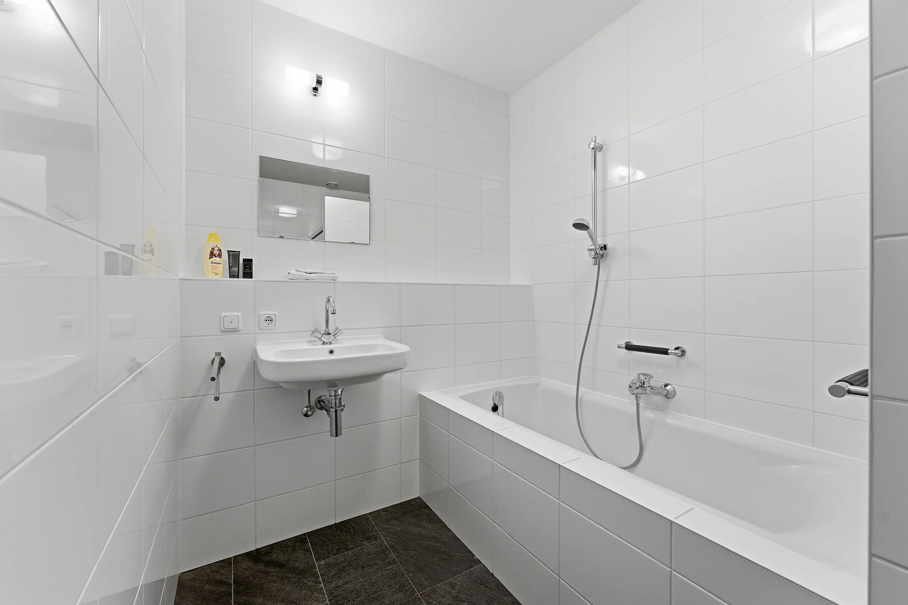 De badkamer is modern en verzorgd afgewerkt met neutrale wand- en vloertegels. Opvallend ruim opgezet en ingericht met een douche, een wastafel en een ligbad.