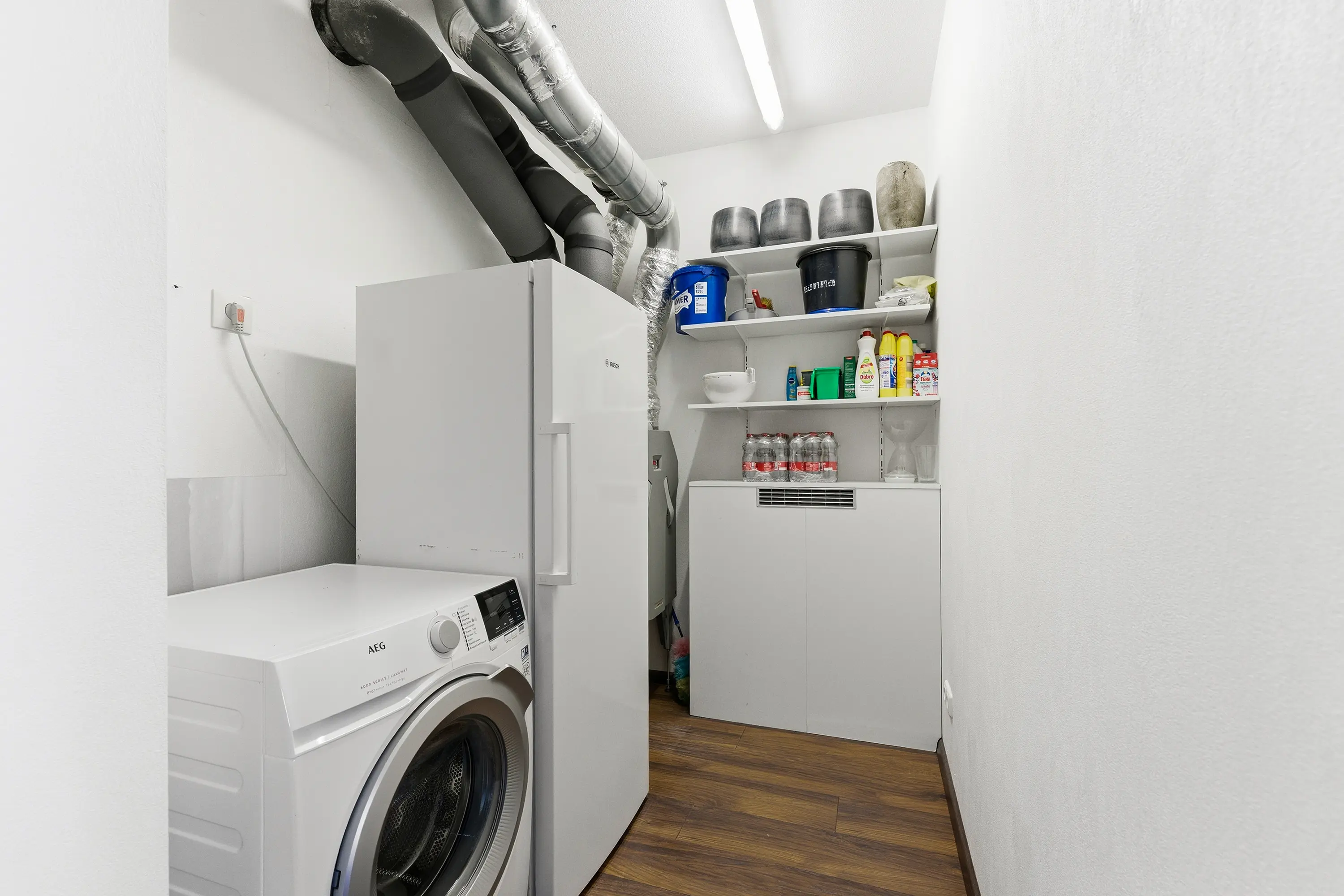 Bereikbaar vanuit de keuken. Hier vindt u de aansluiting voor wasmachine en droger, de unit van de WTW-installatie en voldoende bergruimte.