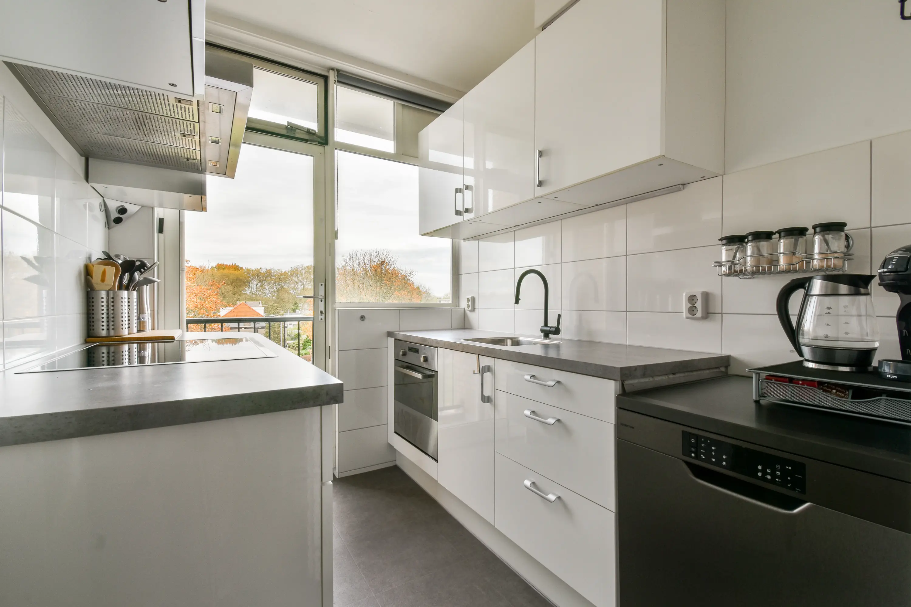 Moderne keuken, gelegen aan de voorzijde en uitgevoerd in een neutrale kleurstelling, geplaatst in een praktische opstelling aan twee zijden. Voorzien van diverse kasten, lades en inbouwapparatuur: inductiekookplaat, afzuigkap en een heteluchtoven. Vanuit de keuken heb je toegang tot het balkon aan de voorzijde.