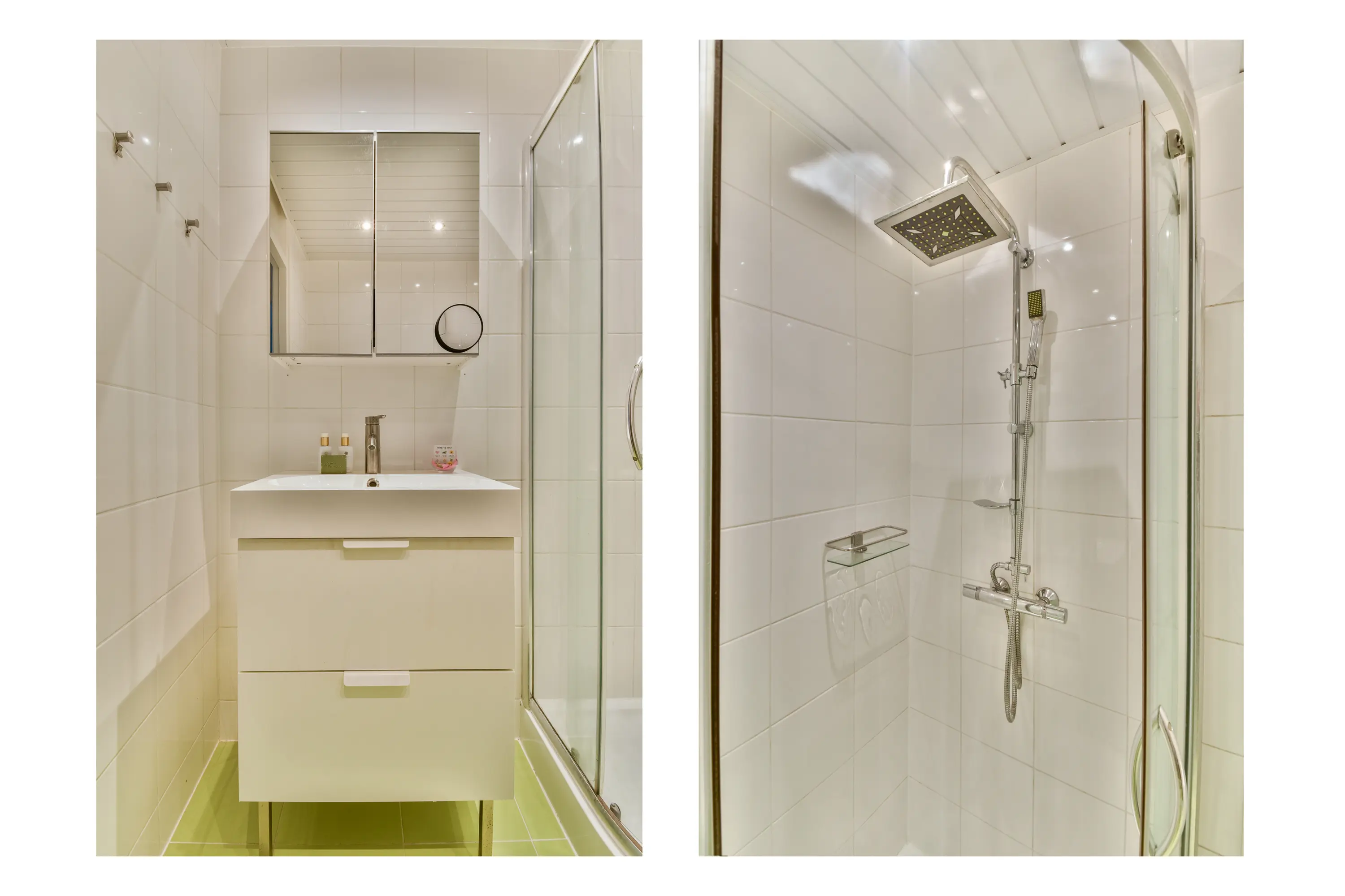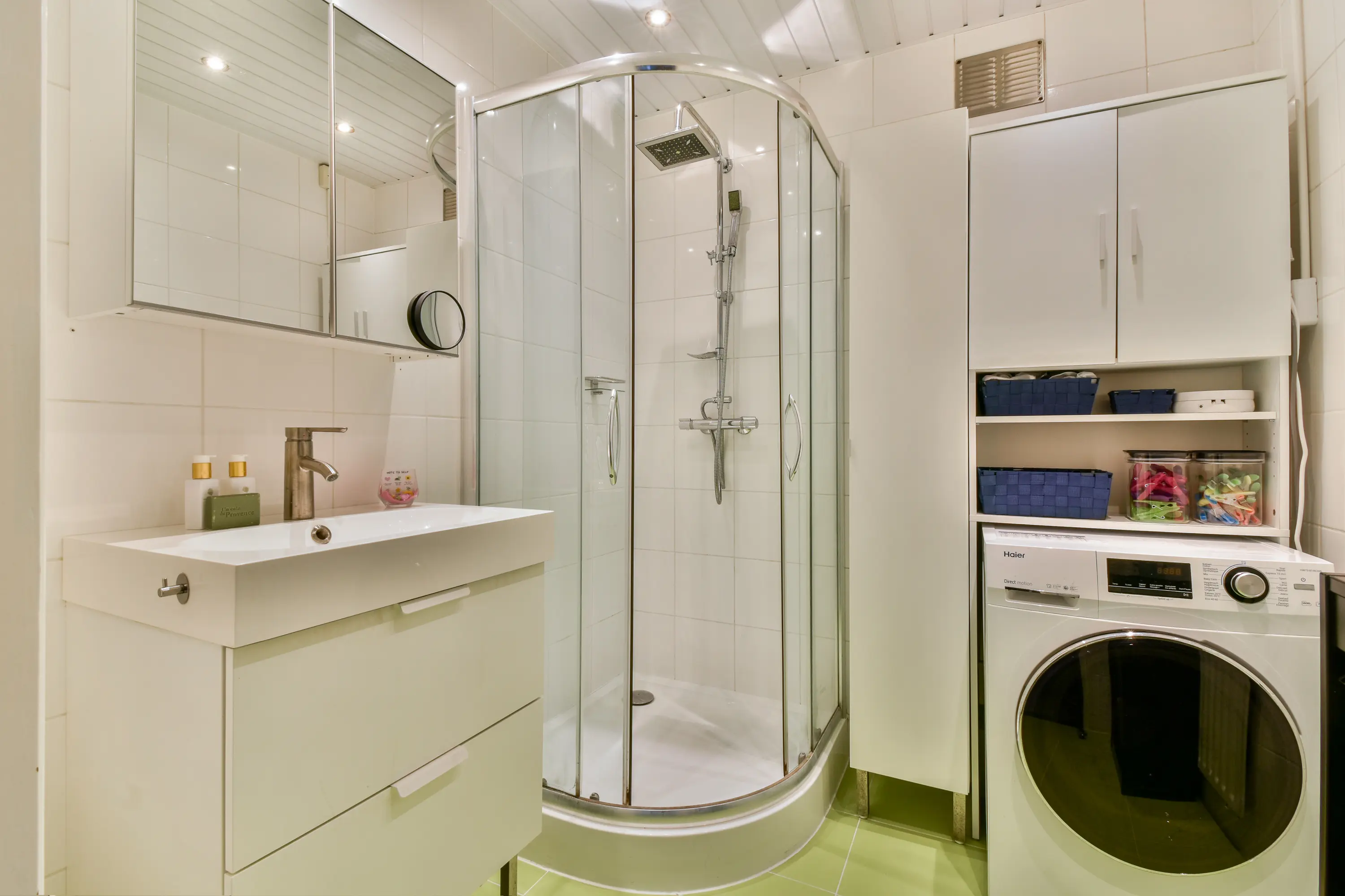 Volledig betegeld met eigentijdse wand- en vloertegels en ingericht met douchecabine, een wastafelmeubel en een aansluiting voor de wasmachine.