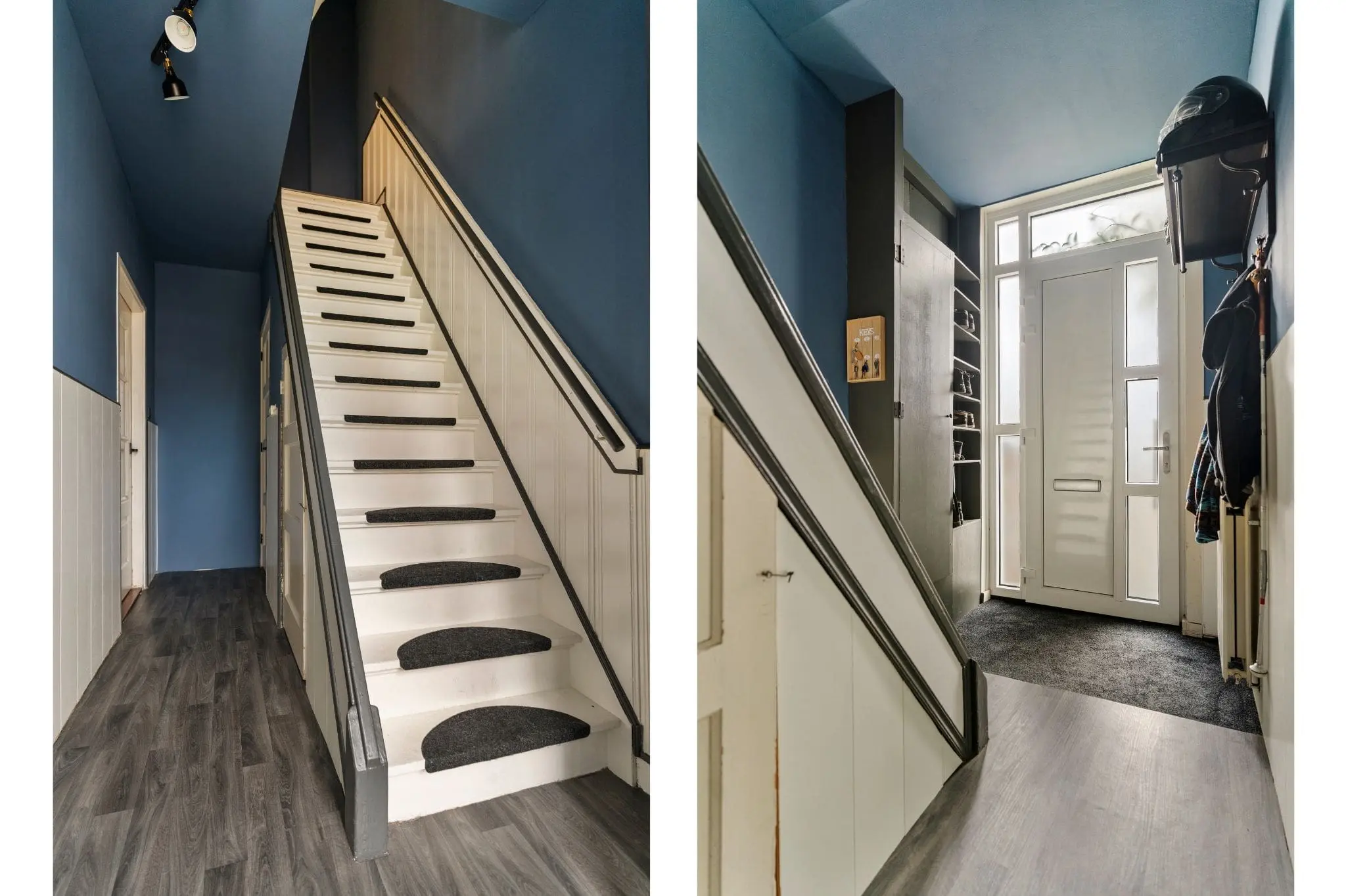 Entree in de hal met de meterkast (9 groepen + 2 aardlekschakelaars), de opgang naar de verdieping, toegang tot de toiletruimte en de woonkamer.