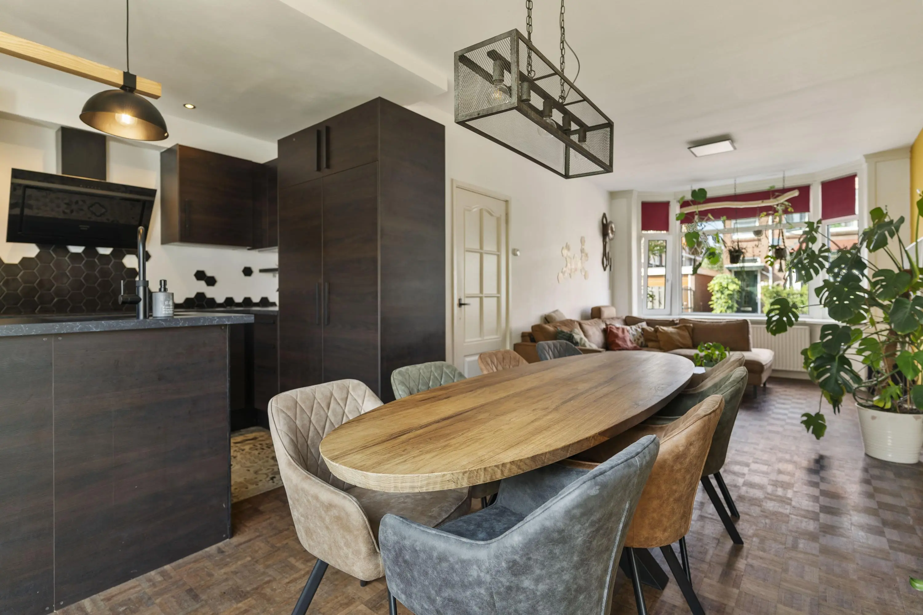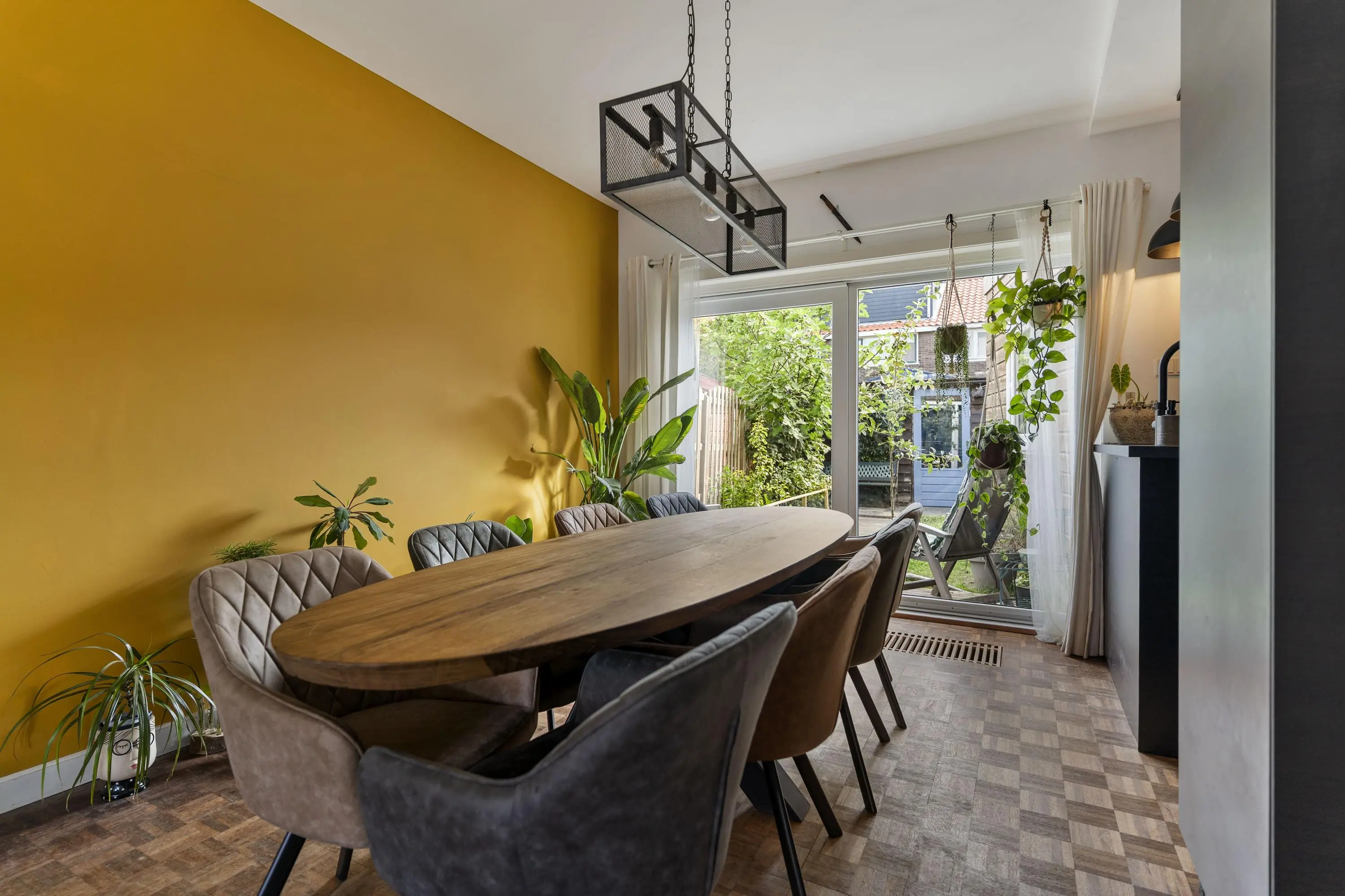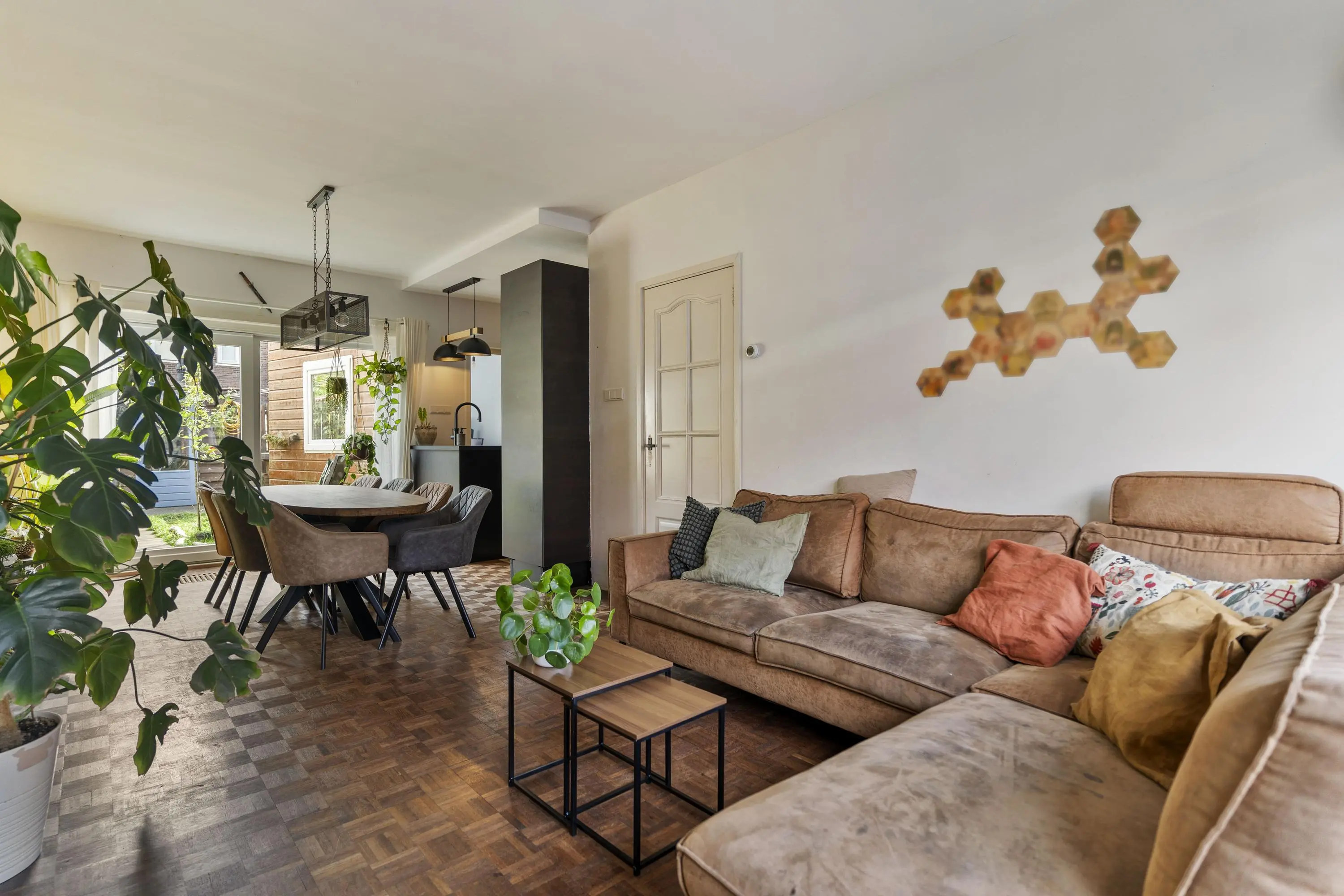 Gezellige en lichte woonkamer met een erker aan de voorzijde en een schuifpui aan de achterzijde, welke toegang biedt tot de tuin. De woonkamer staat in directe verbinding met de keuken.