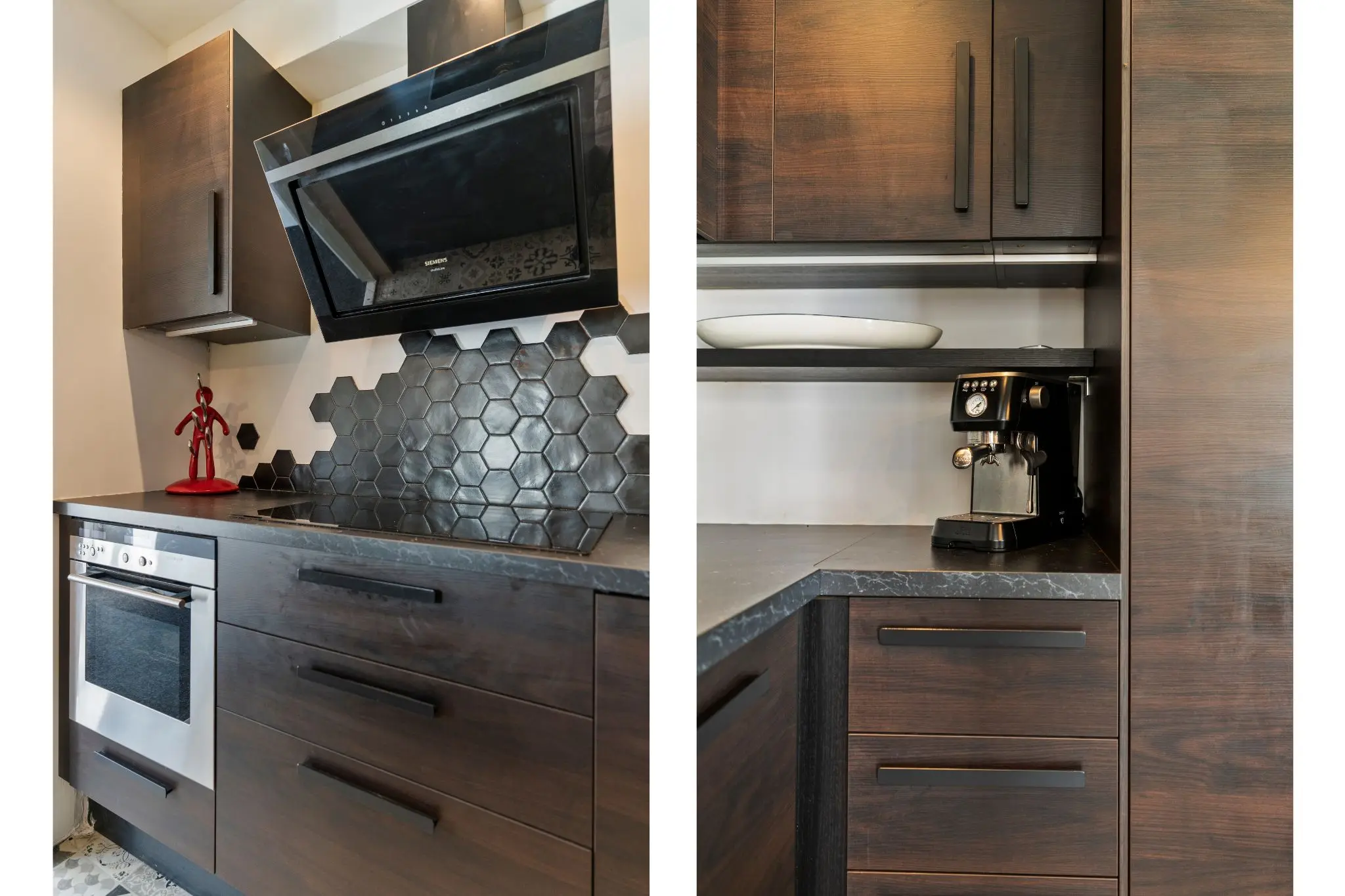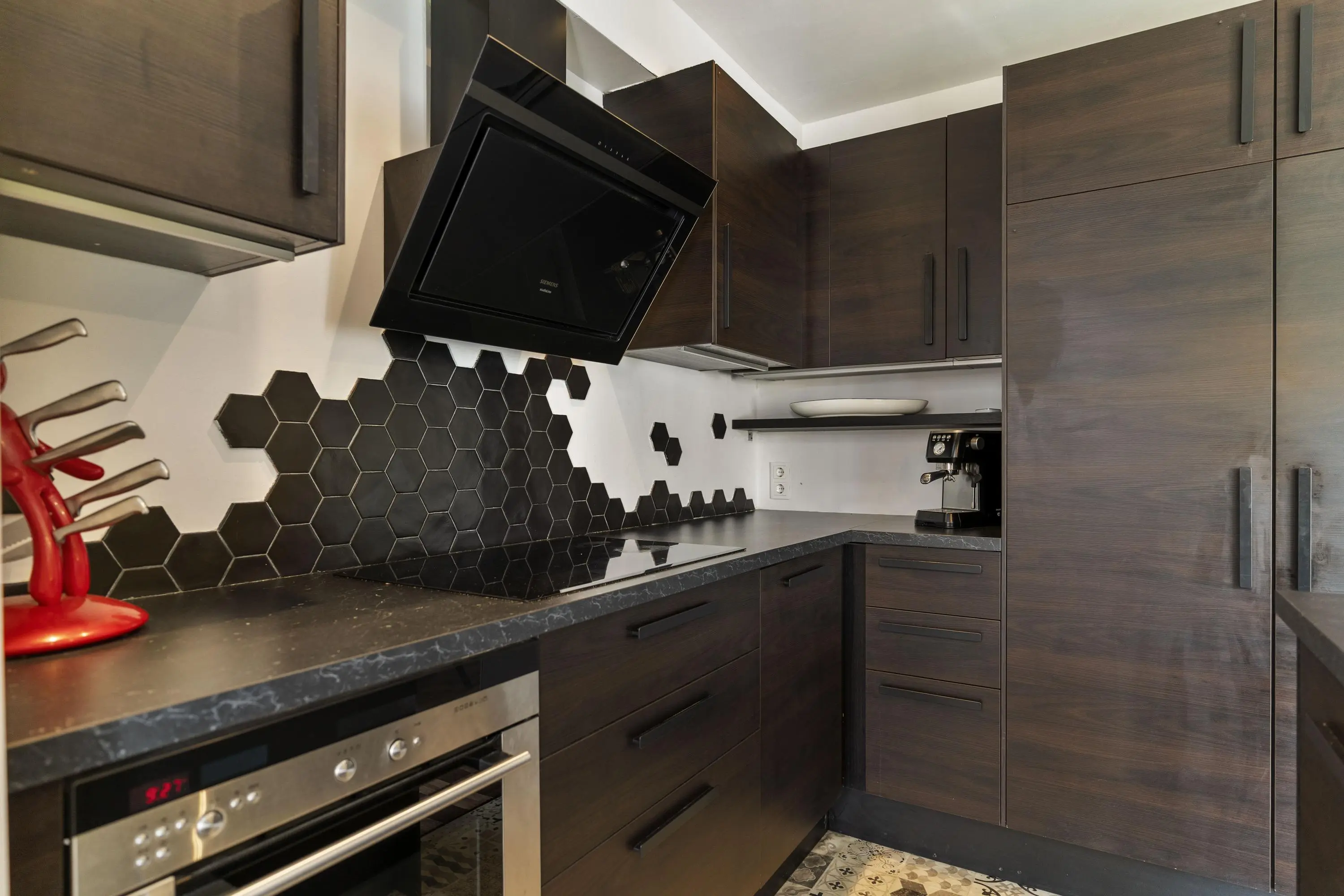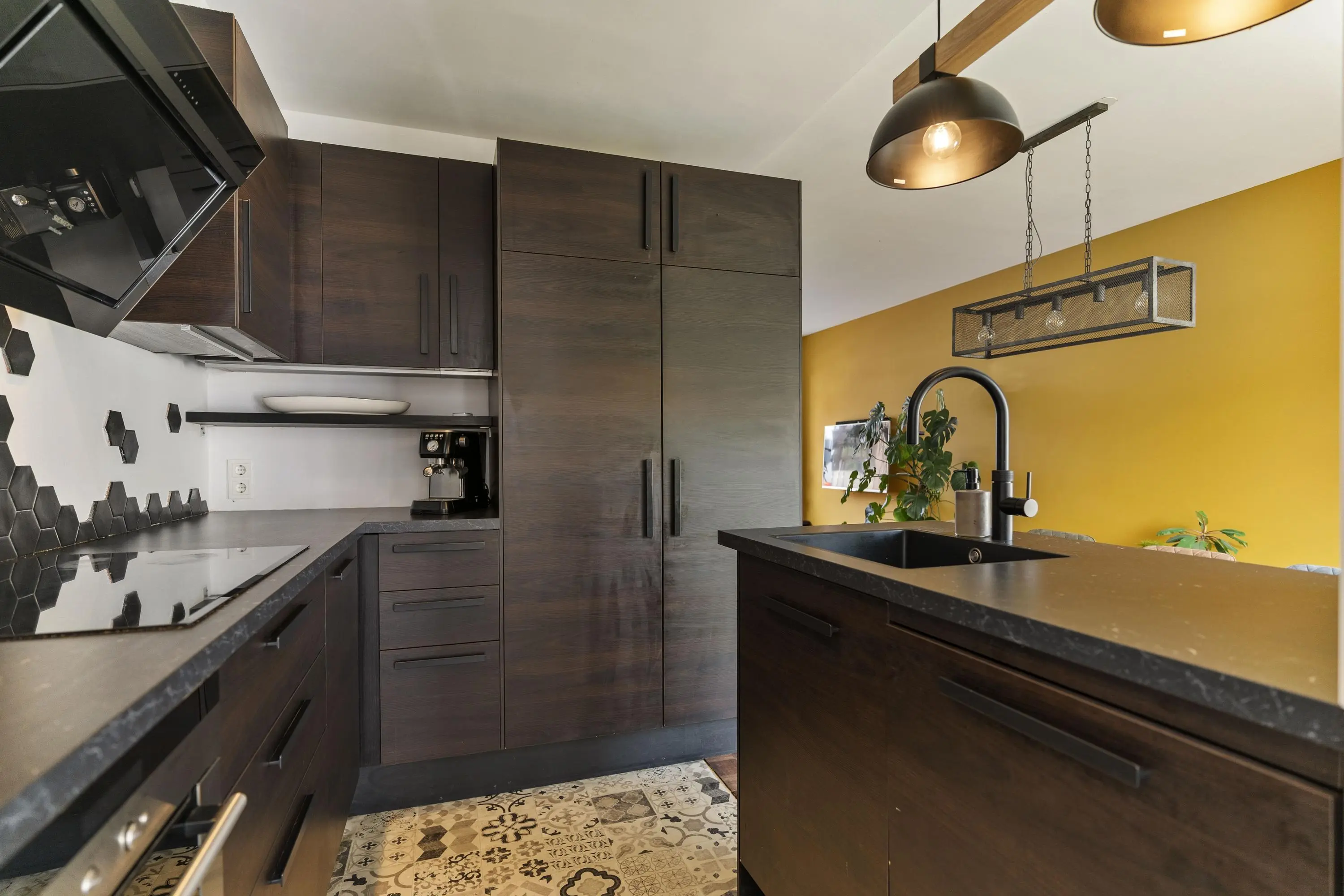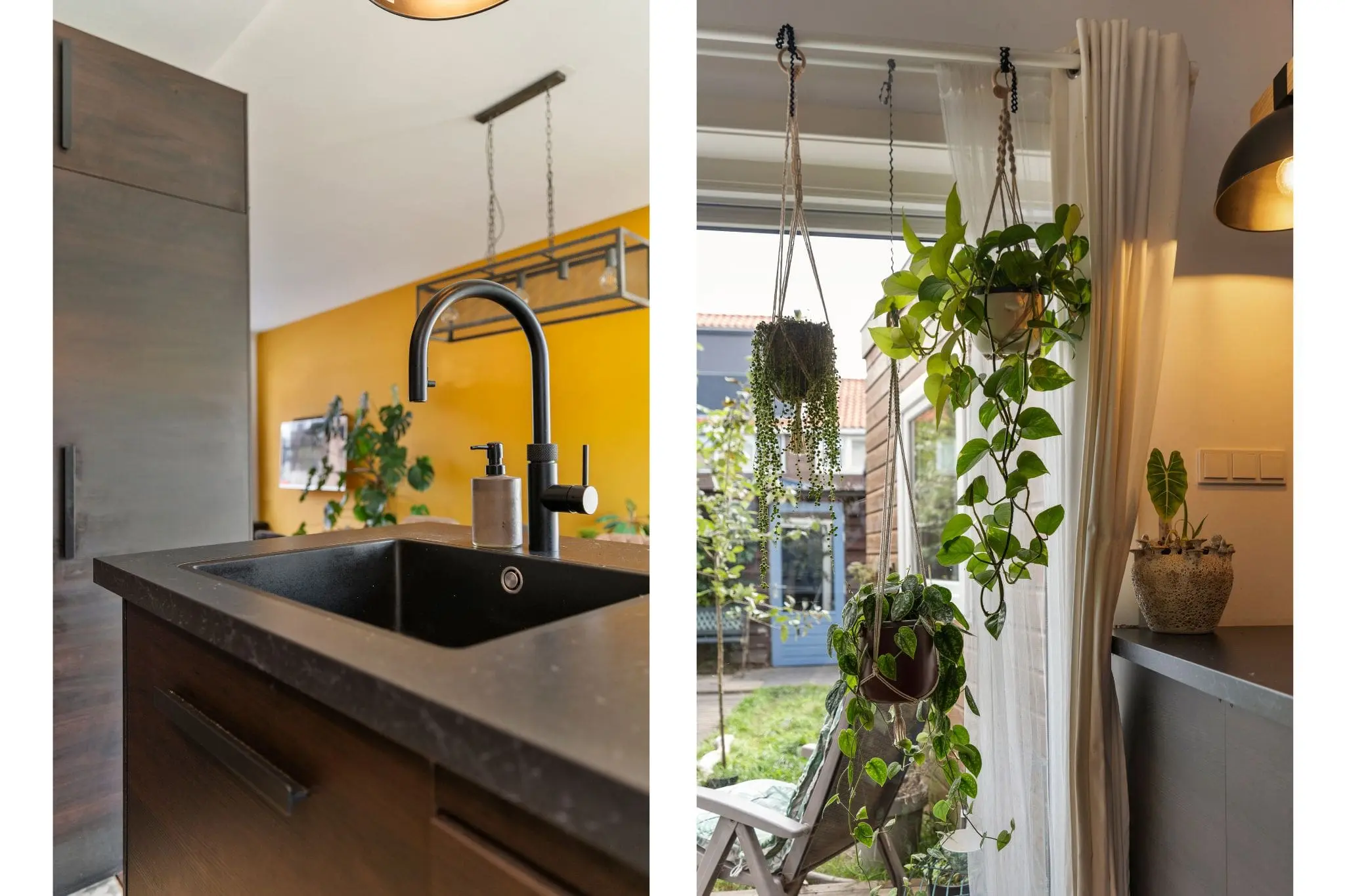 Moderne keukenopstelling geplaatst in een L-vorm, er zijn diverse kasten, laden en inbouwapparatuur; 5-pits gasstel, combimagnetron, koelkast, viezer, quooker, vaatwasser en een afzuigkap. Vanuit de keuken is er toegang tot een praktische bijkeuken met toegang tot de achtertuin.