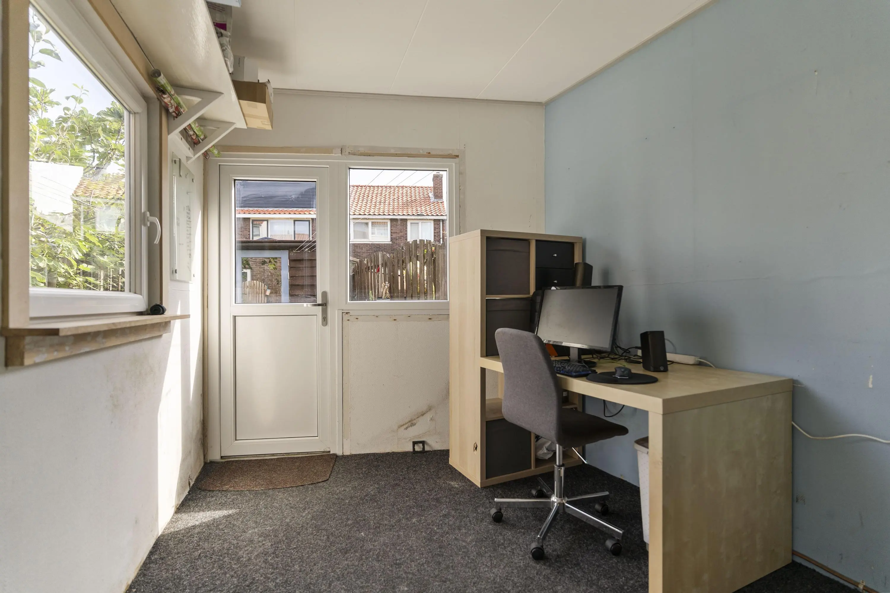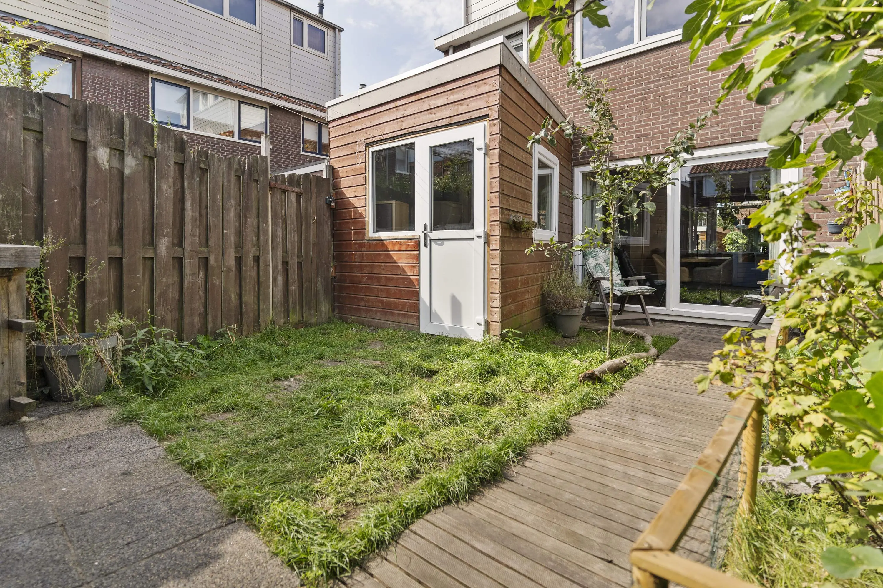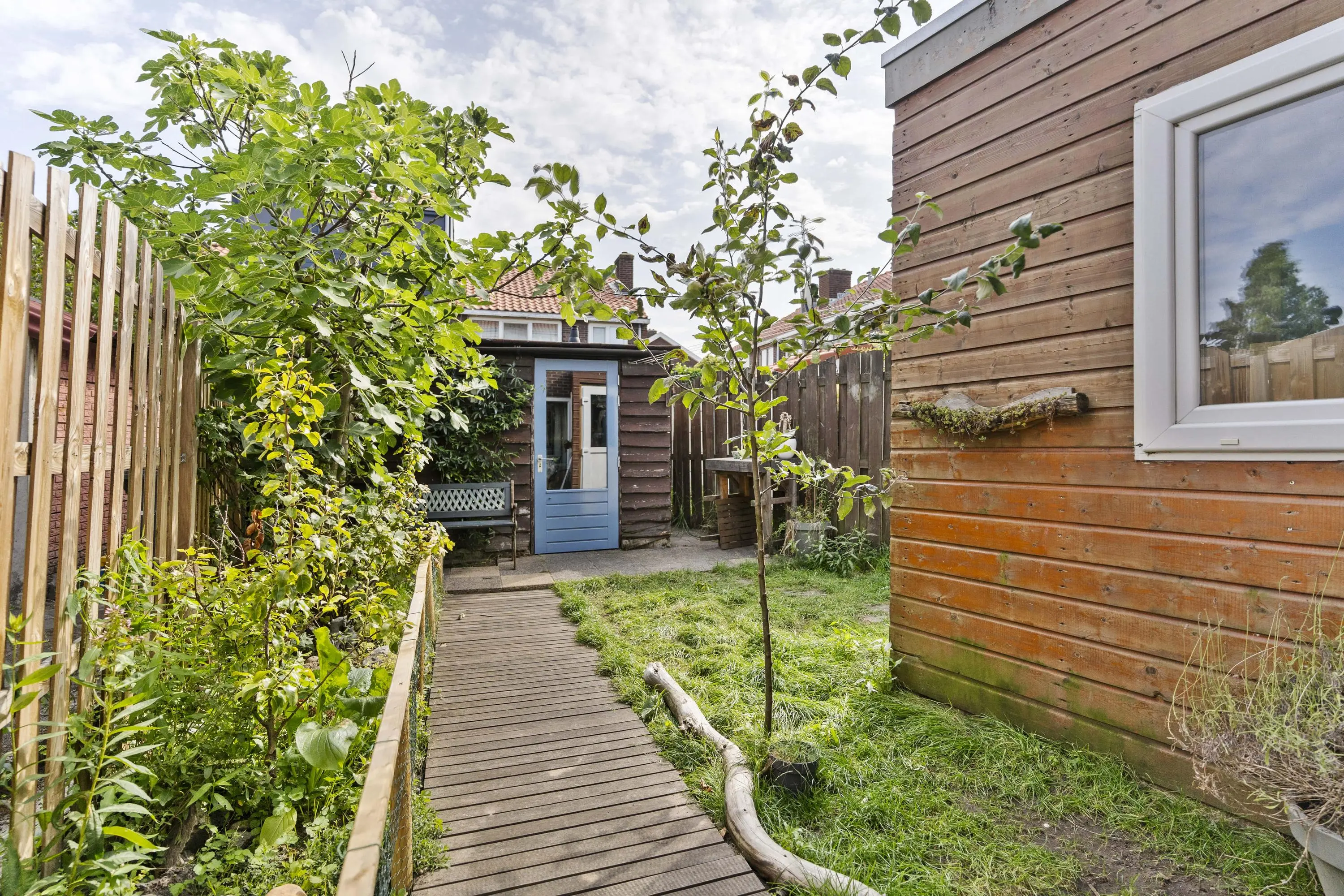 De achtertuin is gelegen op het Oosten. Achter in de tuin staat een houten schuur. Uiteraard is er een achterom aanwezig.