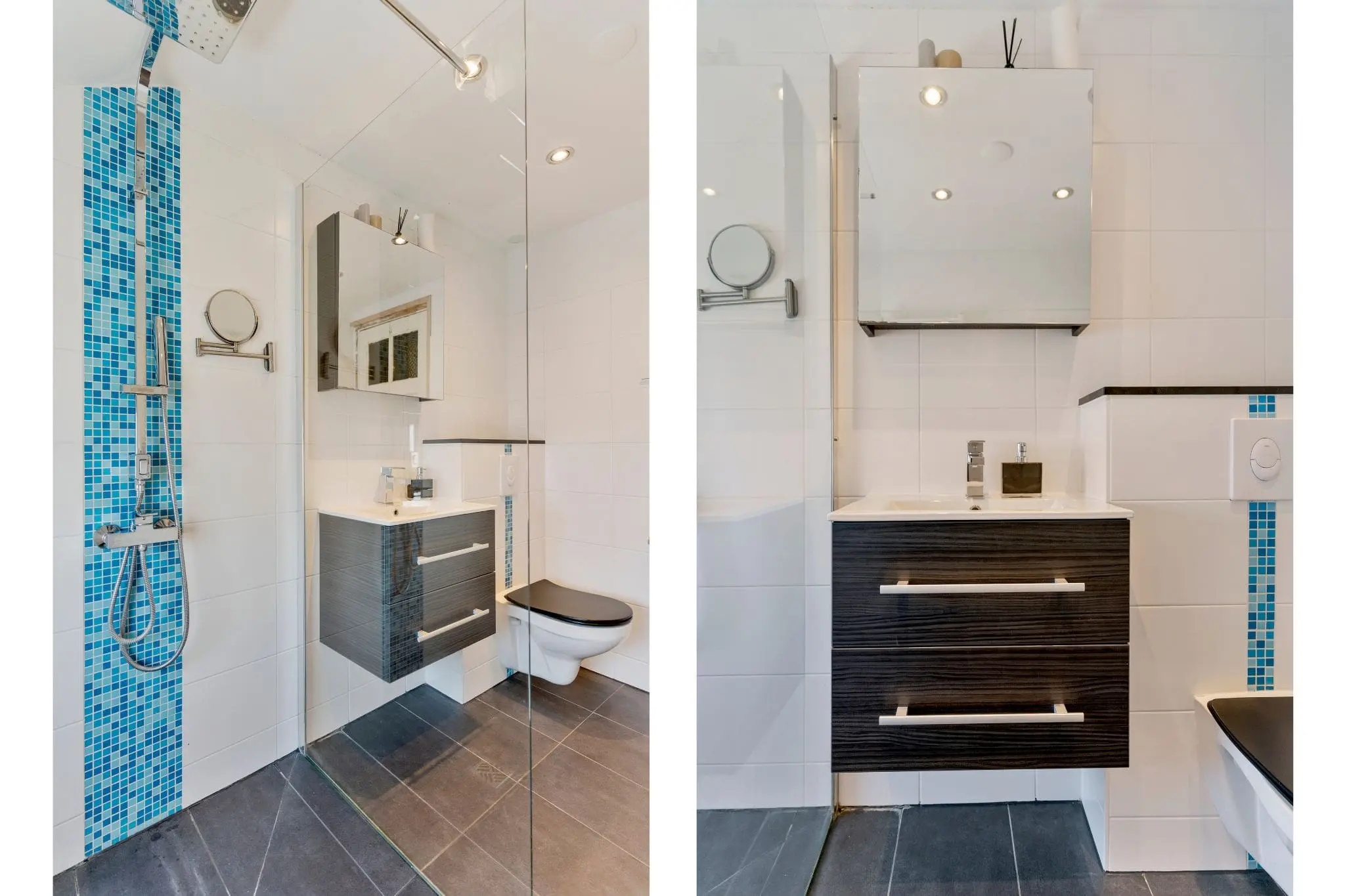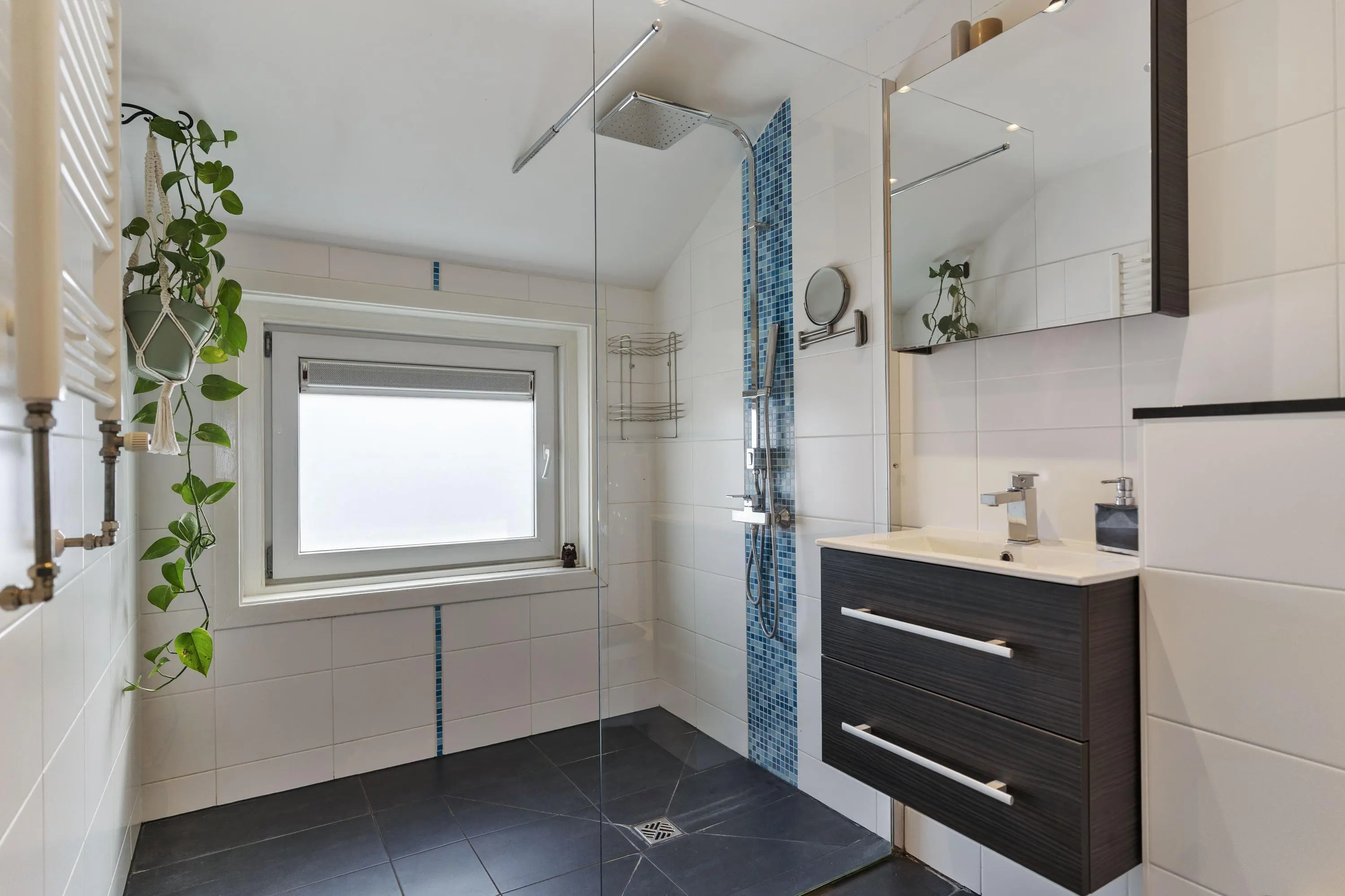 De badkamer is gesitueerd in een voormalige slaapkamer, waardoor het geheel ruim is opgezet en ingericht met een inloopdouche met een glazen douchewand, een wastafelmeubel en een wandcloset.