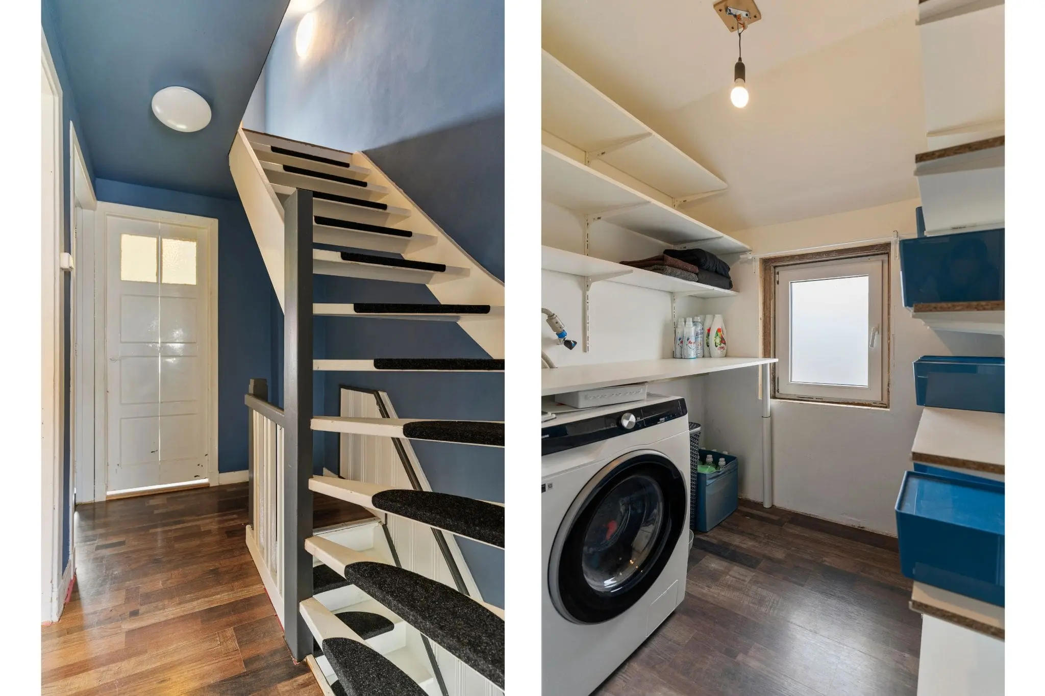 Overloop met de opgang naar verdieping 2, toegang tot 2 slaapkamers, de badkamer en de wasruimte.