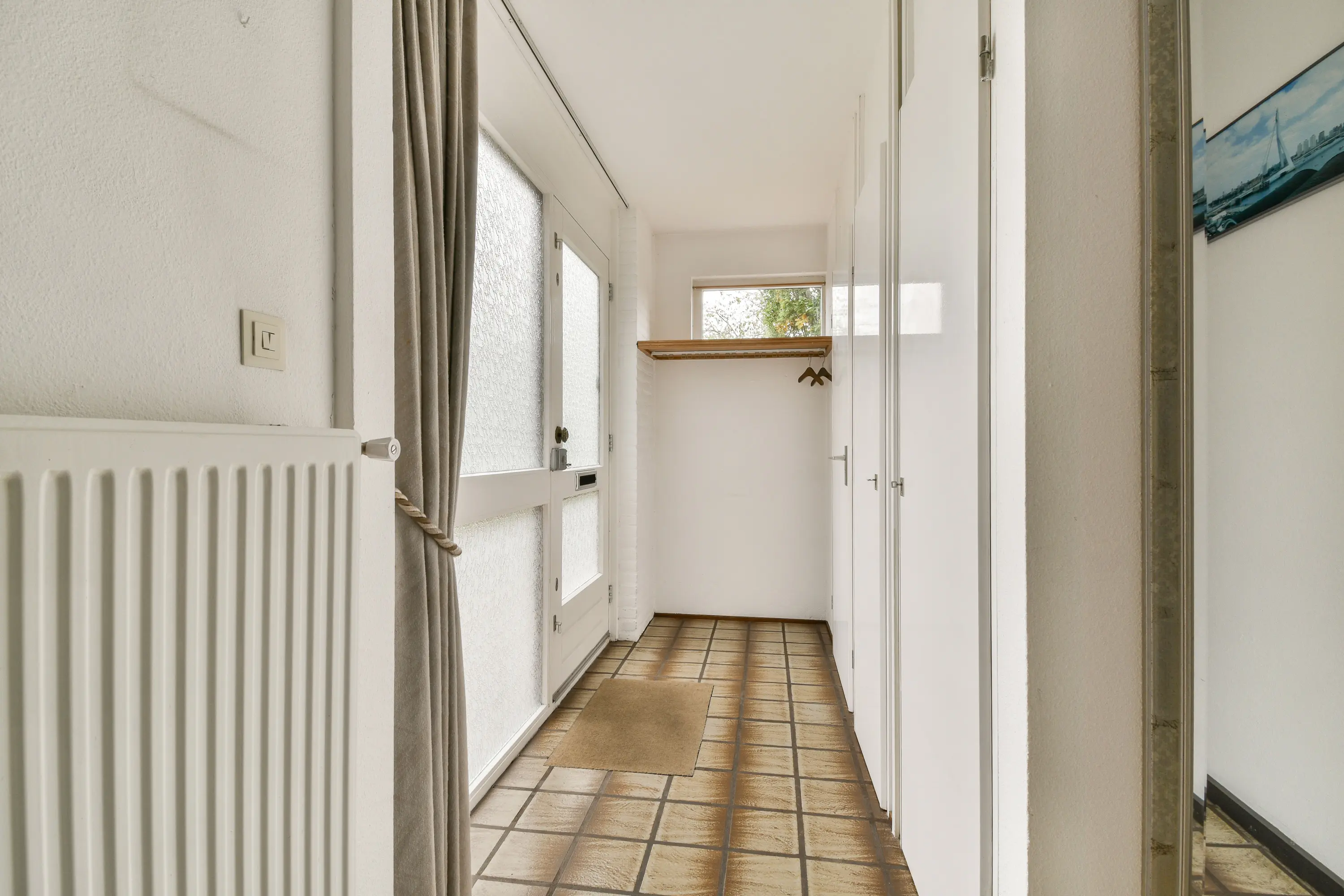Entree in de opvallend ruime hal met toegang tot de toiletruimte, een diepe bergkast met toegang tot een praktische bergruimte onder de schuine kap, de meterkast en de trapopgang naar de verdieping.