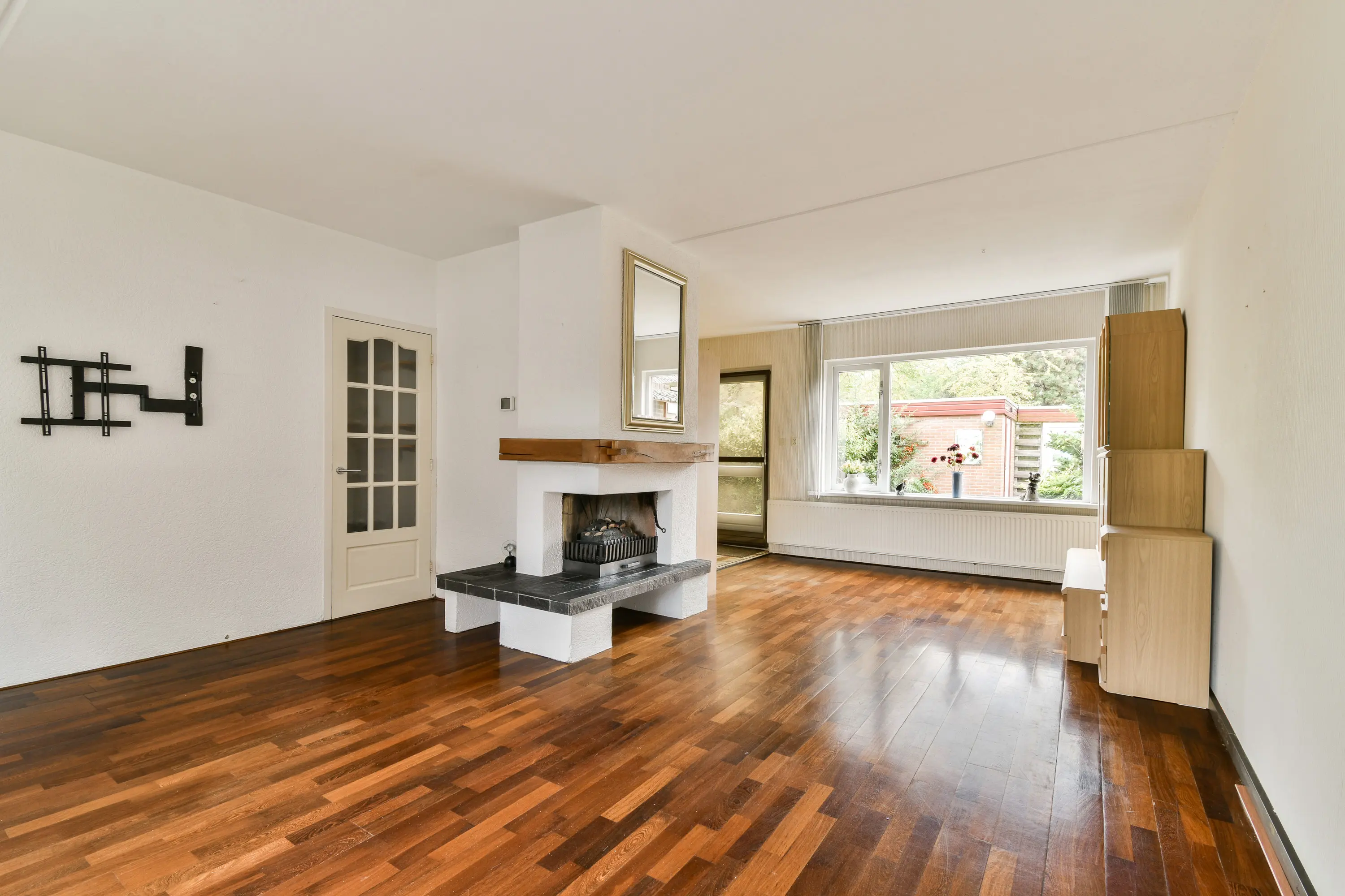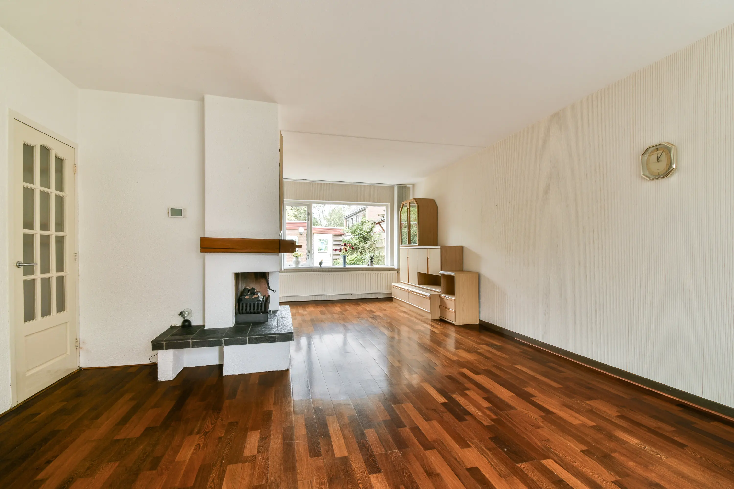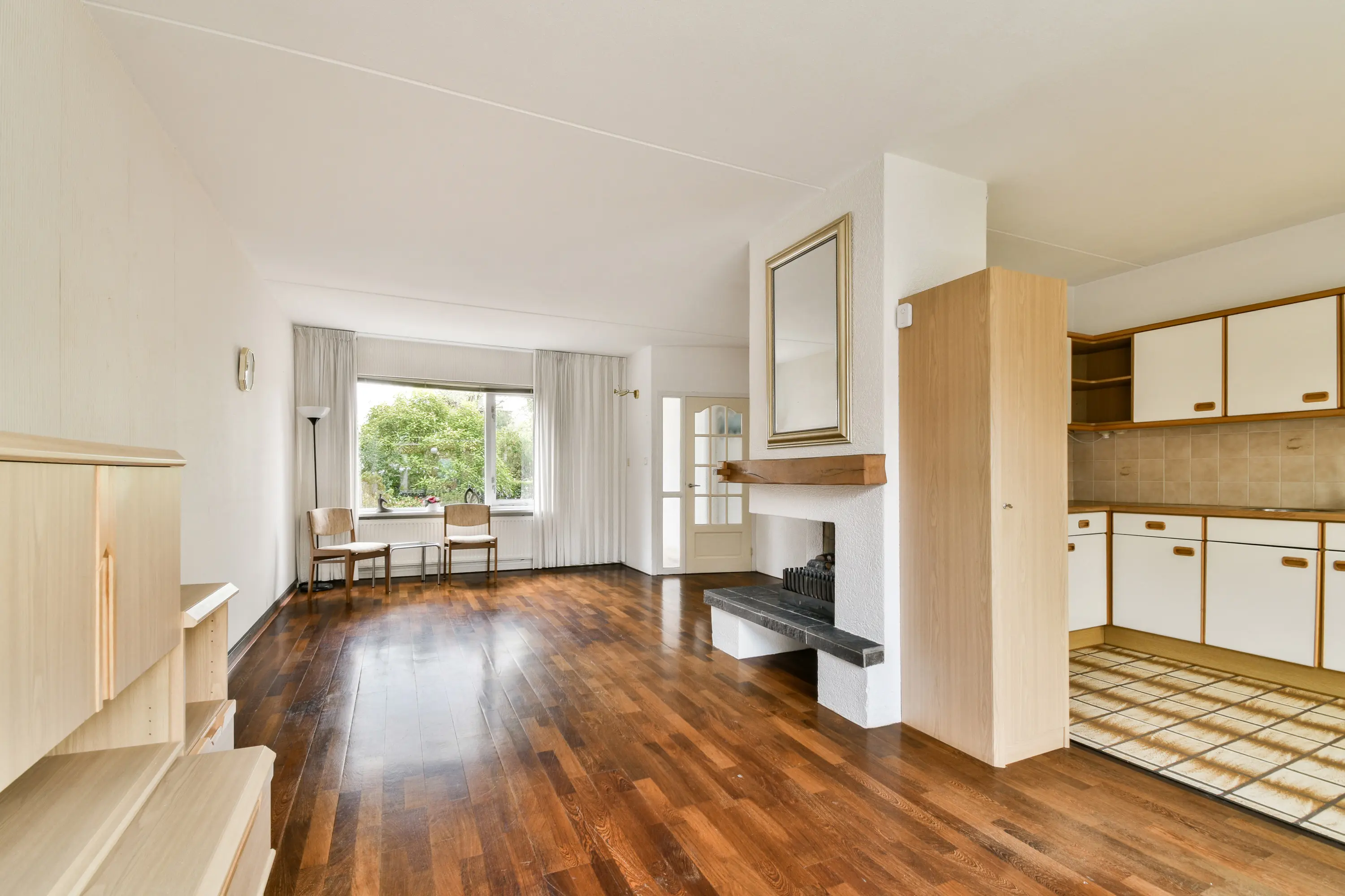 Ruime en sfeervolle woonkamer met veel lichtinval dankzij de grote ramen aan zowel de voor- als achterzijde. Aan de voorzijde bevindt zich het zitgedeelte, aan de achterzijde het eetgedeelte dat in open verbinding staat met de keuken. De open haard vormt het gezellige middelpunt van de ruimte en zorgt voor warmte en een extra sfeerdimensie.