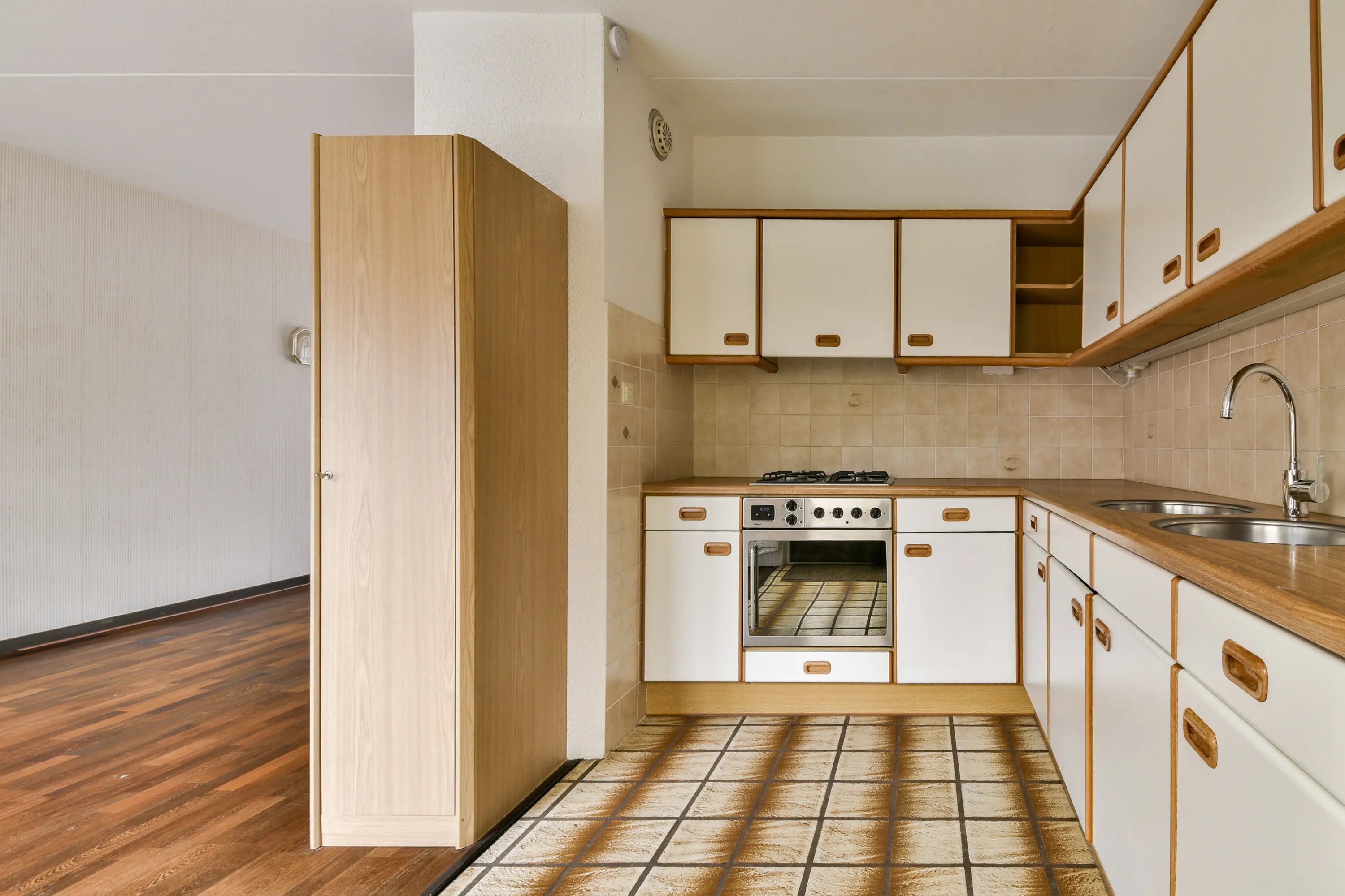 De open keuken is ruim van opzet en beschikt over diverse kasten, laden en inbouwapparatuur. Via de loopdeur is er directe toegang tot de achtertuin.