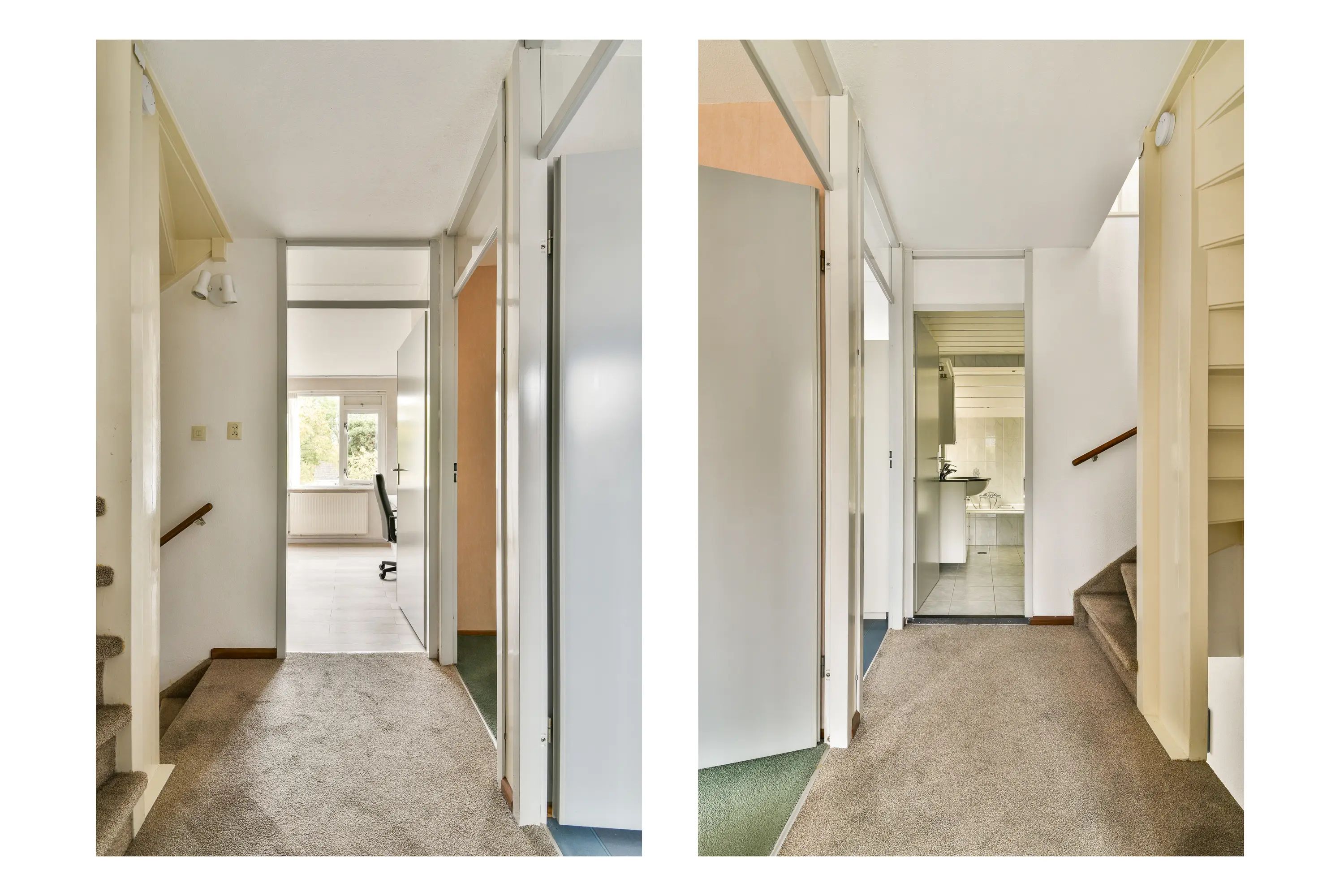 Overloop met toegang tot drie volwaardige slaapkamers en de trapopgang naar de tweede verdieping.